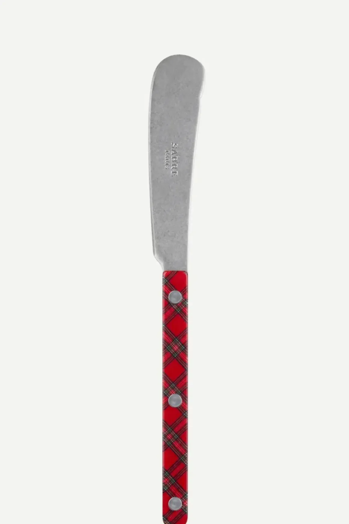 Vakkert fransk bestikk fra Sabre, inspirert av det livlige gatelivet og de sjarmerende restaurantene og caféene i Paris. Bestikket kombinerer moderne design med en nostalgisk vintagefølelse, der enkle detaljer som synlige nagler lar farger og materialer komme til sin rett. Bistrot-serien finnes i mange varianter, og hos Bolina har vi et komplett utvalg av teak-varianten sammen med et bredt utvalg smørkniver. Denne smørkniven med tartanmønster tilfører en landlig sjarm til urbane middager, med dype nyanser av granatrødt og grangrønt.