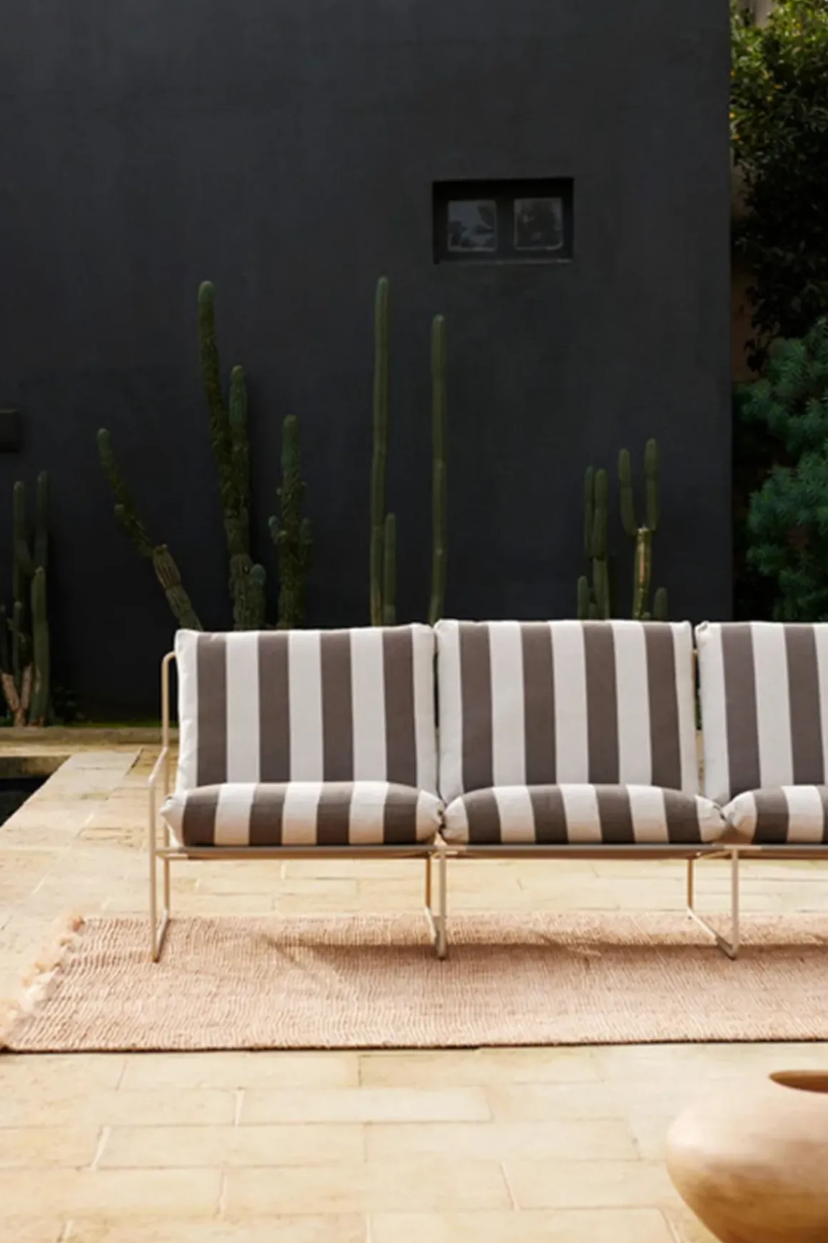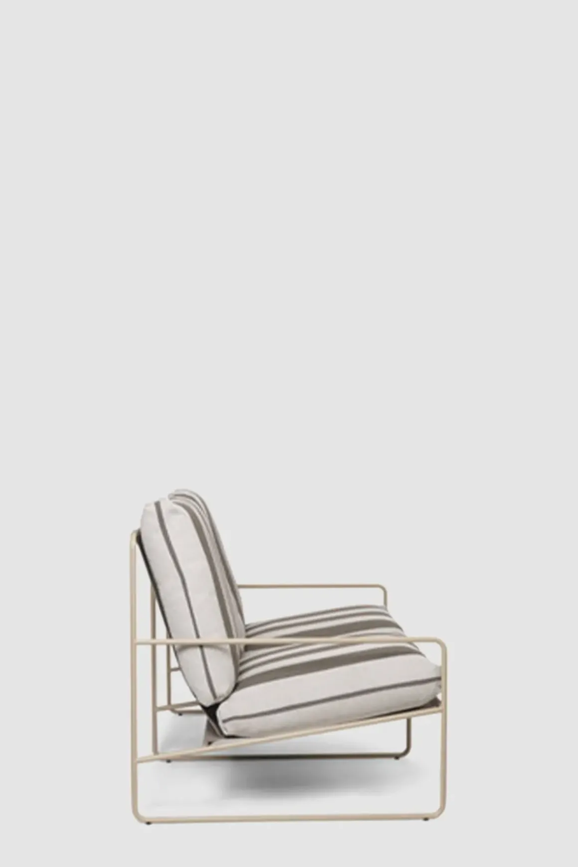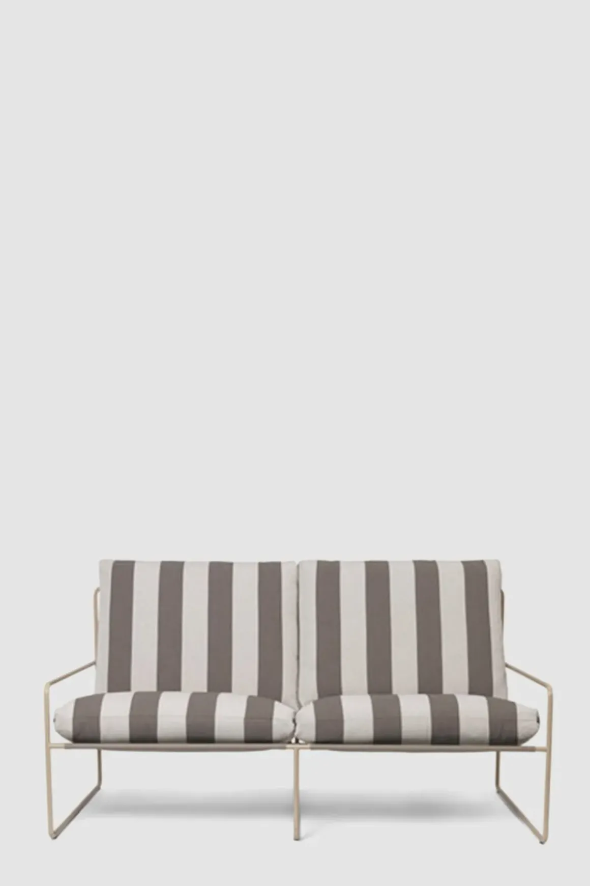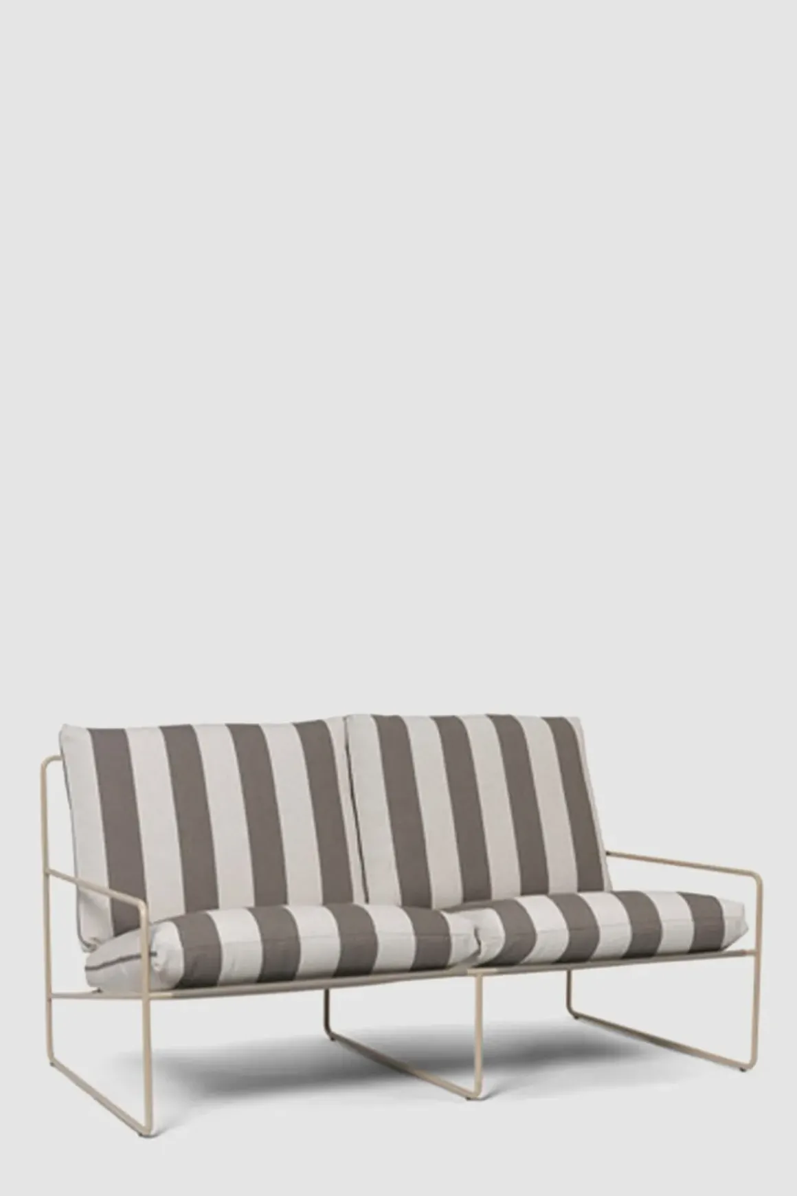 klassisk profil fra Ferm Living. Vår og sommer betyr avslapning og kvalitetstid tilbrakt utendørs. Skap et innbydende salongområde med Desert Sofa, hvor det er god plass til å sole seg, lese bøker og underholde venner og familie. Med det uforutsigbare været i tankene, er Desert Sofa designet for utendørs bruk og er komplettert med koselige sofaputer som er både vann- og UV-bestandige. Sofaen kommer i et stripet trekk med beige ramme. Stilfull, minimalistisk og komfortabel.
