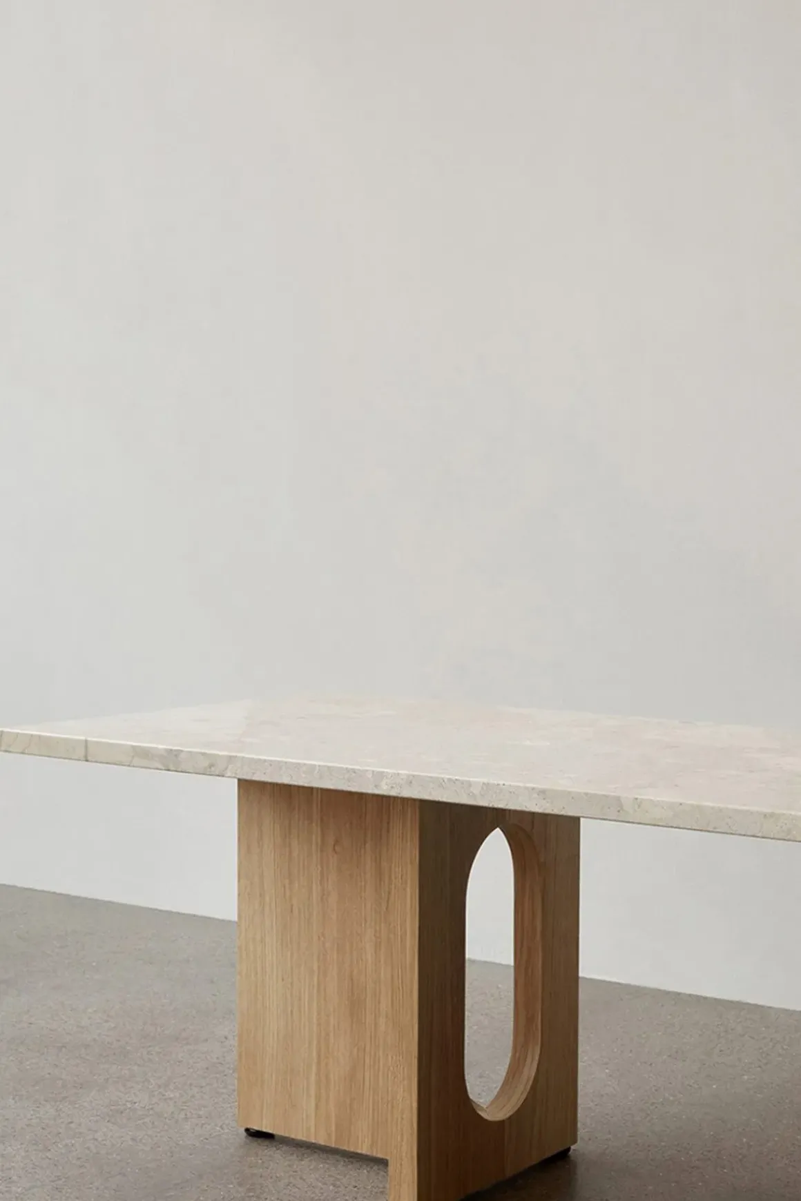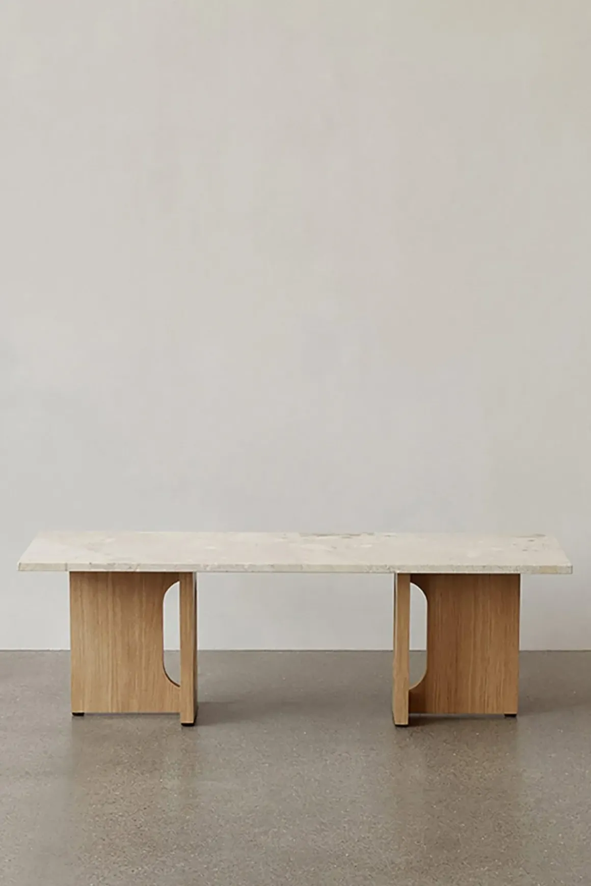 Androgyne Lounge stuebord, designet av den norske arkitekten og designeren Danielle Siggerud. Dette bordet ligger perfekt balansert mellom det maskuline og det feminine; det myke, naturlige treverket og de runde utskjæringene, mot den harde, firkantete bordplaten i delikat sandfarget Kunis Breccia-stein. Androgyne-serien inneholder møbler med enkle silhuetter laget av raffinerte materialer som varer. Bruk Androgyne Lounge som stuebord, som en benk med bunker av bøker eller en unik skulptur. Bordet har et varig og moderne design som du vil elske i årevis.