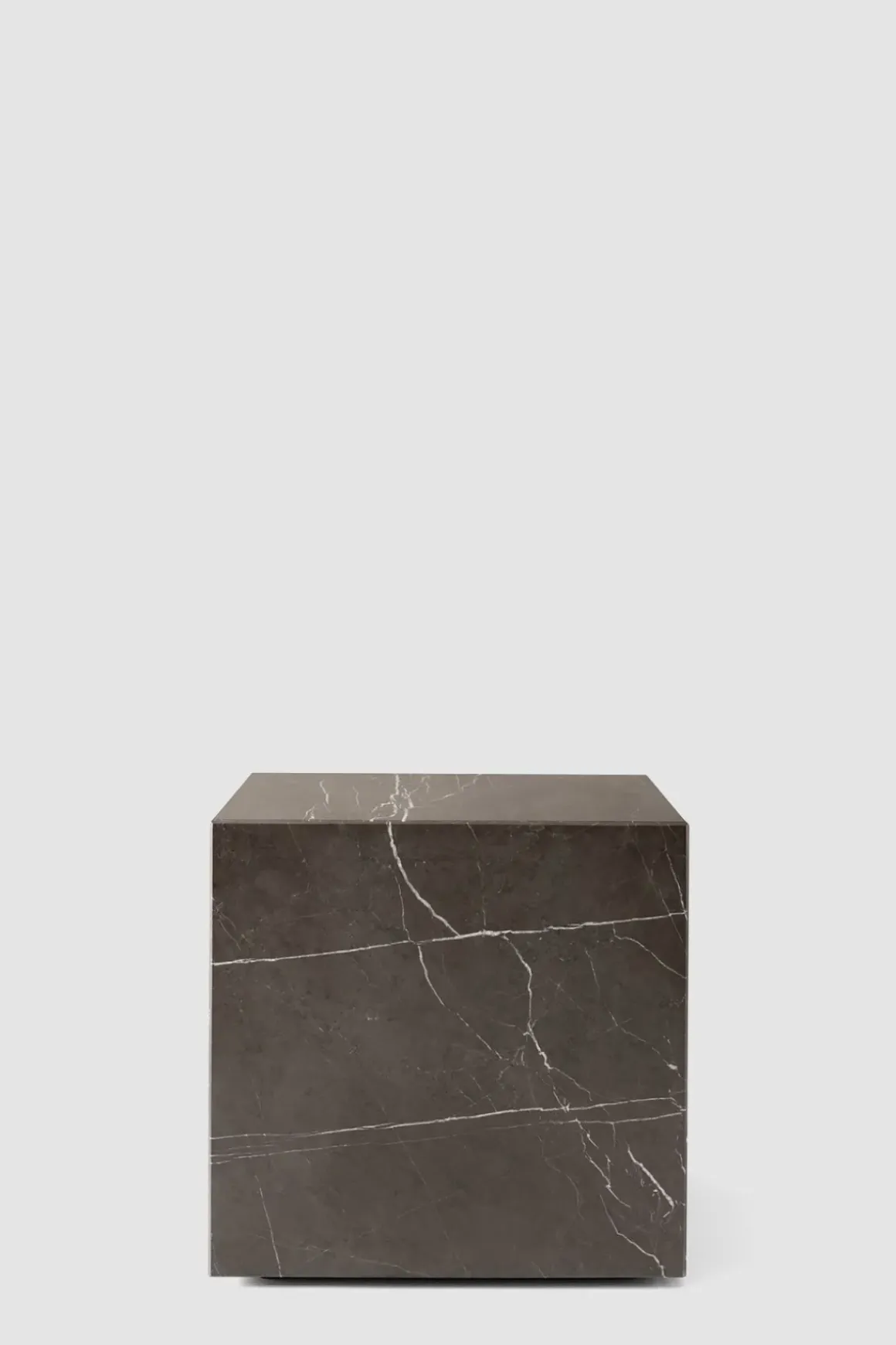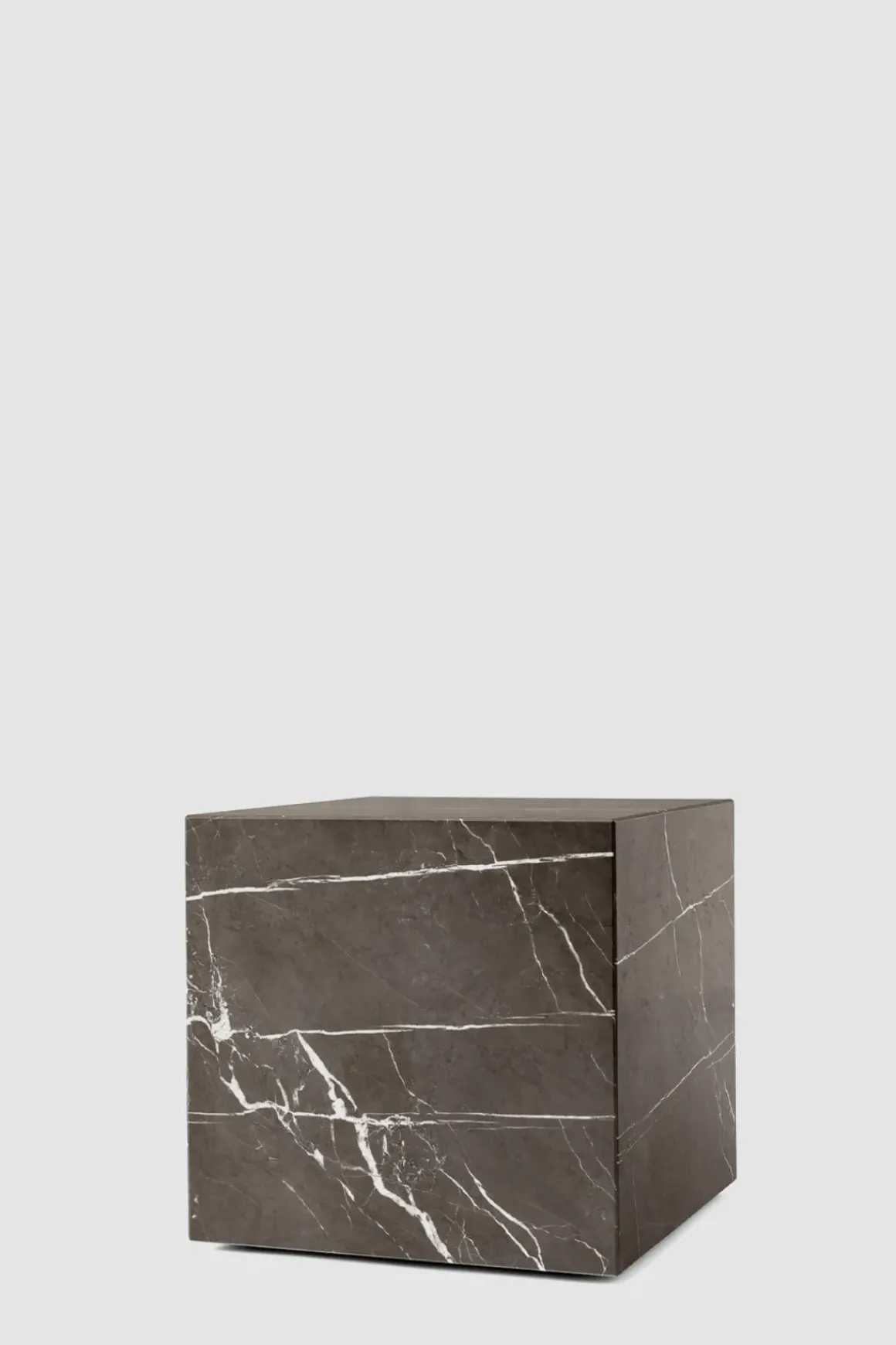 Plinth Cubic sidebord i brun og grå Kendzo marmor. Allsidig og tidløst bord håndlaget i en liten fabrikk i Portugal. Bordet har en lav sokkel som gjør at det nesten ser ut som om det svever over gulvet. Plinth har også fire små ben som kan justeres i underkant av en cm i høyden. Bena synes ikke da de er satt fire cm inn fra kanten. Den kubistiske formen er svært raffinert, myk og skulpturell. Til tross for at bordet er monumentalt har det et lett og luftig ytre. Hver marmordel er nøye utvalgt og montert for hånd for å sikre at sidene blir satt sammen perfekt. Resultatet er at dette vakre bordet er konsistent i form og kvalitet, samtidig unikt i marmormønsteret. Designet av Norm Architects. Plinth kommer i flere størrelser og i ulike typer marmor.