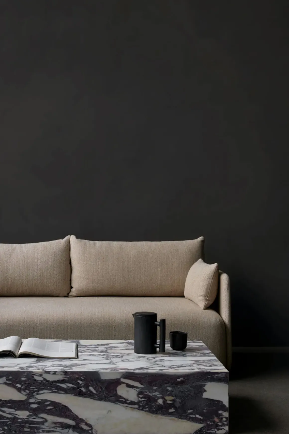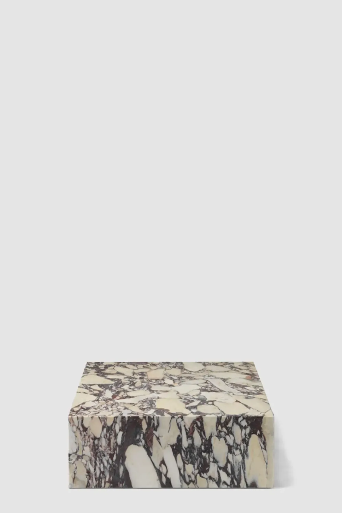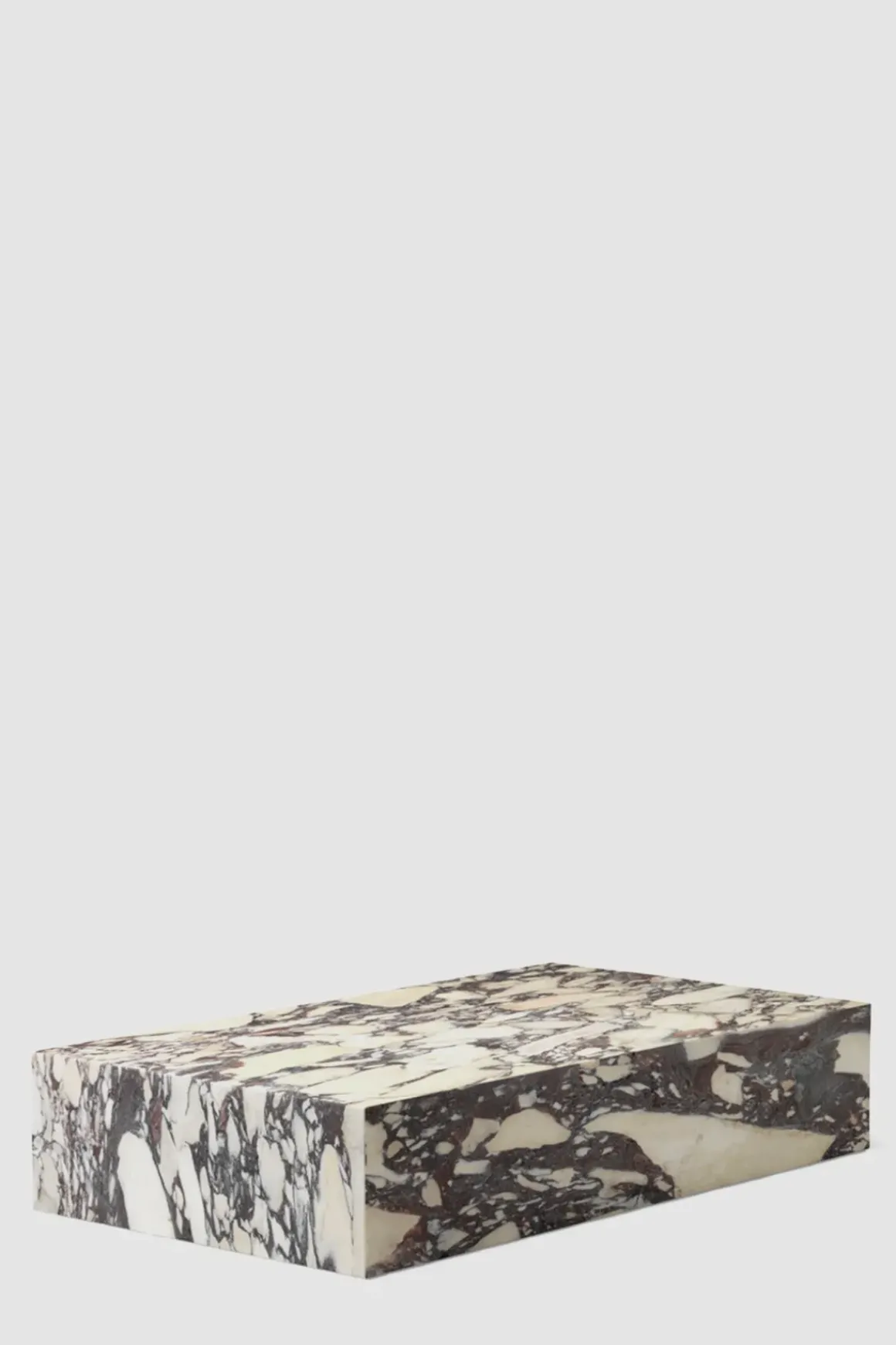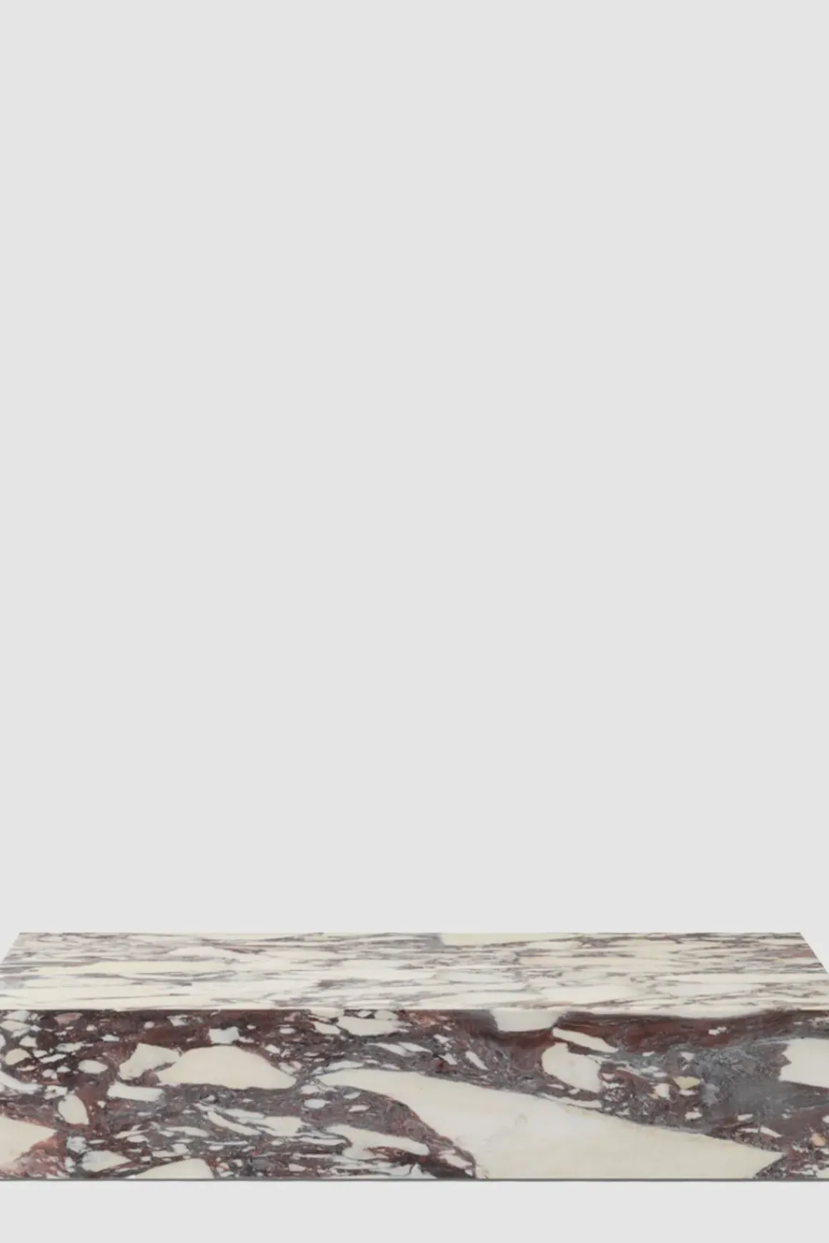 Plinth Grand sofabord er en supersized versjon av det klassiske Plinth Low-bordet. Laget i Calacatta Viola marmor med en dyplilla farge som bukter seg rundt basen i unike formasjoner, og gir et organisk, særegent uttrykk til hvert bord. Bordet er formet til et perfekt balansert rektangel, og er et allsidig og multifunksjonelt sofabord håndlaget i en liten fabrikk i Portugal. Bordet har en lav sokkel som gjør at det nesten ser ut som om det svever over gulvet. Plinth har også fire små ben som kan justeres i underkant av en cm i høyden. Bena synes ikke da de er satt fire cm inn fra kanten. Plinth tilbys i fire marmortyper med unike årringer i tillegg til Kunis Breccia-stein. Designet egner seg til en rekke bruksområder og rom. Plint Grand er ideell som både sofabord eller utstillingsbord for dekorative gjenstander. Det er også et skulpturelt objekt i seg selv, som løfter et rom med sin sofistikerte og lysreflekterende finish.