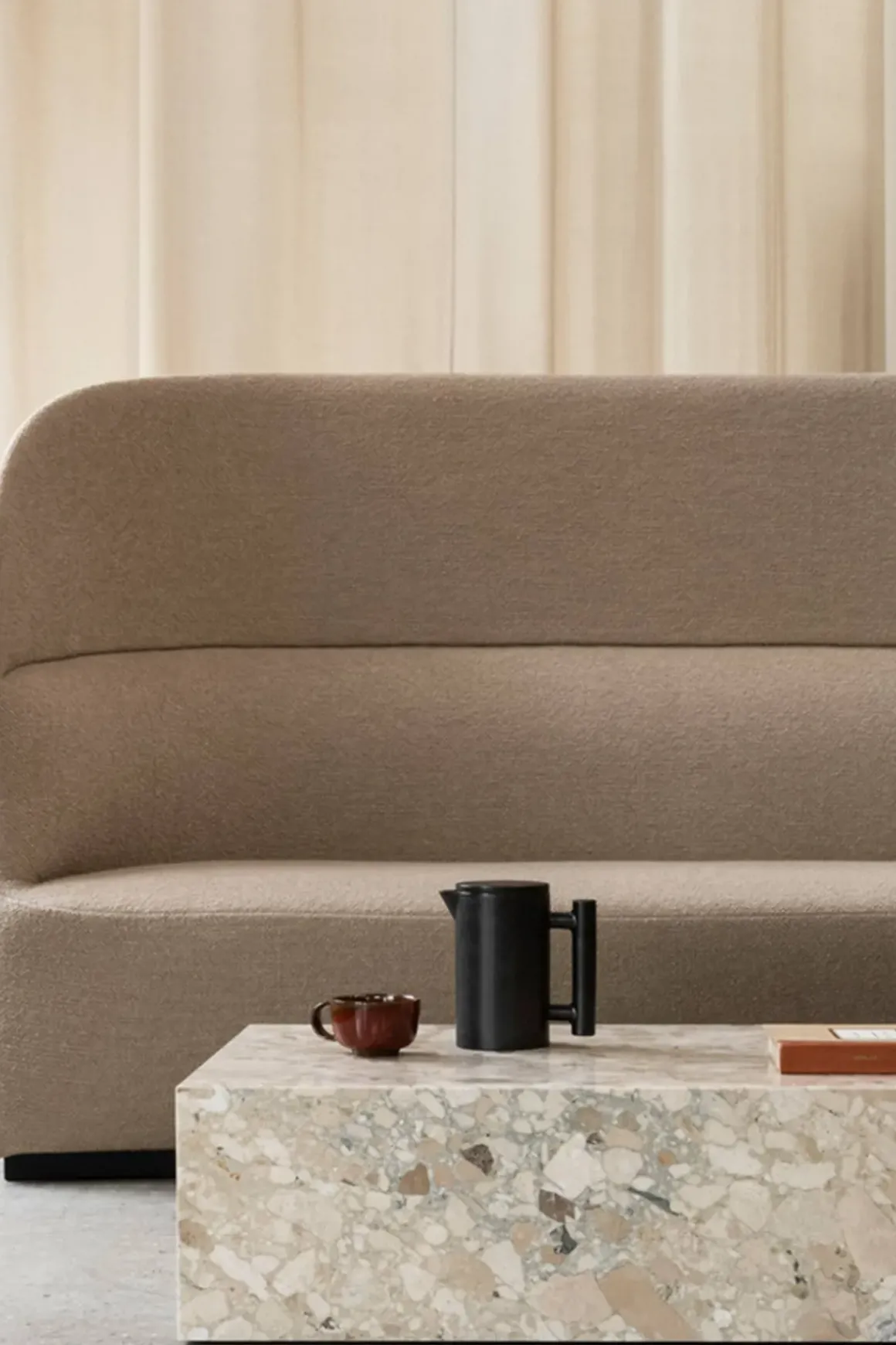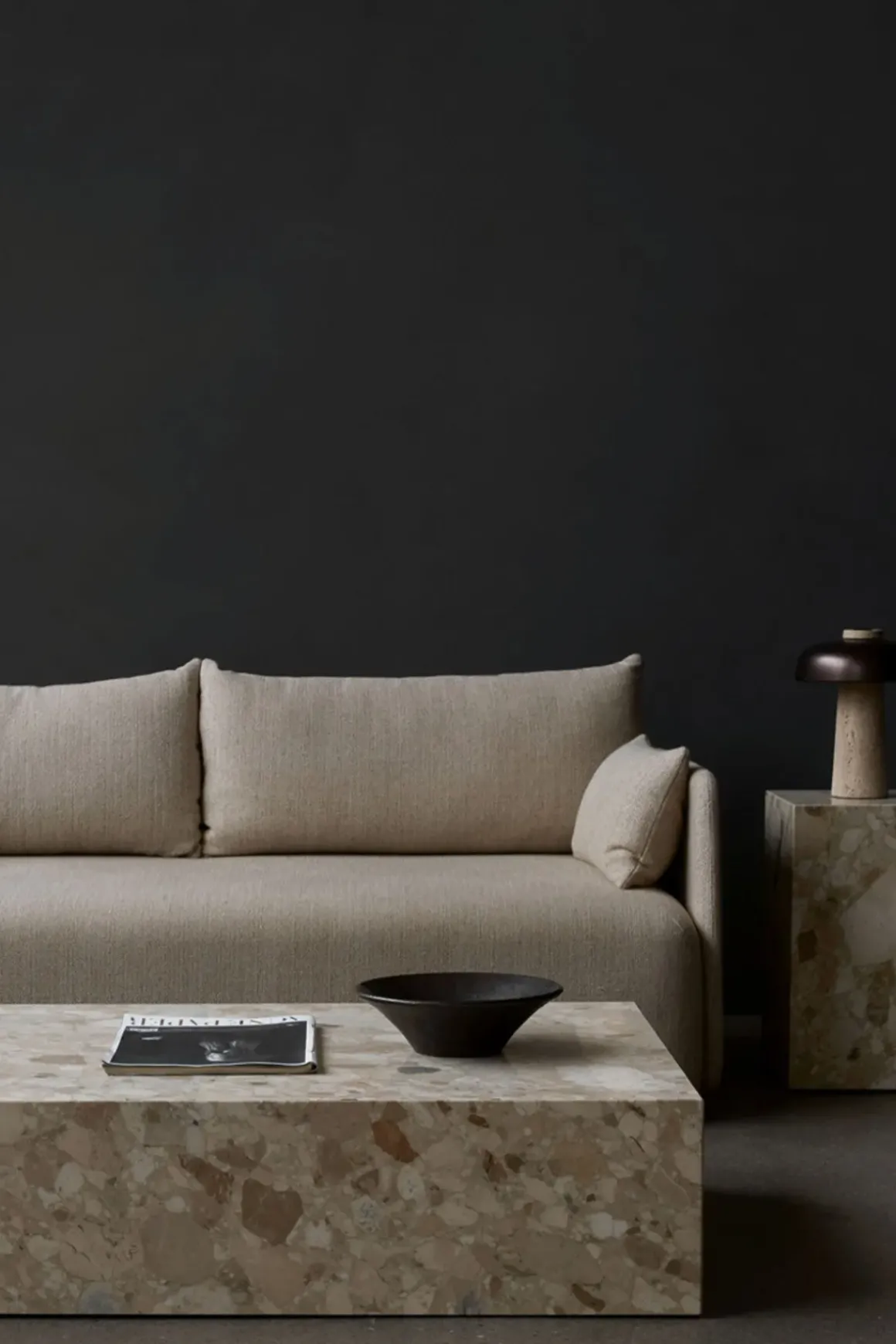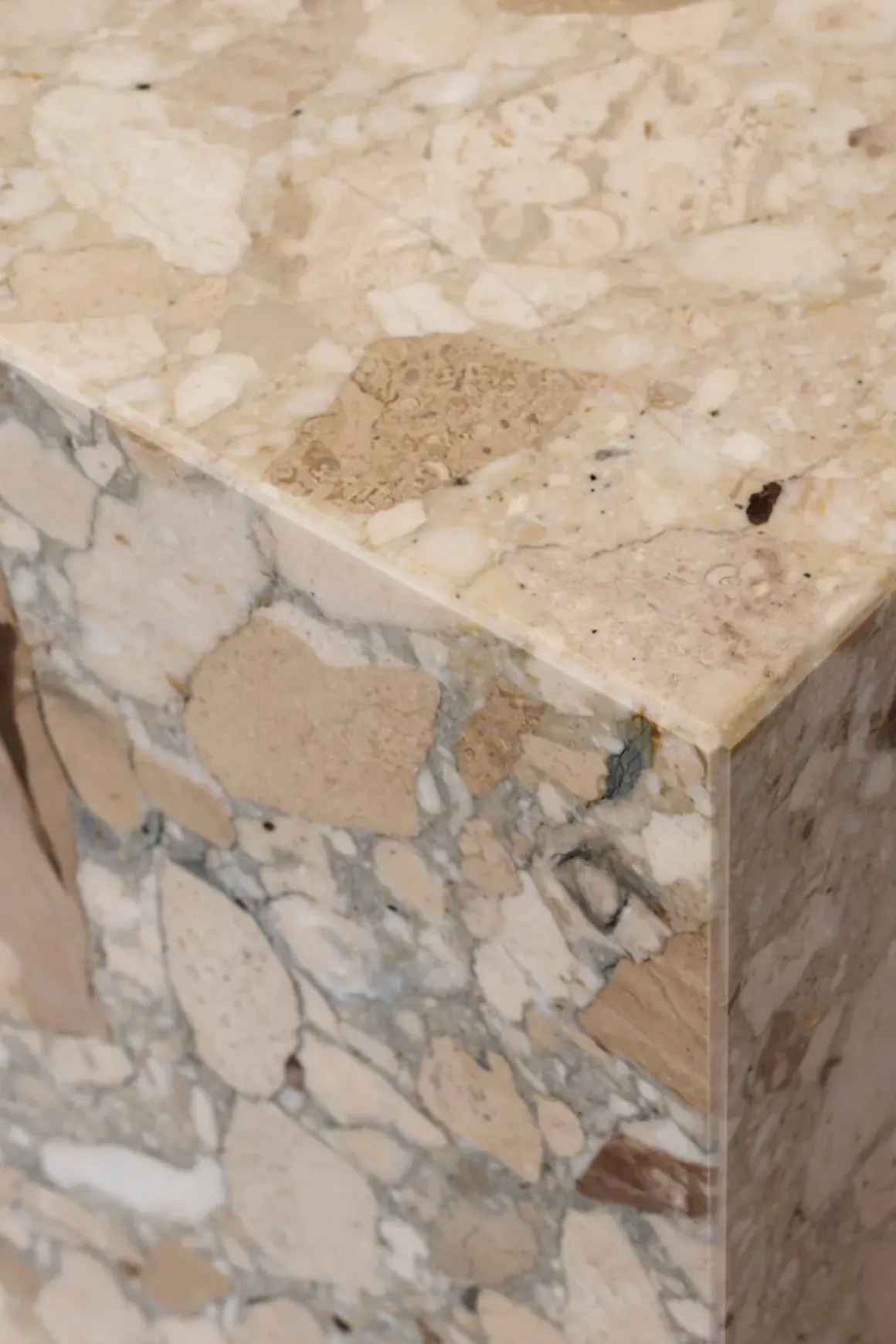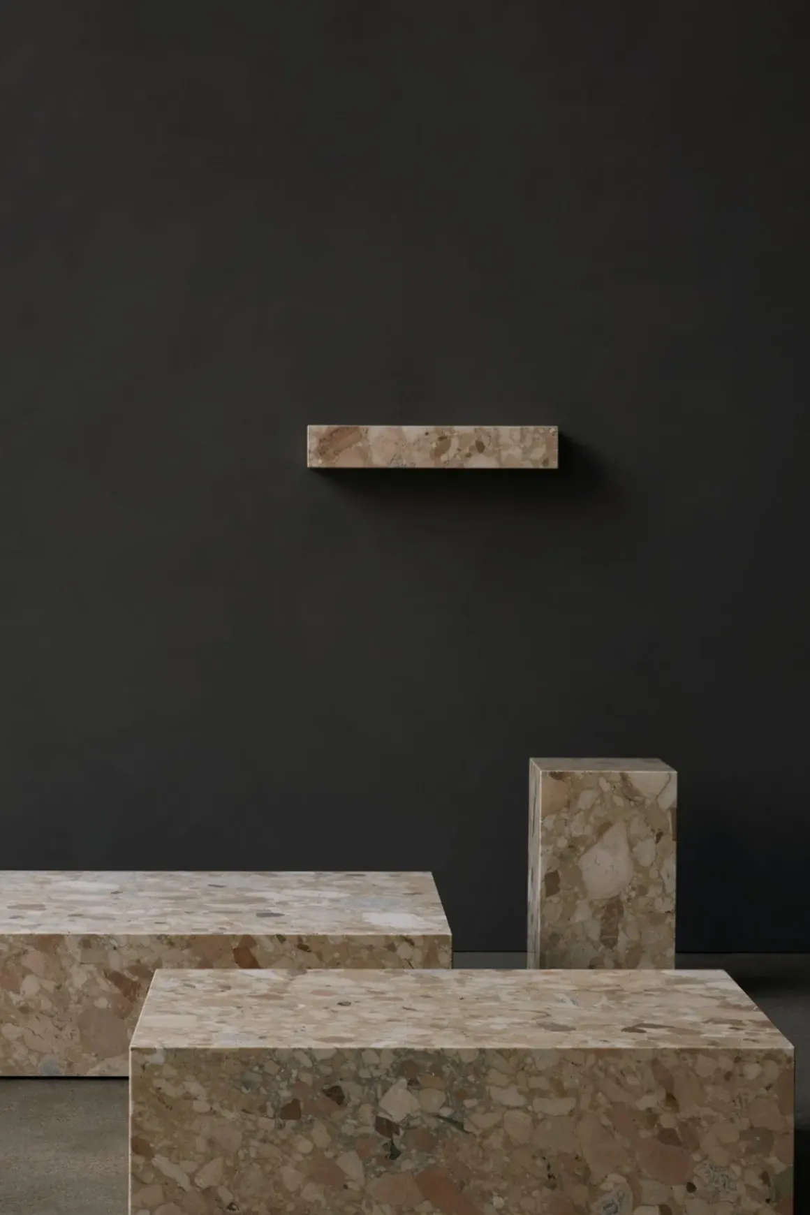 Plinth Low stuebord, laget i italiensk Kunis Breccia stein som er en kunstnerisk blanding av steiner i varme fargetoner som skaper subtil tekstur og tilfører en ny dimensjon med sitt raffinerte og innbydende uttrykk. Plinth er et allsidig og tidløst bord håndlaget i en liten fabrikk i Portugal. Bordet har en lav sokkel som gjør at det nesten ser ut som om det svever over gulvet. Plinth har også fire små ben som kan justeres i underkant av en cm i høyden. Bena synes ikke da de er satt fire cm inn fra kanten. Den kubistiske formen er svært raffinert, myk og skulpturell. Til tross for at bordet er monumentalt har det et lett og luftig ytre. Hver marmordel er nøye utvalgt og montert for hånd for å sikre at sidene blir satt sammen perfekt. Resultatet er at dette vakre bordet er konsistent i form og kvalitet, samtidig unikt i marmormønsteret. Plinth bord kommer også i andre typer marmor og i tre ulike størrelser. Designet av Norm Architects.