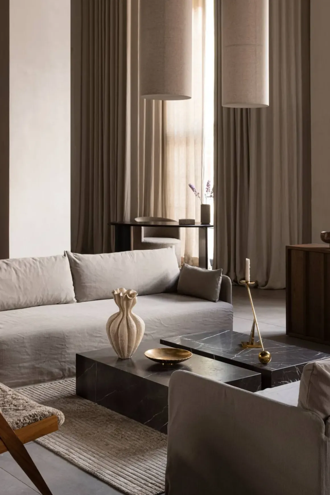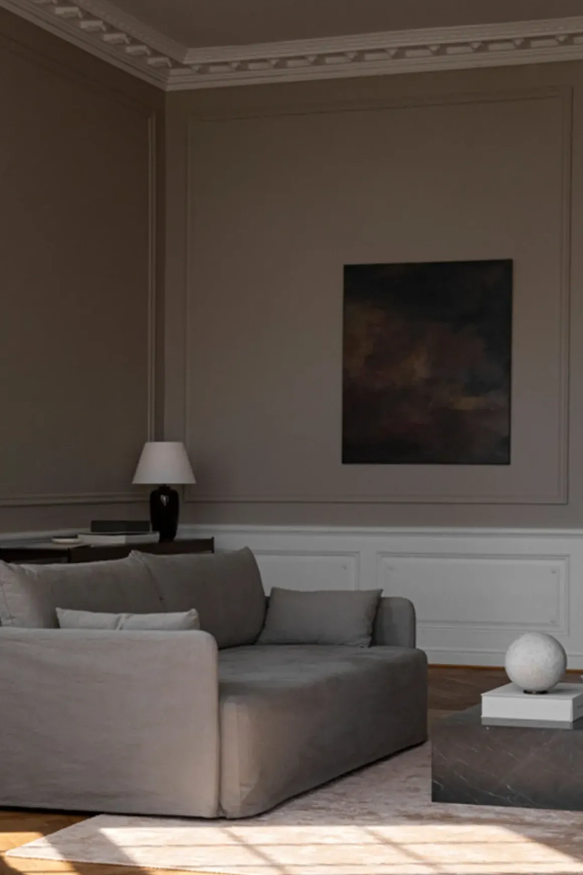 Plinth Low stuebord i brun og grå marmor. Allsidig og tidløst bord håndlaget i en liten fabrikk i Portugal. Bordet har en lav sokkel som gjør at det nesten ser ut som om det svever over gulvet. Plinth har også fire små ben som kan justeres i underkant av en cm i høyden. Bena synes ikke da de er satt fire cm inn fra kanten. Den kubistiske formen er raffinert, myk og skulpturell. Hver marmordel er nøye utvalgt og montert for hånd for å sikre at sidene blir satt sammen perfekt. Designet av Norm Architects. Plinth kommer i ulike marmorvarianter og i flere forskjellige størrelser.