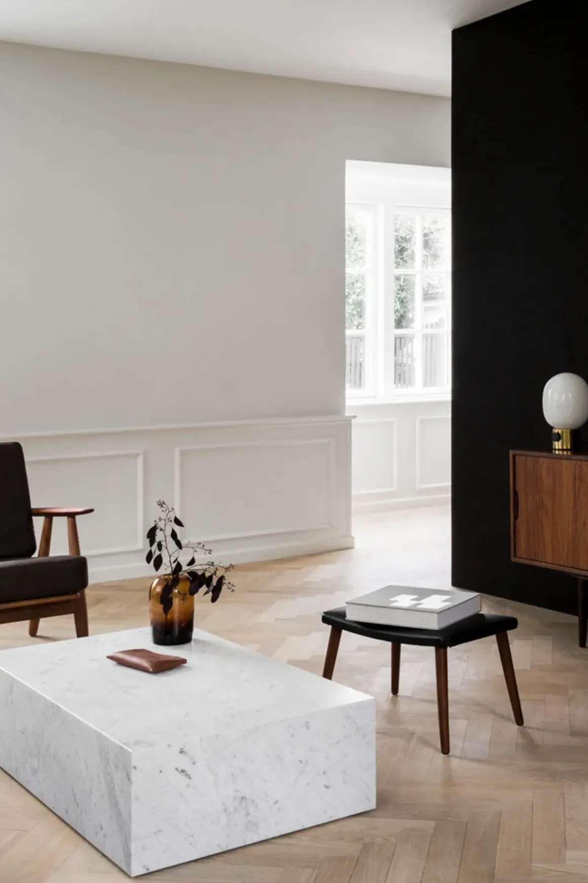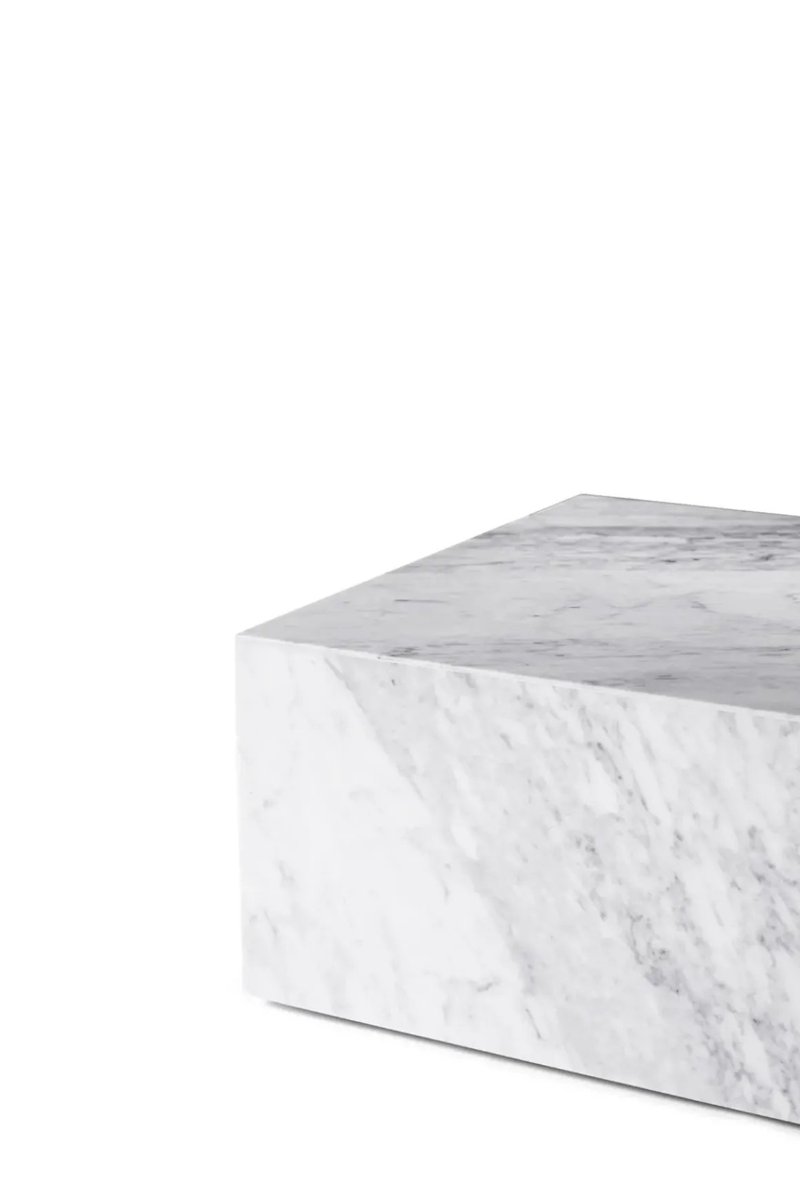 Plinth Low stuebord i hvit, klassisk Carrara marmor fra Italia. Allsidig og tidløst bord håndlaget i en liten fabrikk i Portugal. Bordet har en lav sokkel som gjør at det nesten ser ut som om det svever over gulvet. Plinth har også fire små ben som kan justeres i underkant av en cm i høyden. Bena synes ikke da de er satt fire cm inn fra kanten. Den kubistiske formen er raffinert, myk og skulpturell. Hver marmordel er nøye utvalgt og montert for hånd for å sikre at sidene blir satt sammen perfekt. Designet av Norm Architects. Plinth kommer i ulike marmorvarianter og i flere forskjellige størrelser.