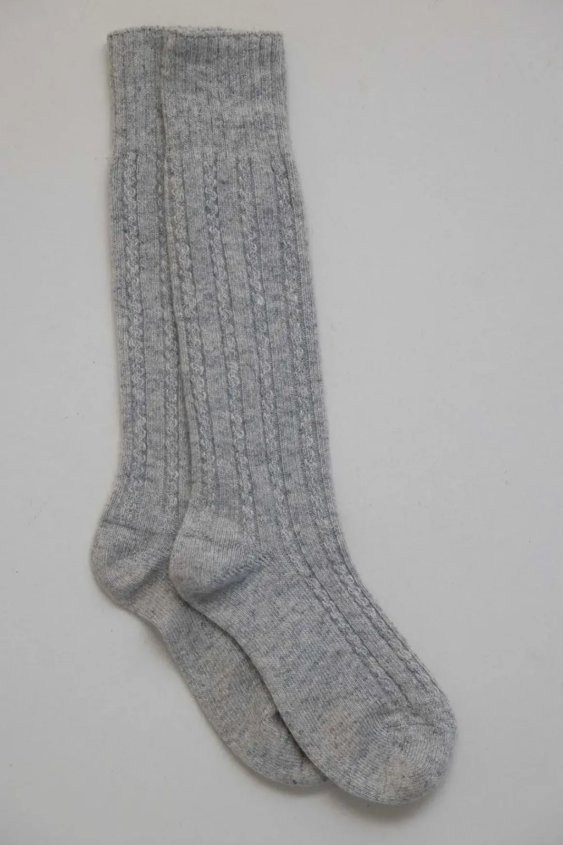 Scotland ullsokkene fra Maria La Rosa er strikket i en myk og varm ullblanding med et subtilt flettemønster som gir et tidløst uttrykk. Den knelange modellen sørger for komfort og varme, perfekte utover våren og til kjølige kvelder.