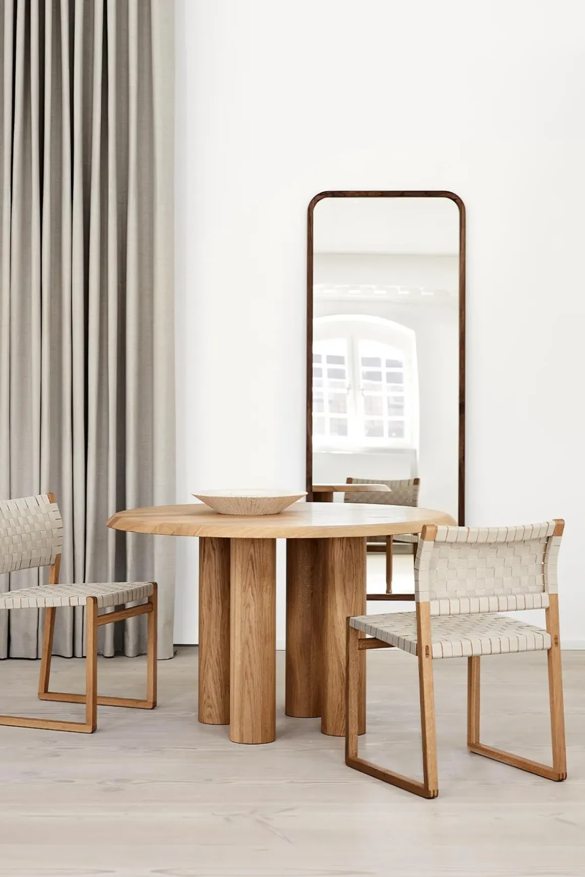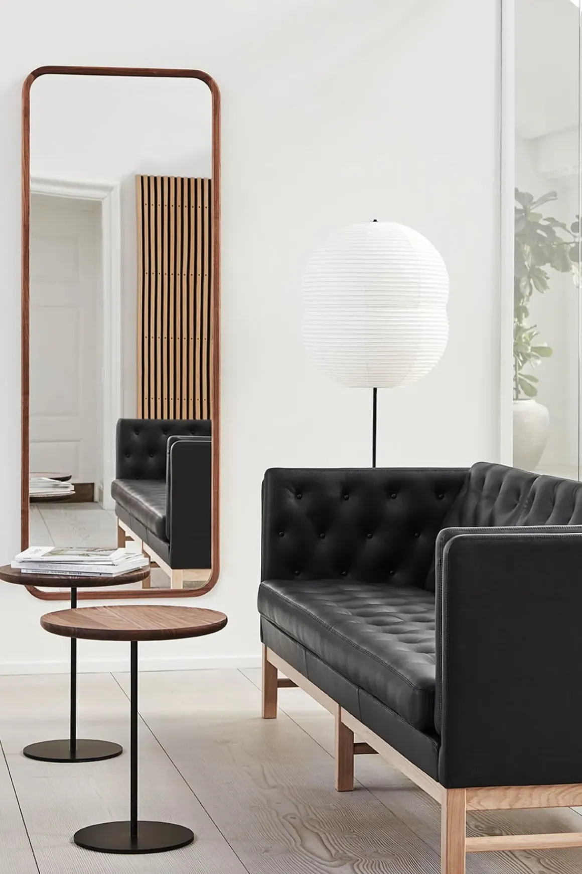 Silhouette speil fra Fredericia, designet av København-baserte OEO Studio. Silhouette er en serie speil innrammet i heltre, inspirert av fokus på materialer, håndverk og opplevelsen av å leve med design. Konseptet er basert på en enkel geometrisk ligning – en rund, et kvadrat og et rektangel som universelle former som er tidløse, trendløse og samtidig moderne. Varmen fra valnøttrammen kombinert med nøysomme detaljer gir raffinement og en klassisk følelse. Silhouette er tilgjengelig i oljet valnøtt eller eik. Bruk speilet på soverommet, i gangen eller stuen.