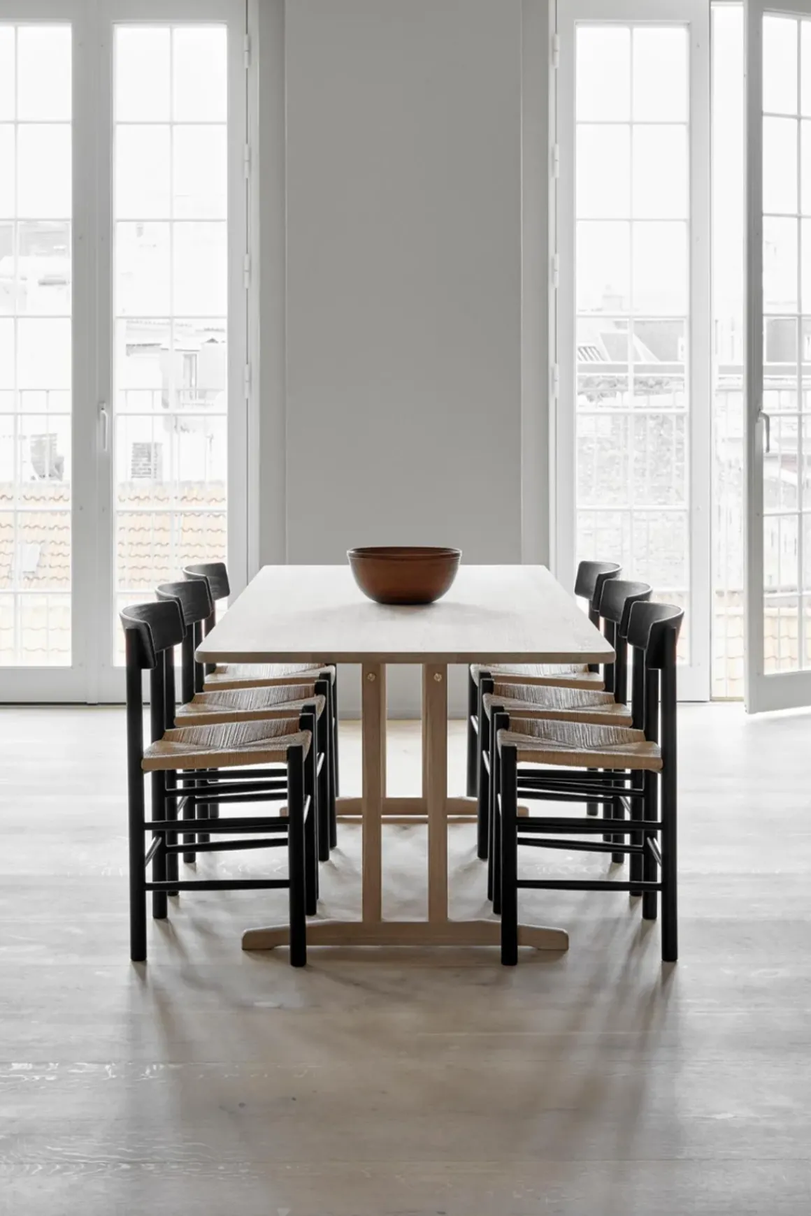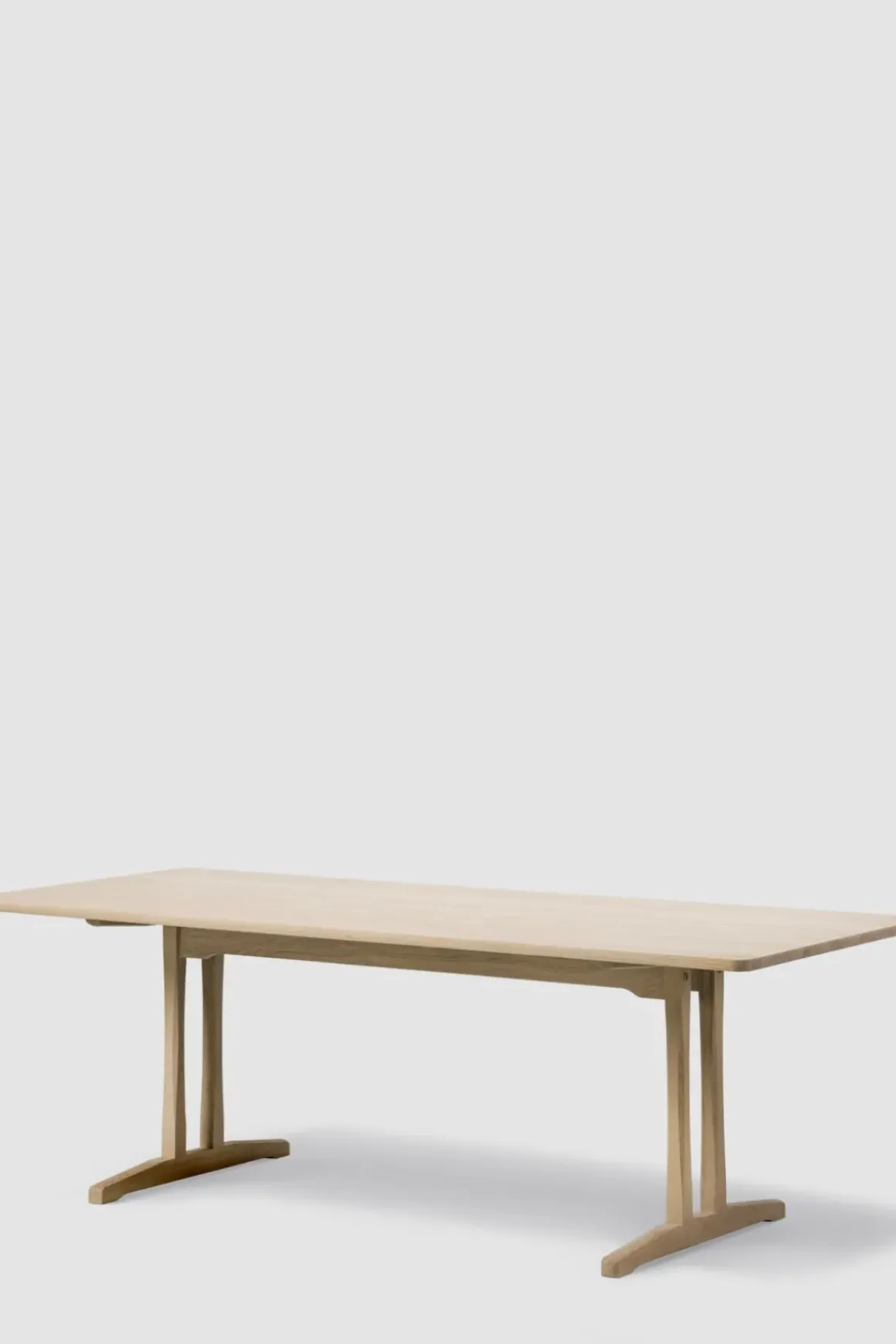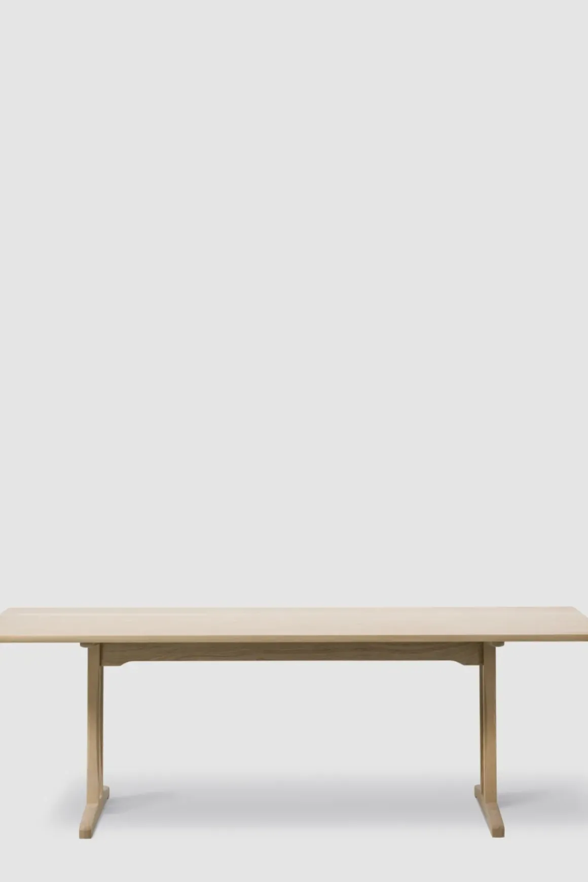 klassisk og robust hverdagsbord. C18 er inspirert av de amerikanske shakerbordene, og kan med sitt avklarte formspråk og fullendte håndverk vare i generasjoner. Bordet er laget i vakker, såpet eik og har en lengde på 220 cm som gjør at det er god plass til 3 stoler på hver side. Tilleggsplater kan kjøpes separat slik at man kan forlenge bordet til 260 eller 300 cm. Ettersom bena er trukket inn under bordet passer det til alle stolbredder og stoltyper. Et klassisk og varig design som tåler tidens tann.