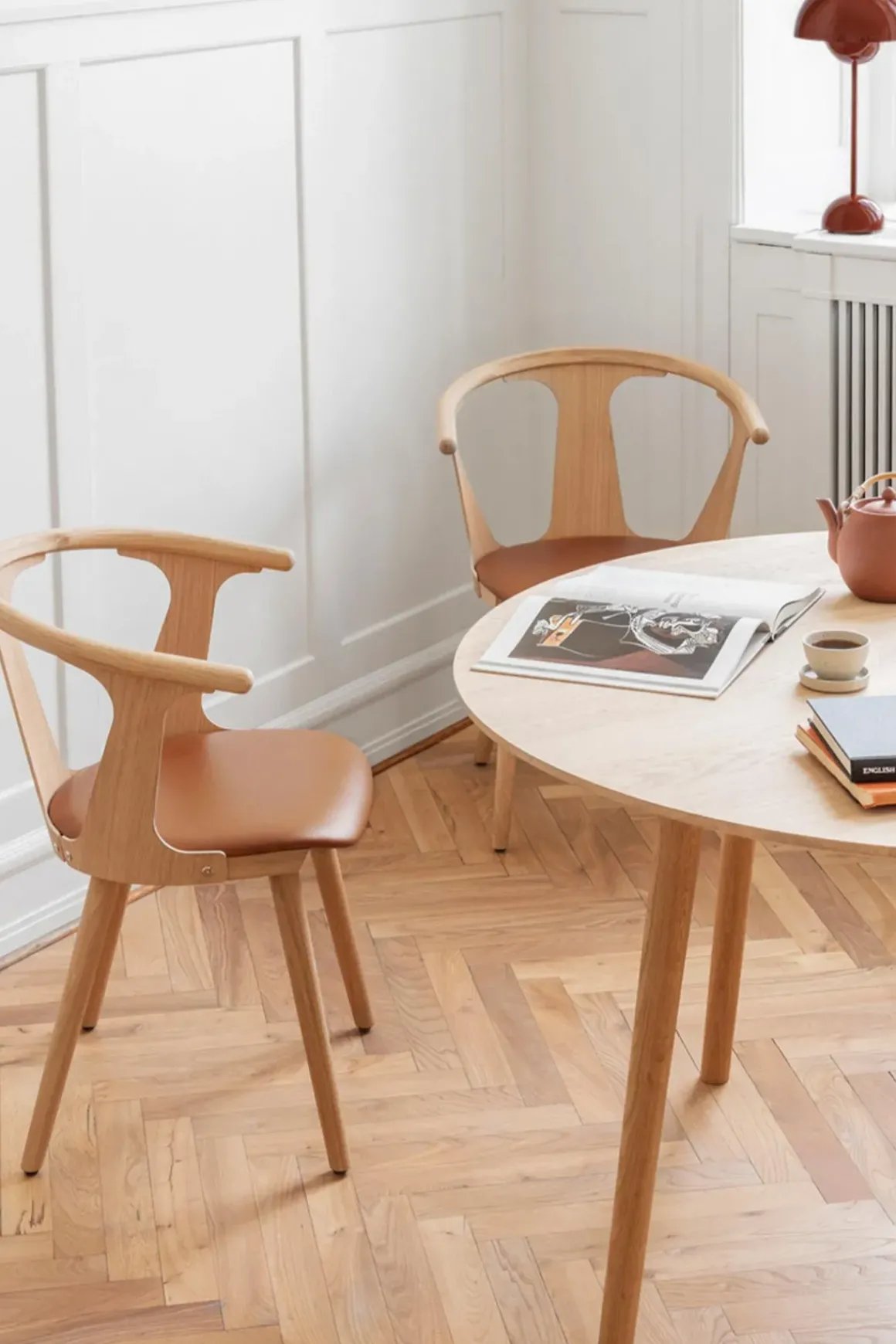 SK3 In Between spisebord, designet av finske Sami Kallio for u0026amp;Tradition. Inspirert av den skandinaviske arven innen design og møbelhåndverk, er In Between et resultat av Sami Kallios solide forankring i tradisjonelle håndverksteknikker og hans øye for geniale detaljer. Det startet med en enkelt stol som senere resulterte i en serie møbler inkludert både bord og barkrakker. Bordet er laget av solid oljet eller lakkert tre og kommer i tre forskjellige varianter. Man kan velge mellom finish i oljet eik, røkt oljet eik, sort lakkert eik eller oljet valnøtt.