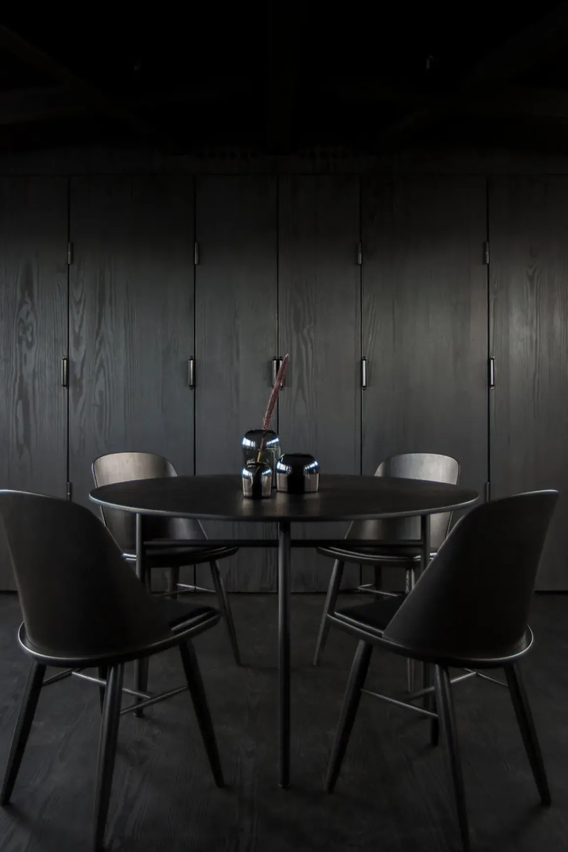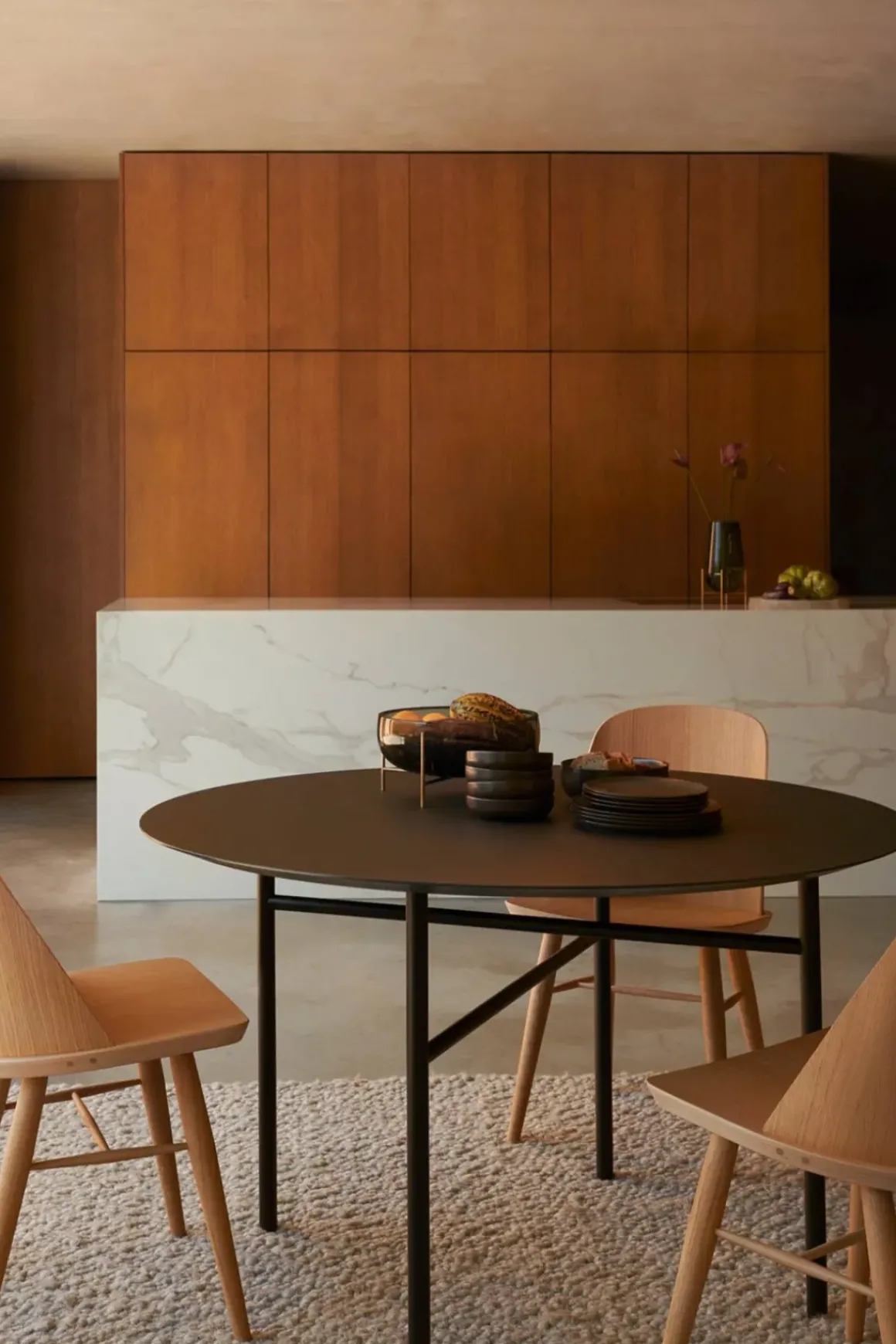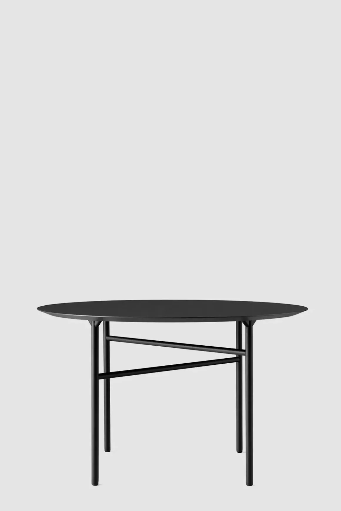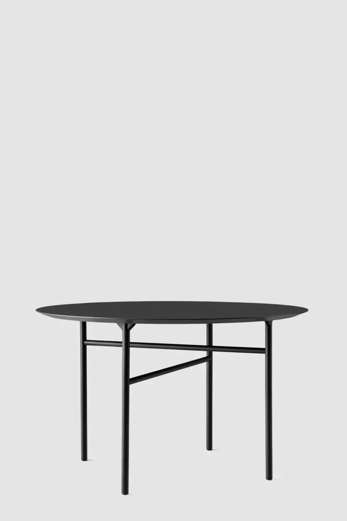 Snaregade rundt spisebord i en mørkegrå farge, med bordplate i linoleum og ben i sort, pulverlakkert stål. Snaregade er designet av Norm Architects og ble opprinnelig designet til Audo Copenhagens grunnlegger Bjarne Hansens private hjem. Han trengte et bord som hadde effektiv plassbruk, var visuelt lett og selvfølgelig sofistikert. Bordet ble så godt mottatt at det har vært i produksjon siden, og kommer i flere varianter, størrelser og farger. Snaregade er et klassisk og minimalistisk bord med en sterk geometrisk tilstedeværelse. Bordet er klassisk nok til å heve enhver plass estetisk, og er samtidig stødig og holdbart nok for både kommersiell og privat bruk. Dette er et praktisk og vakkert bord med god plass til 4 personer rundt, til hverdags eller spesielle anledninger.