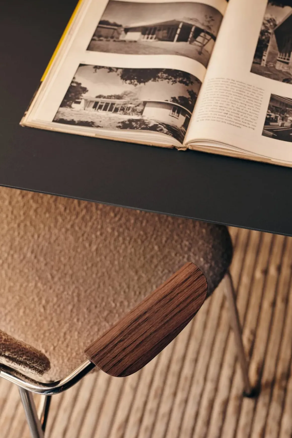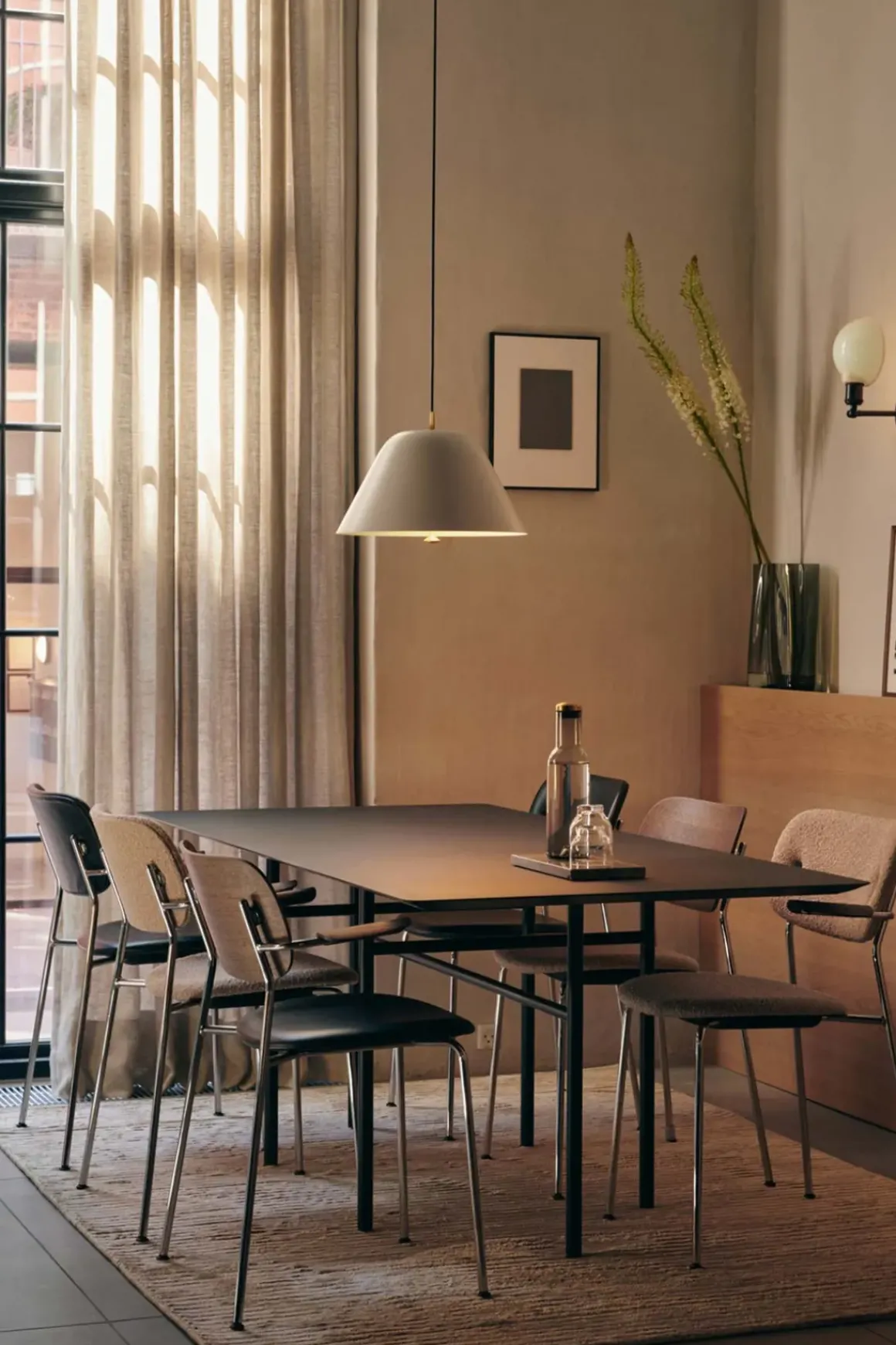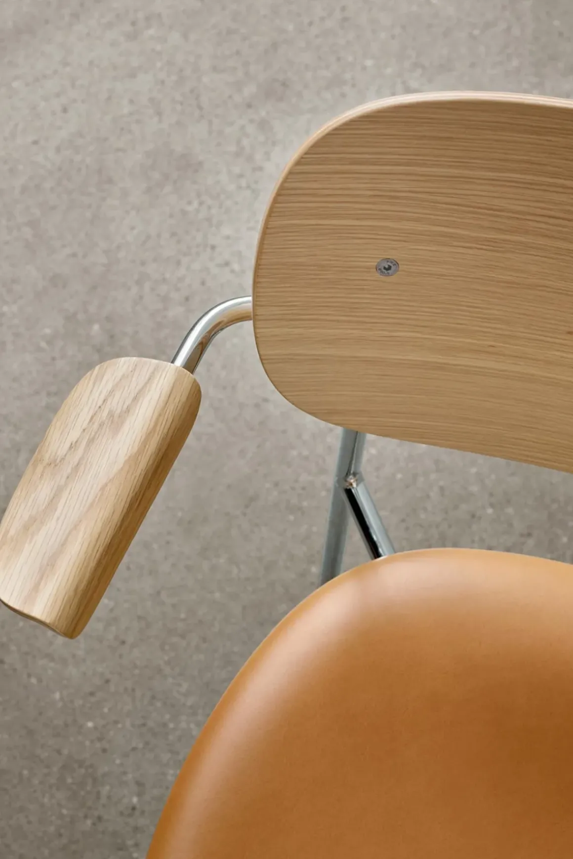 Co Dining Chair, designet av Norm Architects og Els van Hoorebeeck for Audo Copenhagen. Co Dining Chair kombinerer en lett, minimalistisk profil, varme materialer og god sittekomfort pluss muligheten til å stable opptil 10 stoler i et kompakt tårn som gjør den ekstra praktisk. Designets allsidighet er resultatet av en gjennomtenkt konstruksjon og et bredt utvalg av materialer: med mange finérfinisher og møbeltrekk å velge mellom, er Co Dining Chair lett å tilpasse deg og dine behov. Stolens proporsjoner utmerker seg med en bred finérrygg som gir eksepsjonell støtte, og gir samtidig bevegelsesfrihet og maksimal sittekomfort. Sete, rygg og armlener er laget av buet kryssfiner, mens kjernen er laget av bøkefinér med ytterlag av eikefinér. Dobbeltlags-skum brukes i polstrede seter for ekstra komfort. Stolens base er laget av bøyd MIG+TIG-sveiset stålrør og armlener fra stålstenger, enten i sort, pulverlakkert stål eller i forkrommet stål. Co Dining Chair finnes med og uten polstring i sete/rygg, med og uten armlene, i lys, mørkebrun eller sort eikefinér, med sort eller krom base, og i utallige materialkombinasjoner. Kom innom oss for å se på materialprøver og få hjelp til å designe din drømmestol.