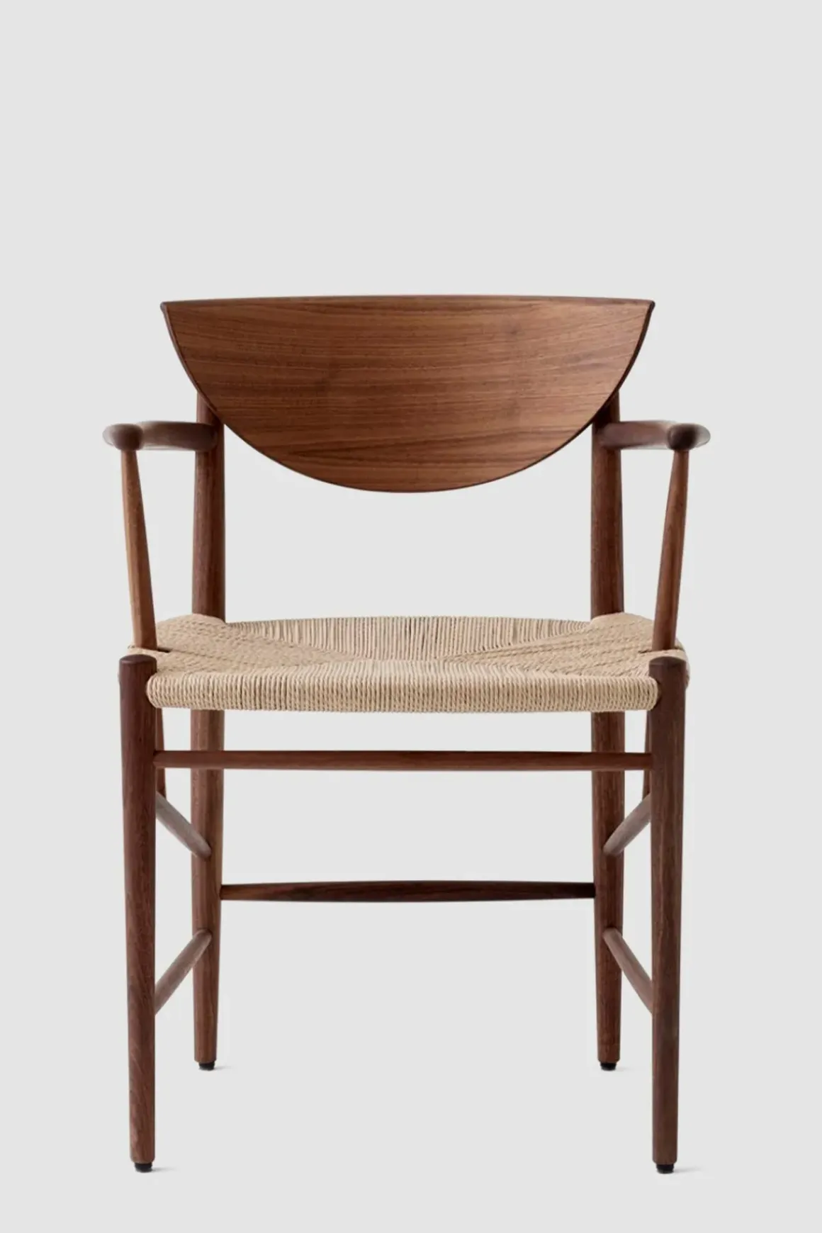 Drawn spisestol med armlener i oljet valnøtt fra danske u0026amp;Tradition. Drawn er en del av dansk designhistorie og ble designet av Hvidt u0026amp; Mølgaard i 1956. Stolen er bygget på tradisjonelle håndverksteknikker og laget av naturlige materialer som tilfører en lunhet og varme til hjemmet. Tilgjengelig i oljet eik, oljet valnøtt, såpet eik, og i svartlakkert eik. Den kommer i to versjoner: en bredere modell med armlener, eller en noe smalere uten armlener. I tillegg kan man kjøpe ekstra sittepute i enten Prescott-svart eller cognacfarget skinn for en enda mykere sitteopplevelse.