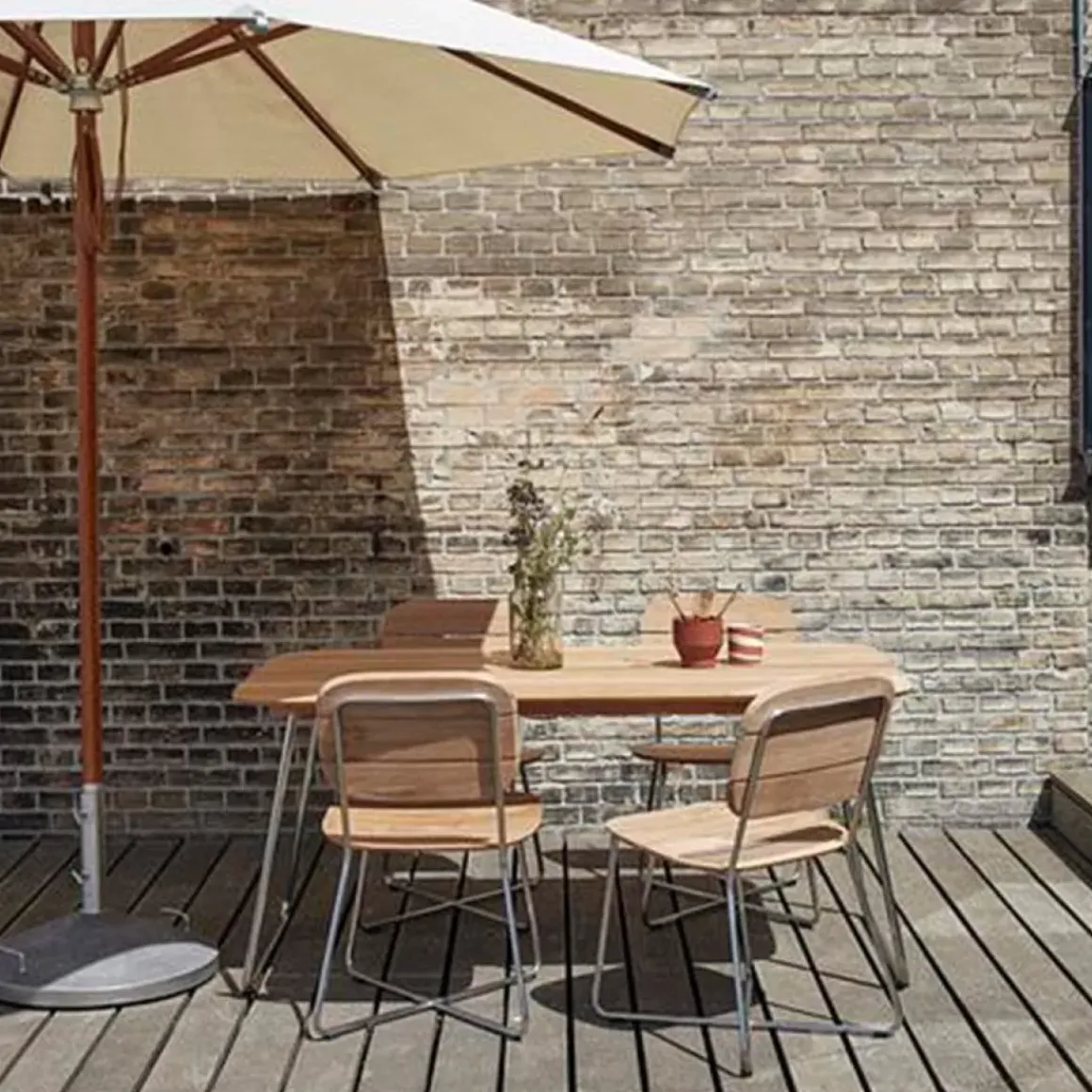 Lilium-utestol fra Skagerak. Denne stolen har en behagelig og litt bredere form enn en vanlig spisestol, spesielt designet med tanke på å motstå all slags vær. Setet og ryggstøtten er laget av solid teak, med en X-formet base av rustfritt stål. Moderne og klassisk på samme tid, perfekt i hagen, på terrassen eller balkongen. Lilium-serien har også matchende bord og benk, og det finnes sitteputer i flere farger spesielt tilpasset denne stolen. Over tid vil treet patinere og få den sølvgrå fargen mange er så glad i, men stolen kan også behandles for å bevare den originale fargen.