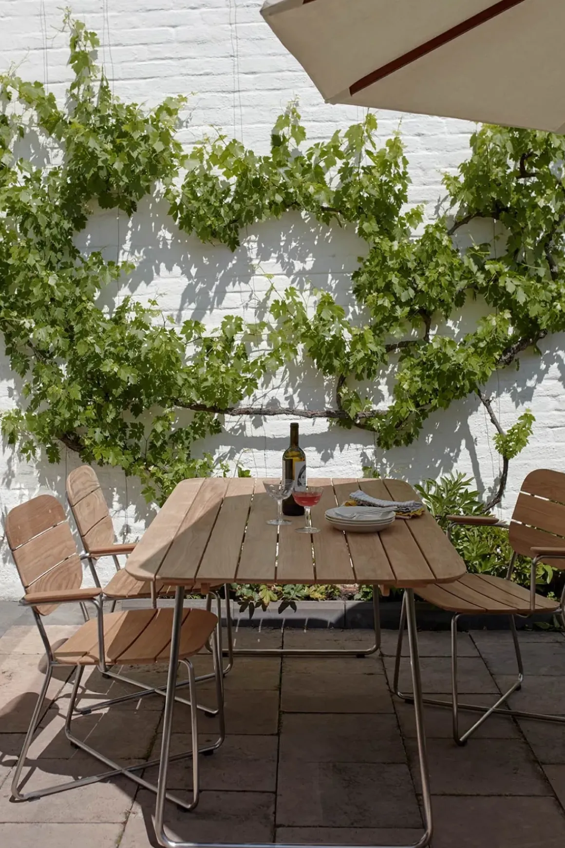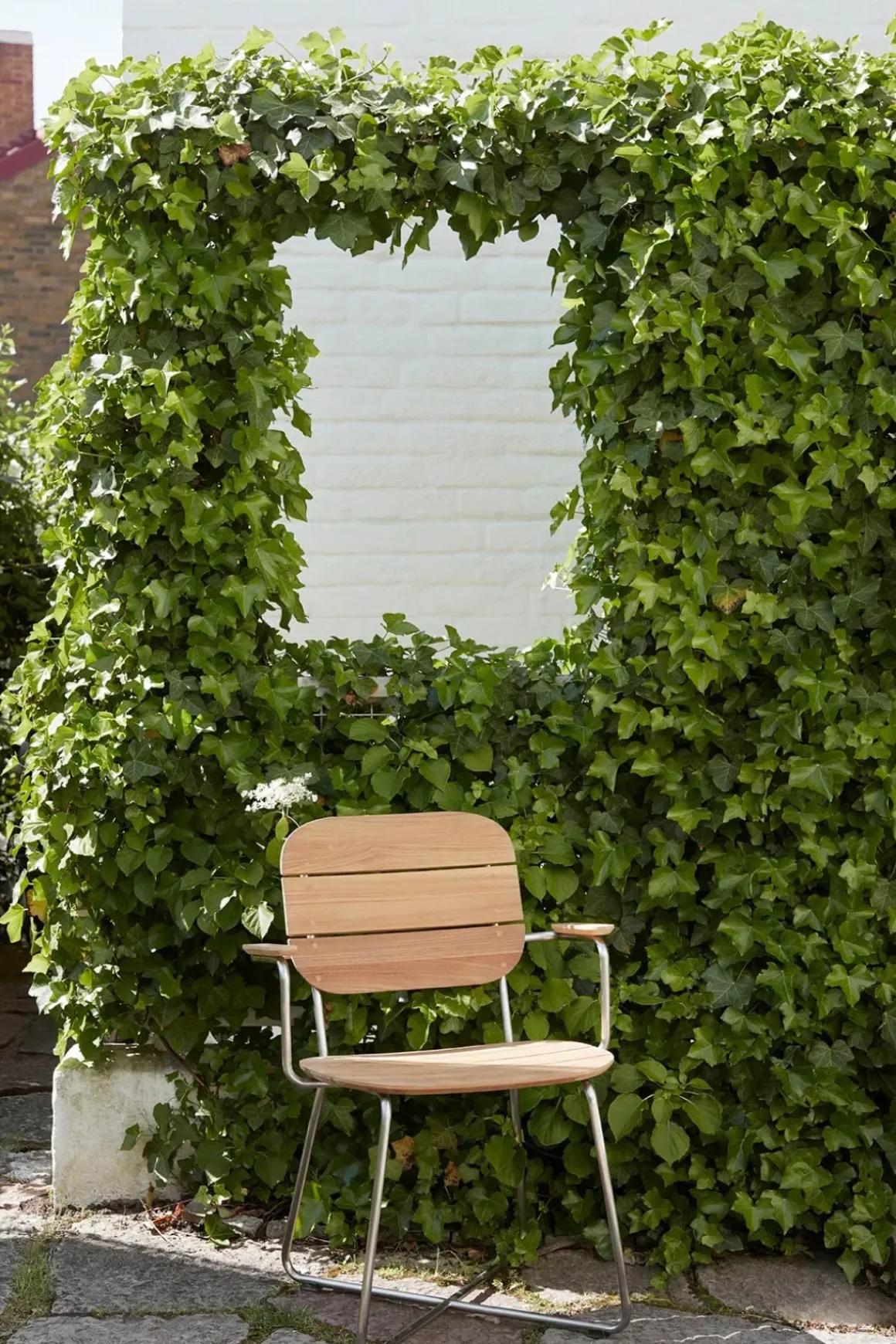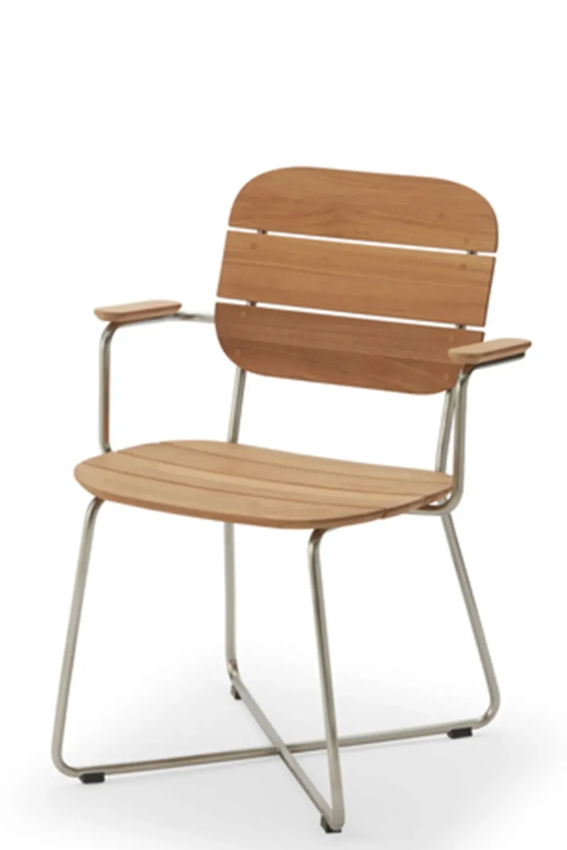 Lilium-utestol med armlener fra Skagerak. Denne stolen har en behagelig og litt bredere form enn en vanlig spisestol, spesielt designet med tanke på å motstå all slags vær. Setet og ryggstøtten er laget av solid teak, med en X-formet base av rustfritt stål. Moderne og klassisk på samme tid, perfekt i hagen, på terrassen eller balkongen. Lilium-serien har også matchende bord og benk, og det finnes sitteputer i flere farger spesielt tilpasset denne stolen. Over tid vil treet patinere og få den sølvgrå fargen mange er så glad i, men stolen kan også behandles for å bevare den originale fargen.