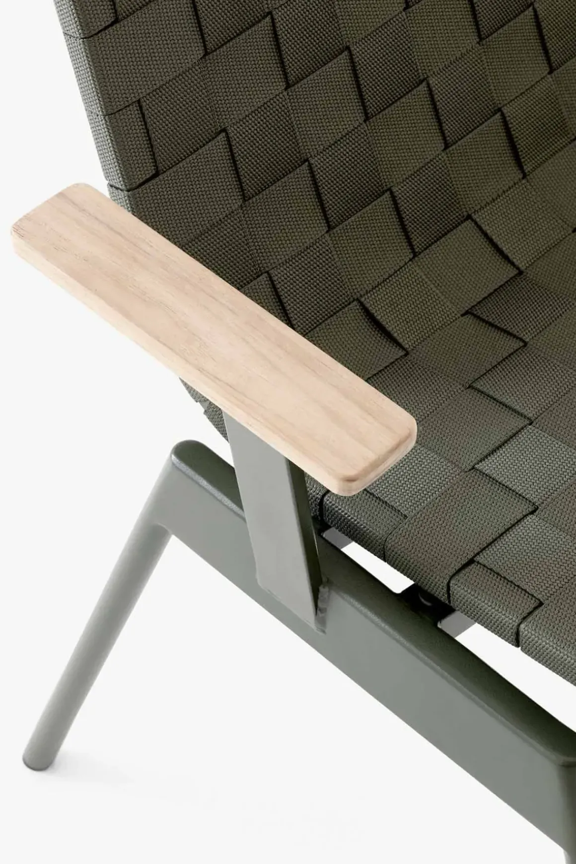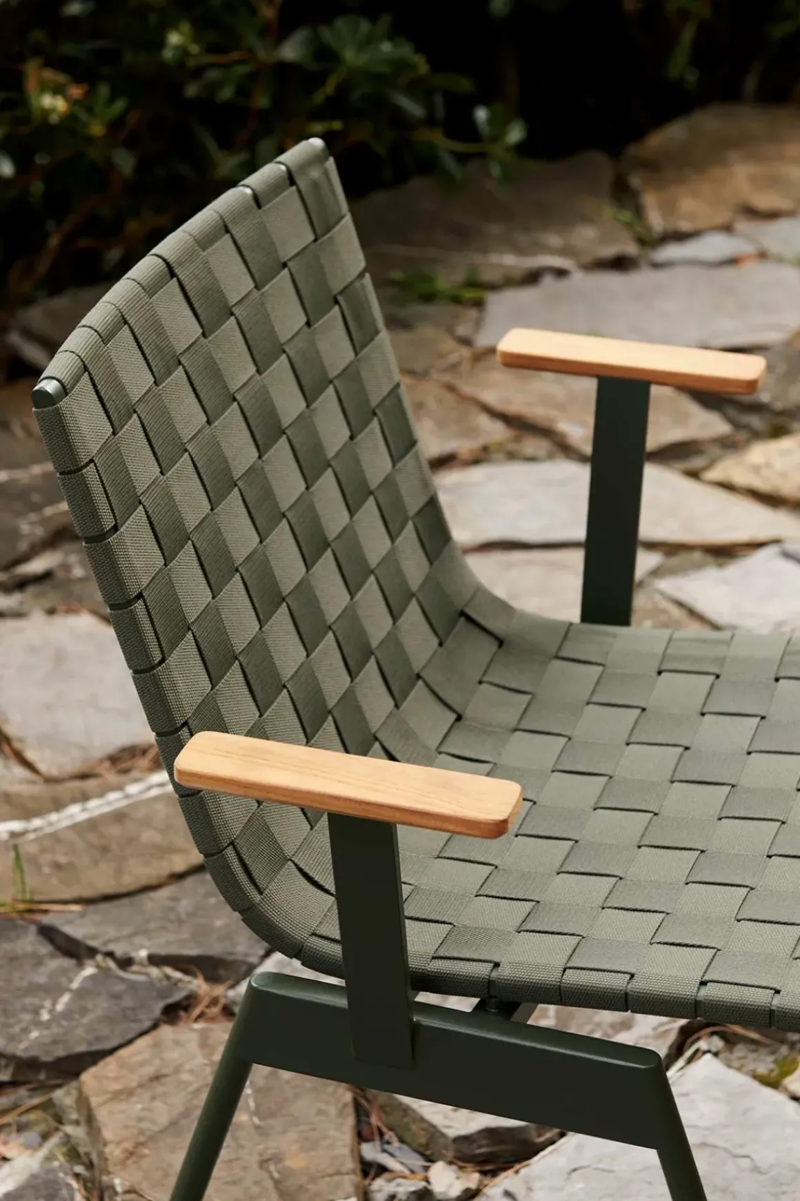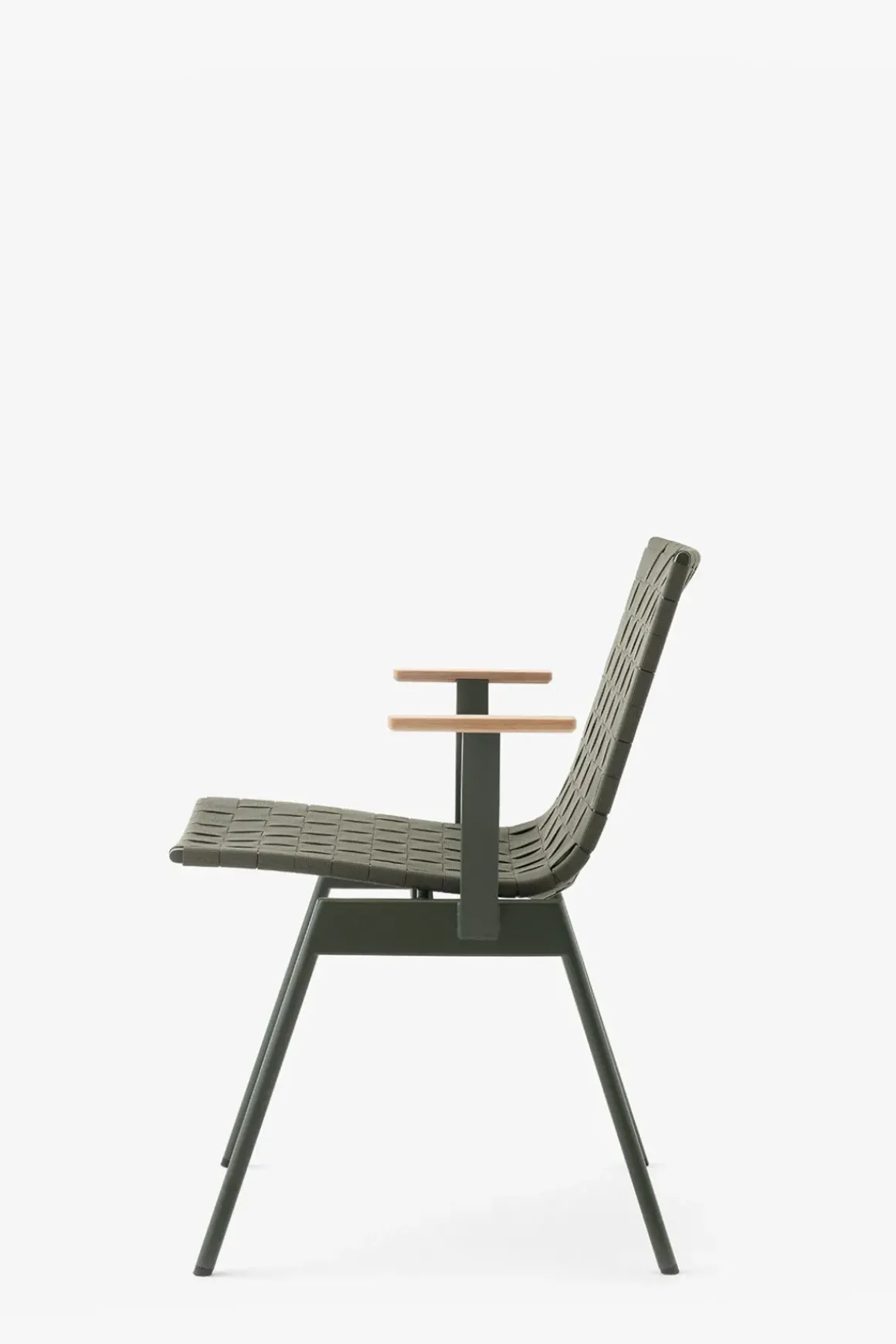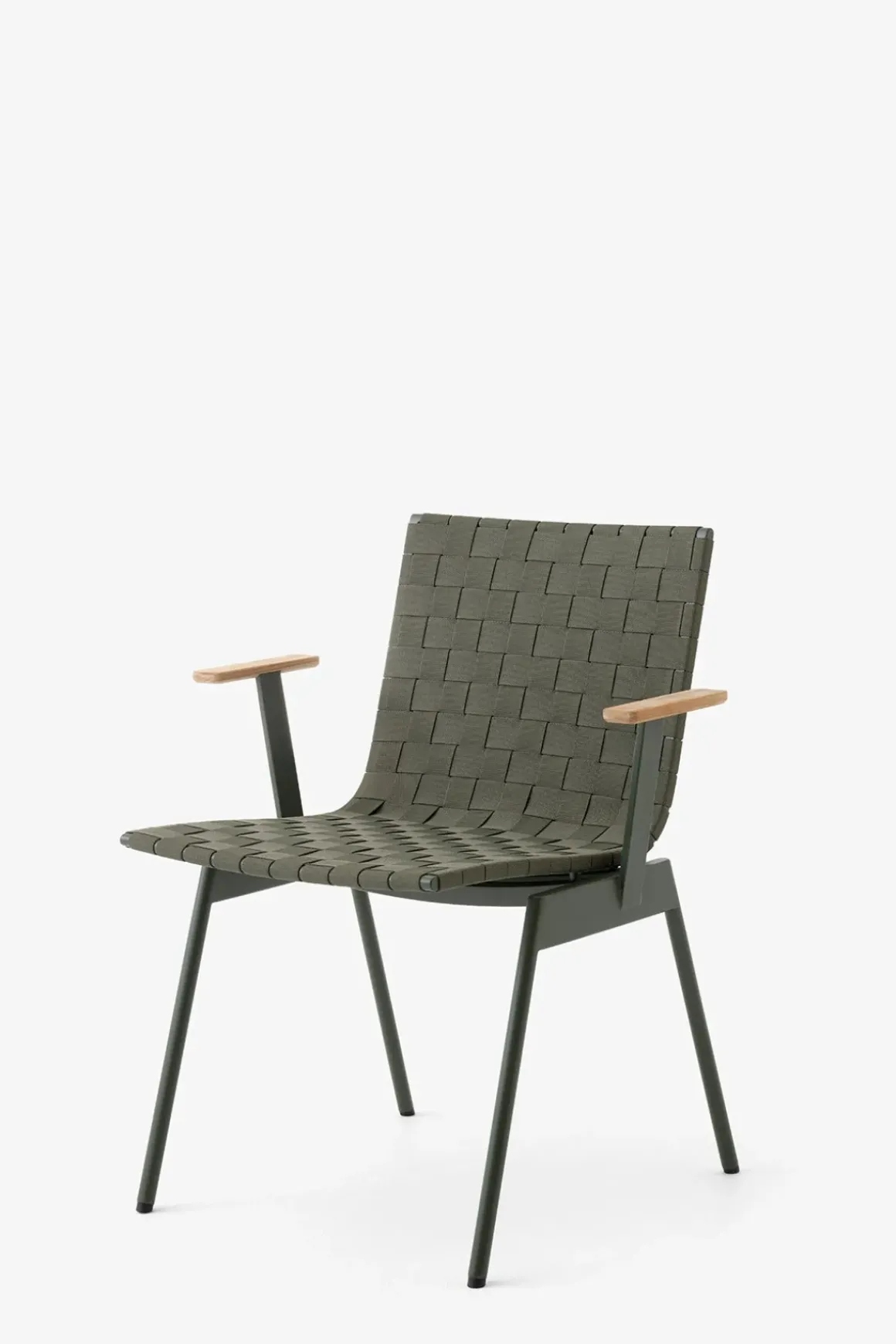 Ville AV34 utestol med armlener fra danske u0026amp;Tradition, designet av den norske designduoen Andersen u0026amp; Voll. Ville er laget av pulverlakkert stål med vevde polyesterremser i sete og rygg og armlener i teak. Metallet kuttes, formes, sveises og deretter pulverlakkeres, mens remsene til stolsetet er vevd for hånd og kuttet i form med en varm kniv for å unngå frynsing. Stolen finnes i sort eller grønn og kommer med eller uten armlener. Ville kan enkelt kombineres med andre typer utemøbler eller du kan komplettere med bord i samme serie for en helhetlig look til uteplassen. Stolene kan stables i hverandre som er veldig praktisk og plassbesparende når de ikke er i bruk.