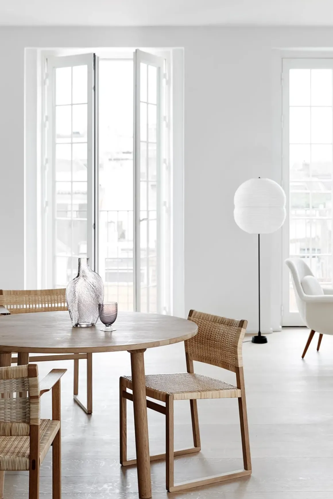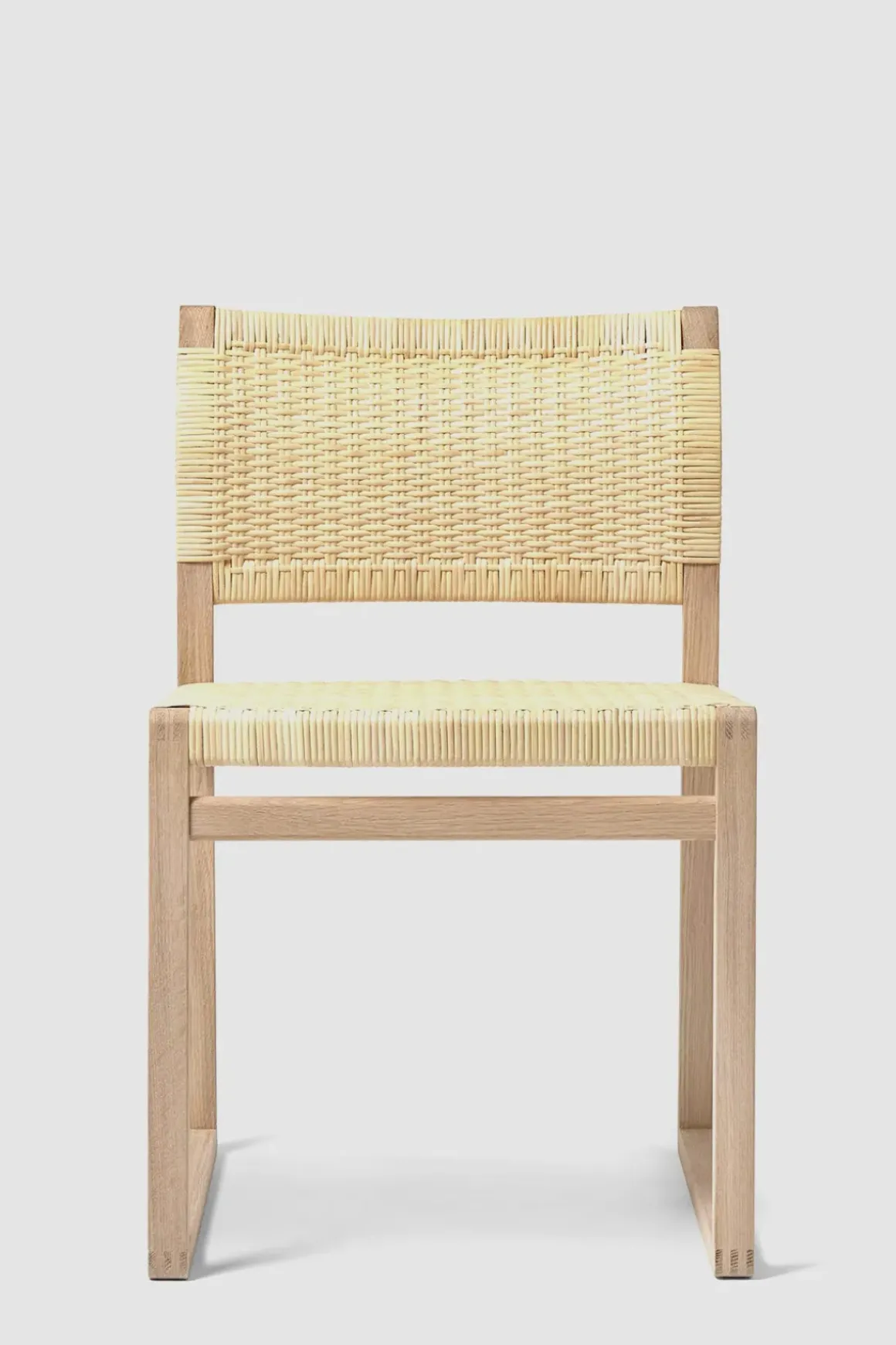 Spisestol BM 61, designet av den anerkjente, danske designeren Børge Mogensen for Fredericia. Stolen kommer med ramme av oljet eik, og valget mellom sete og rygg av linbånd eller flettet rattan. Det enkle, behagelige designet gjør stolen til en fantastisk komfortabel sitteplass både før, under og etter middagen. De tidløse materialene gjør stolen perfekt til alle hjem og interiørstiler.