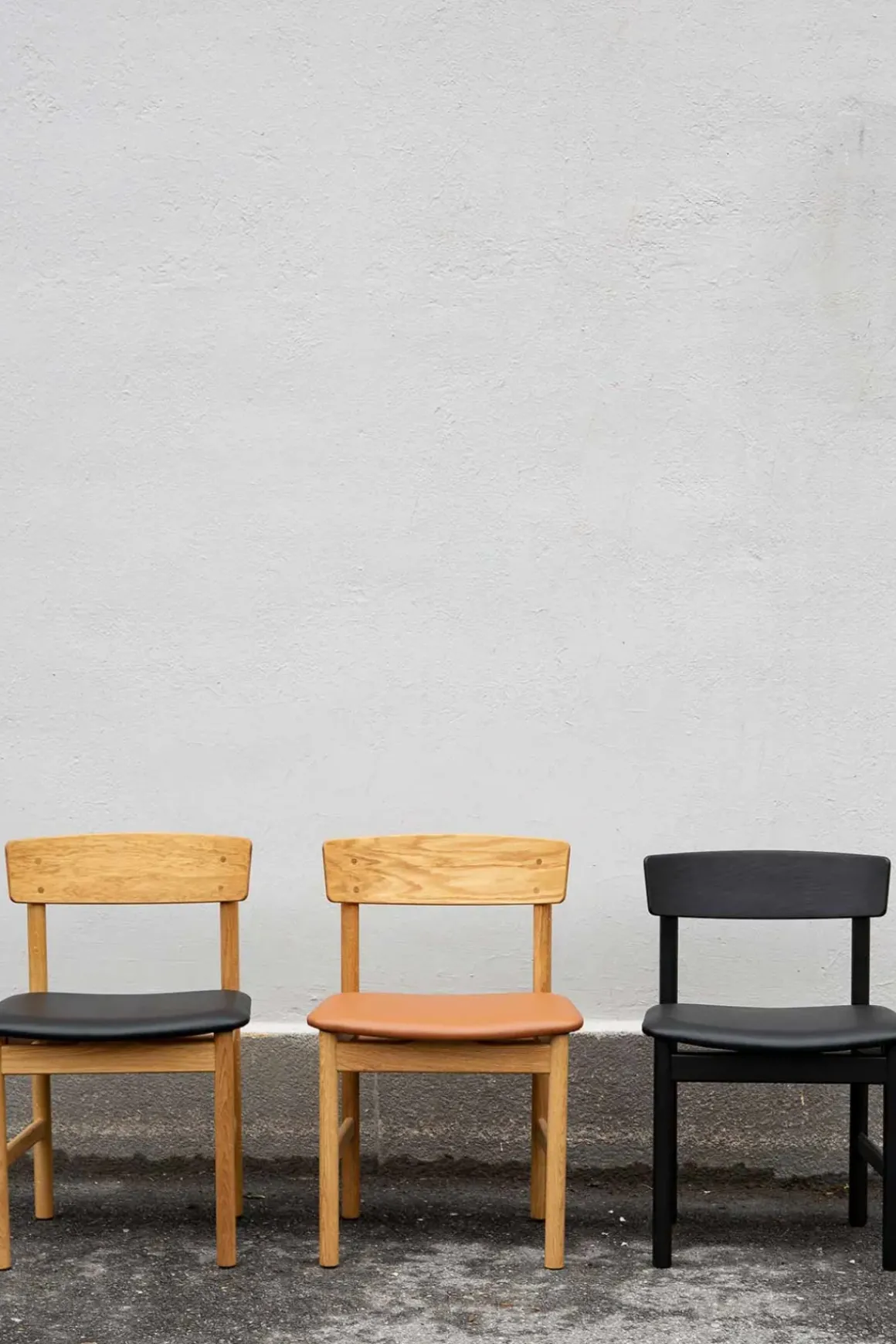 Spisestol i oljet eik med setepolstring i sort skinn fra danske Fredericia. Mogensen 3236 Chair ble designet av Børge Mogensen i 1956. Stolrammen er laget av heltre eik og ryggstøtten av tre er støpt i flere lag. Setet er av kryssfinér, trukket med CMHR- eller HR-skum og dekket med stoff eller skinn. Dette er en sofistikert og sjenerøs stol som inviterer til lange frokoster og middager. Stolen er i nær slekt med den klassiske J39 Folkestolen, men Mogensen 3236 er noe bredere og har polstret sete som gjør den enda mer behagelig og avslappende å sitte lenge i. Hvis du ønsker mer informasjon om stolen eller vil se på stoff-eller skinnprøver, så ta turen innom butikken – vi hjelper deg gjerne!