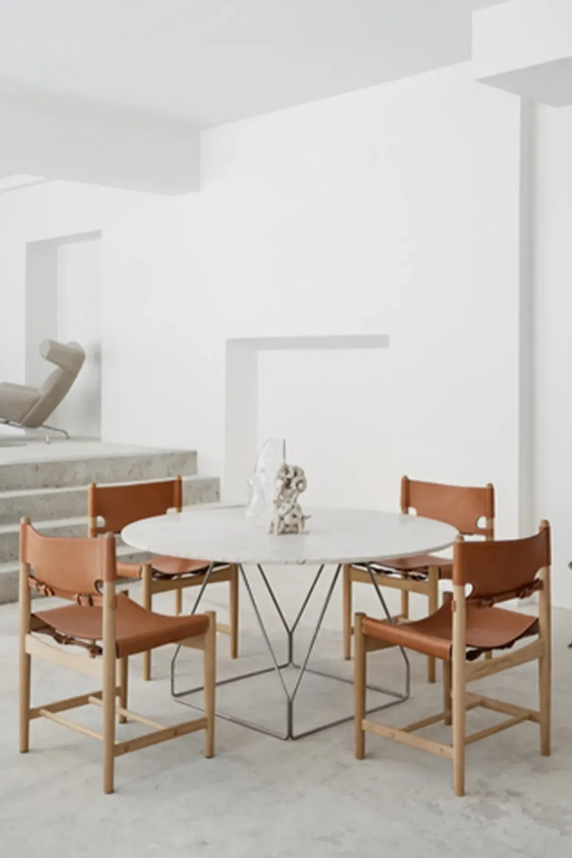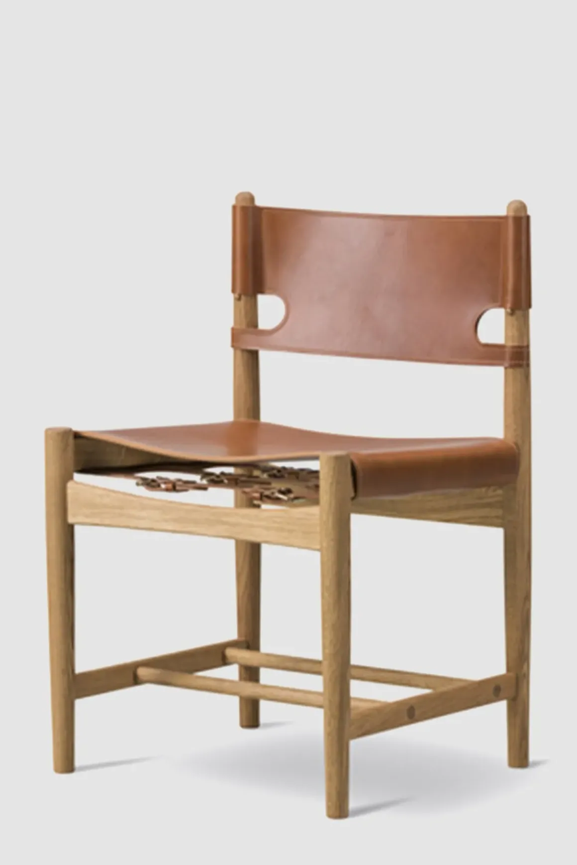 Spanish Dining Chair fra Fredericia, Model 3237. Opprinnelig ble denne stolen designet av Børge Mogensen i 1964. Nå er den satt i produksjon igjen og det til stor glede for alle som ønsker seg håndverksmessig solide møbler laget av ærlige materialer. Den spanske spisestolen er laget av nøye utvalgt eik og sadelskinn. Du kan få den med eller uten armlener og er tilgjengelig i flere finisher fra lyse til mørkere nyanser.
