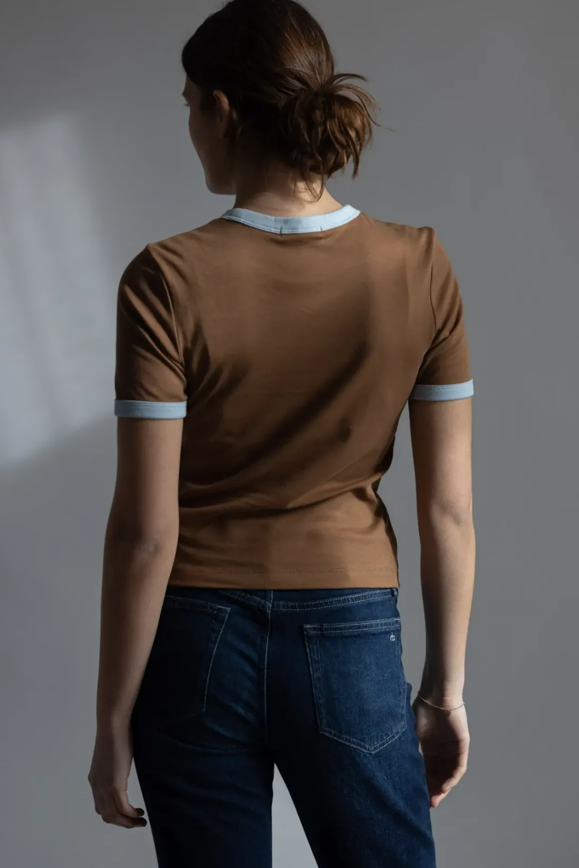 Klassisk Rag u0026amp; Bone t-skjorte i en delikat brunfarge med kontrast kant i hals og ermer. Den er i 100% bomull og kan enkelt stylet med f.eks jeans og olashorts.