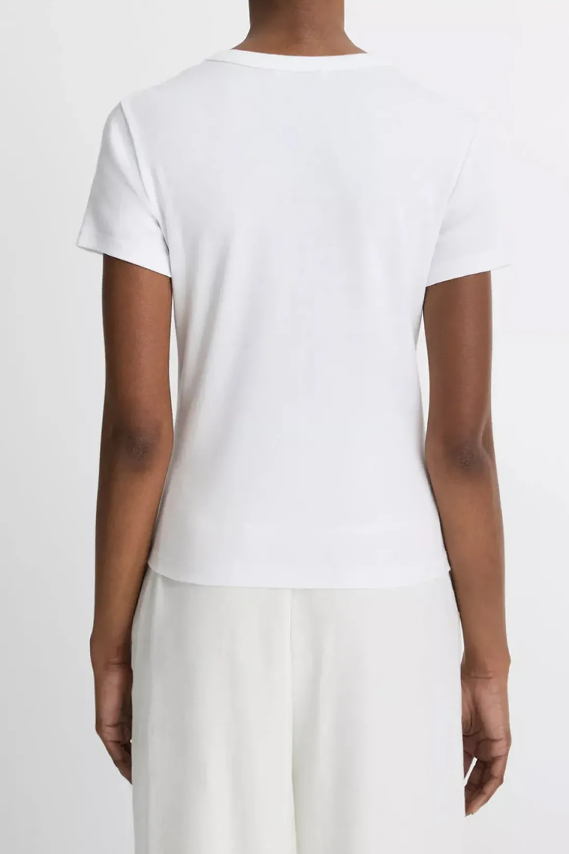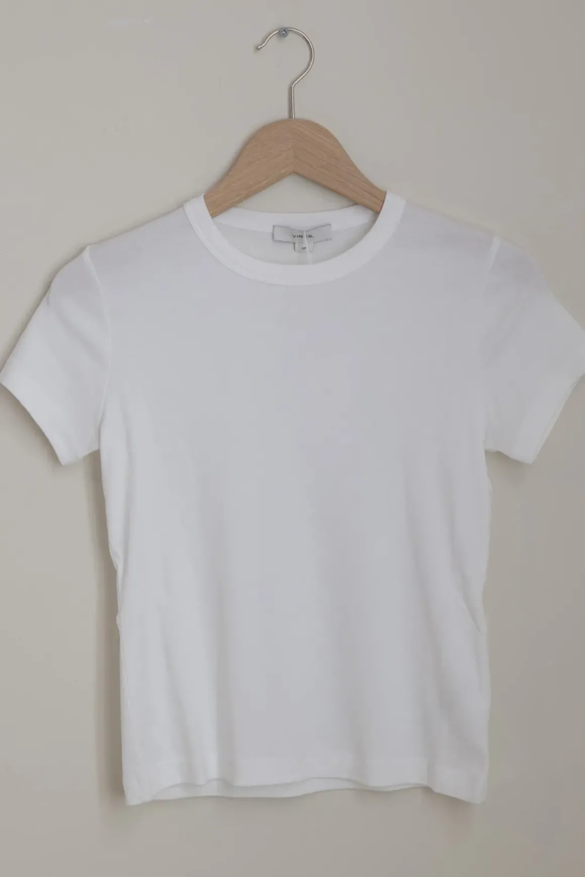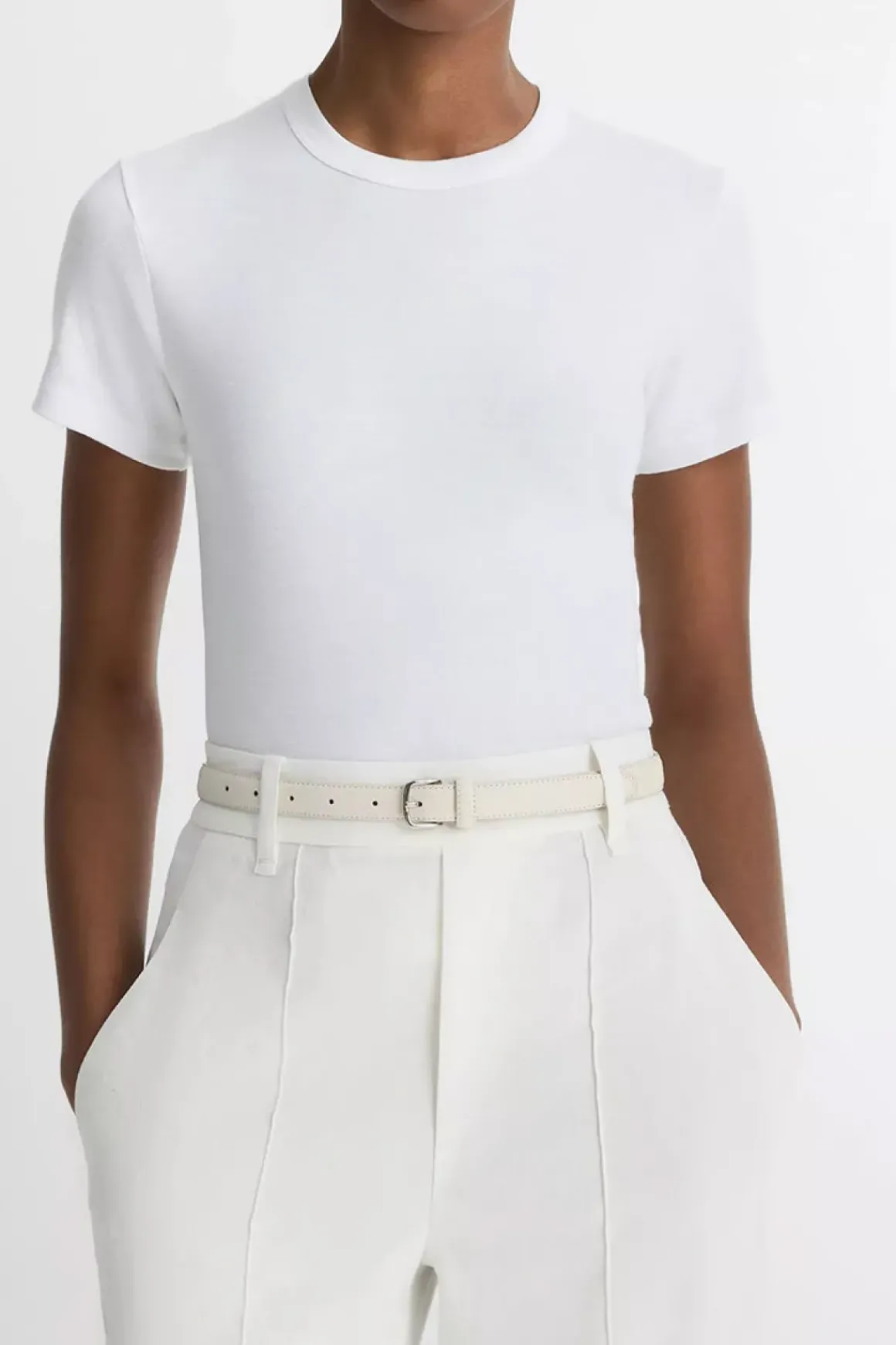 Klassisk t-skjorte fra Vince. T-skjorten er et allsidig basisplagg med kroppsnær passform og ren silhuett, inspirert av 90-tallets minimalistiske uttrykk. Den korte lengden gjør den ideell til bukser og skjørt med høyt liv, og den myke kvaliteten gjør at den føles behagelig hele dagen. Like fin alene som under en blazer.