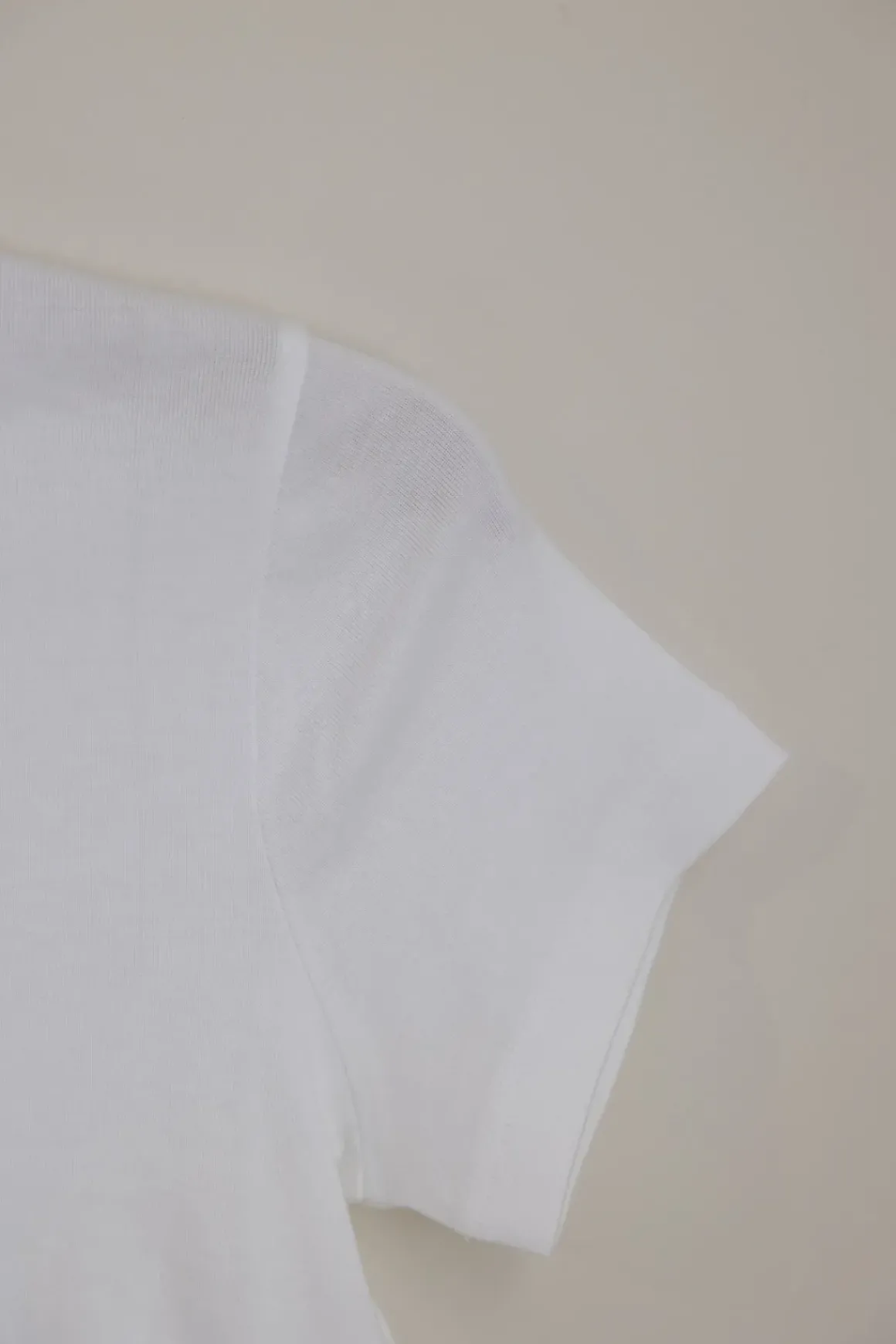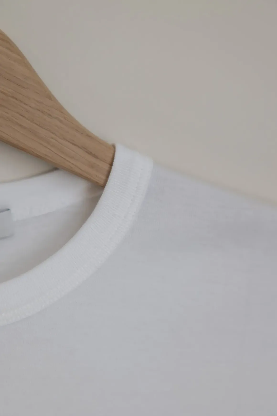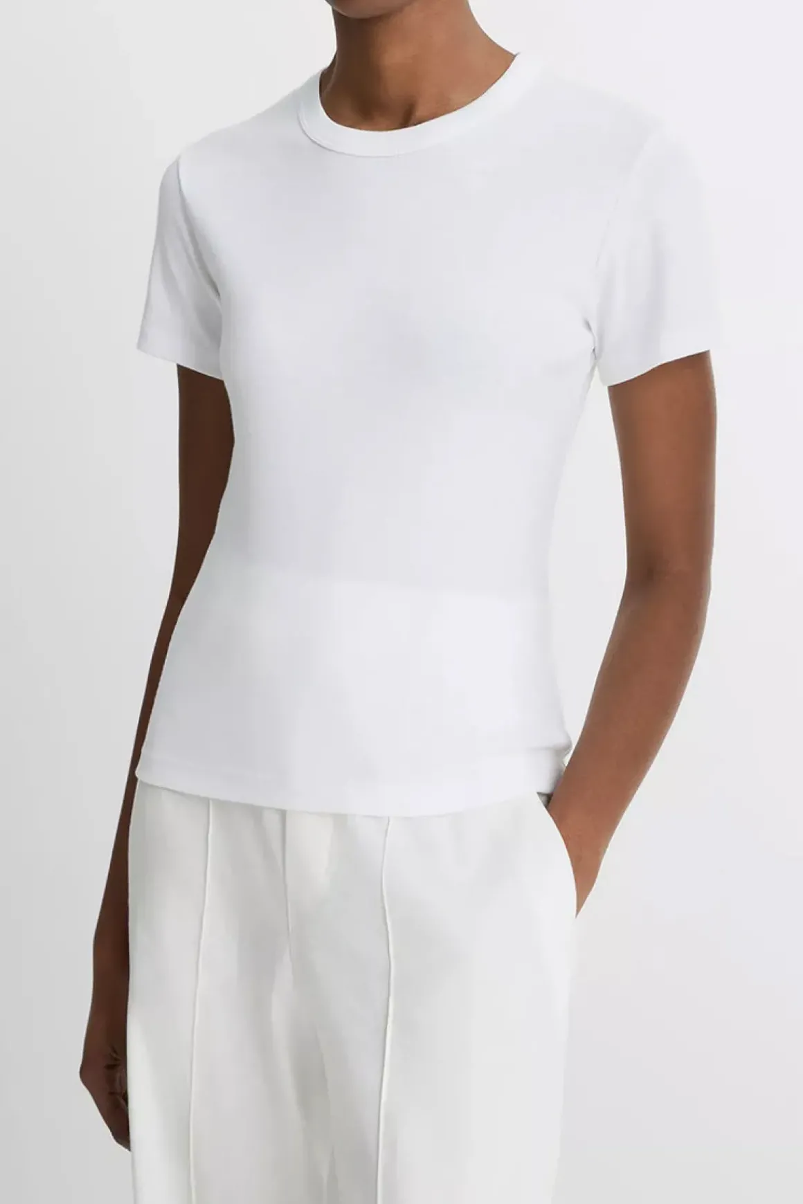 Klassisk t-skjorte fra Vince. T-skjorten er et allsidig basisplagg med kroppsnær passform og ren silhuett, inspirert av 90-tallets minimalistiske uttrykk. Den korte lengden gjør den ideell til bukser og skjørt med høyt liv, og den myke kvaliteten gjør at den føles behagelig hele dagen. Like fin alene som under en blazer.