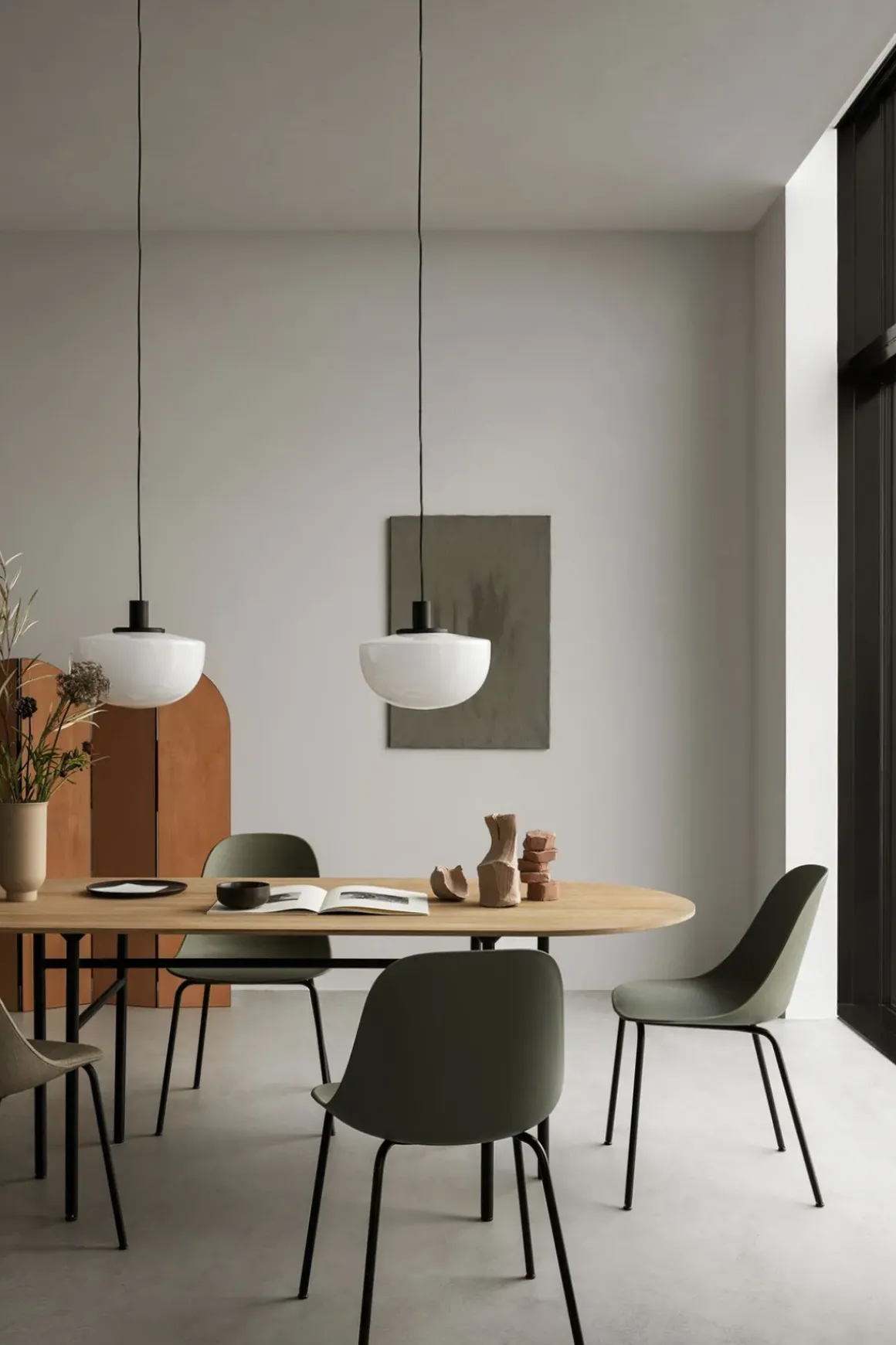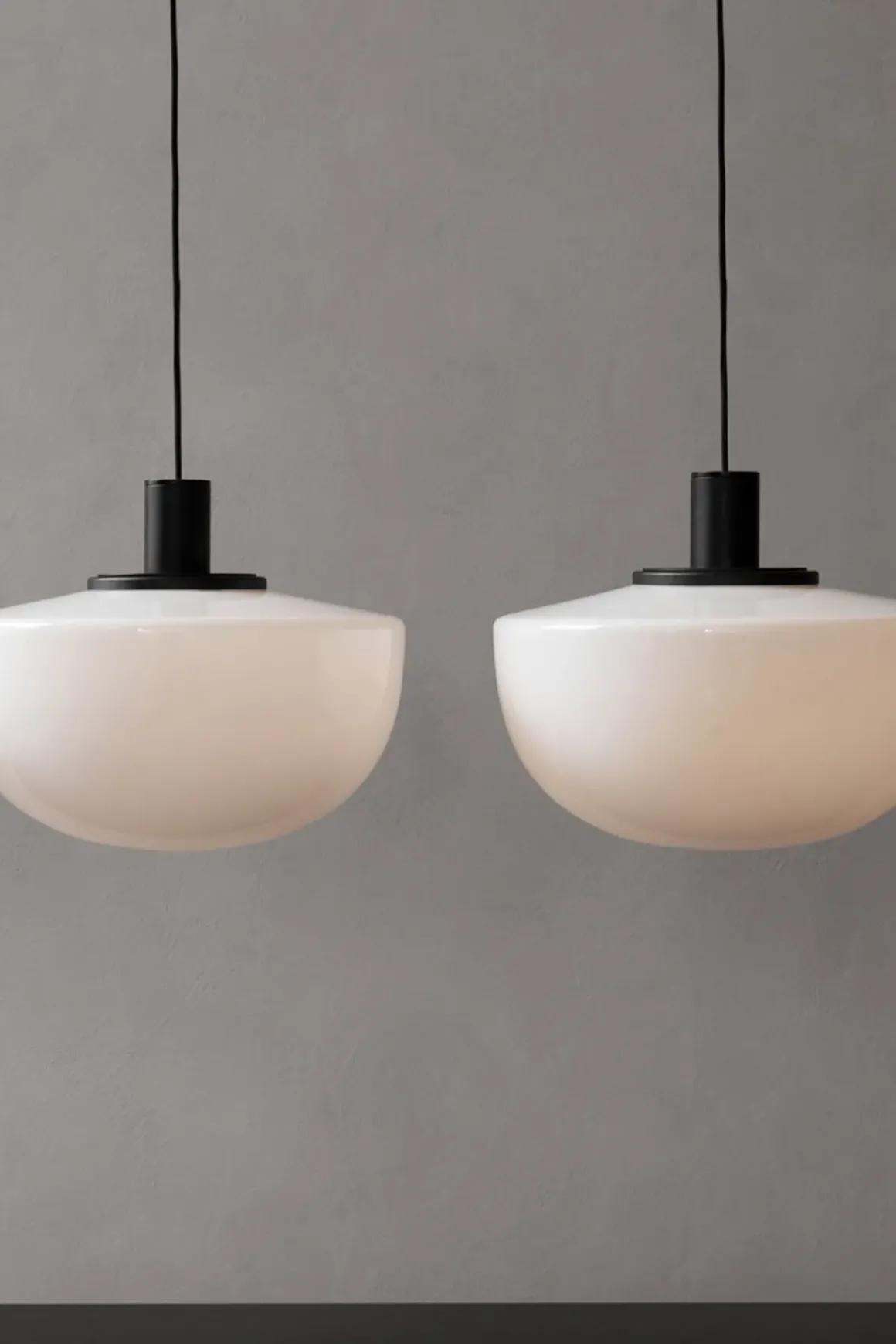 Bank Pendant taklampe, designet av Norm Architects. Lampen fås i opalglass eller grått, munnblåst glass med base av sort, anodisert aluminium. Det matte glasset gir et jevnt 360-grader lys, som tilfører en behagelig atmosfære. Bank har et tidløst, solid design og enkelt formspråk som gjør lampen til en allsidig klassiker som kan brukes i mange rom. Heng den alene eller sammen med 2-3 andre over spisebordet, på kjøkkenet, på soverommet eller i gangen.