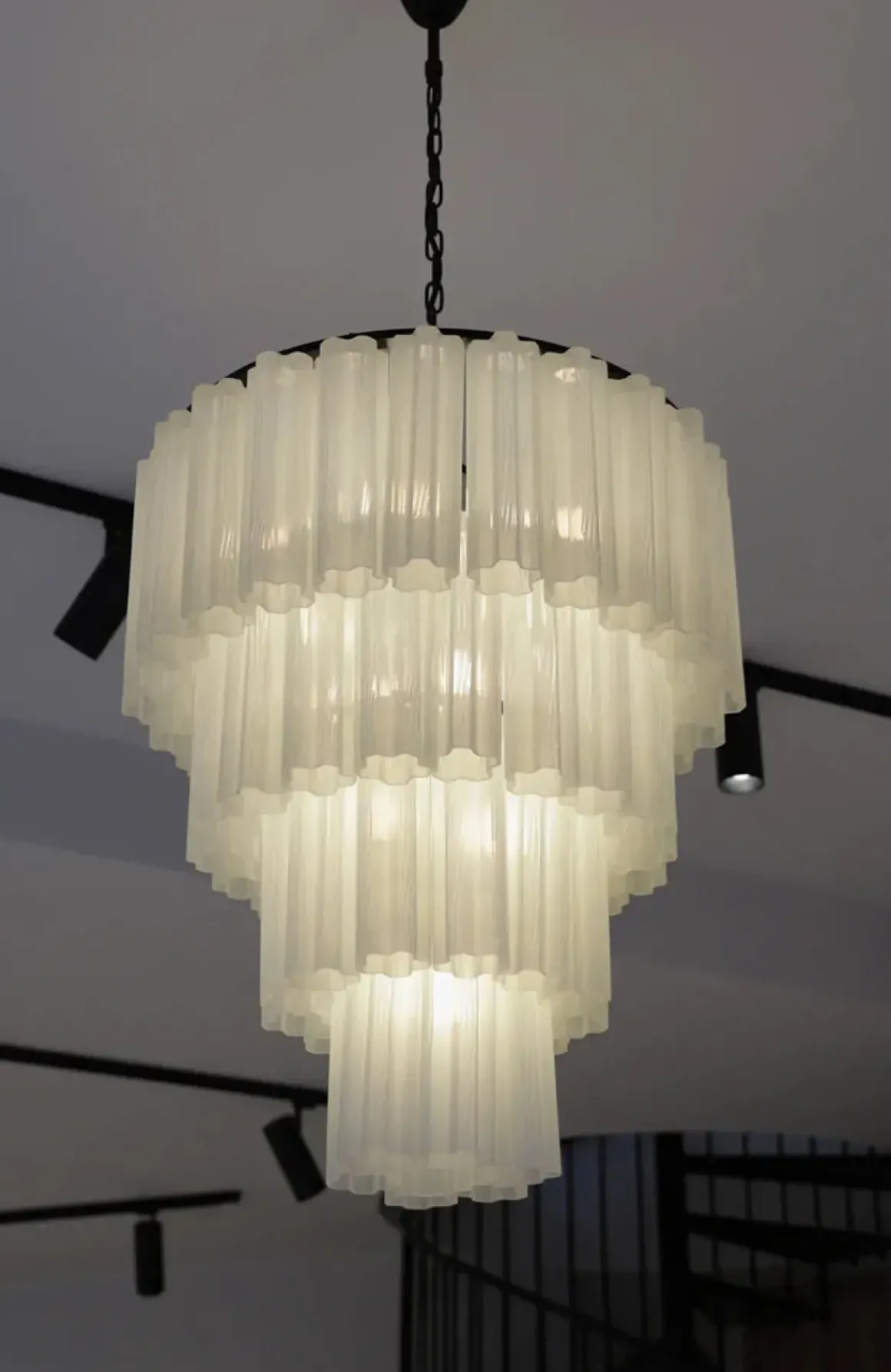Fontaine-lysekronen fra det norske merket Meublé kombinerer moderne linjer med et tidløst design. Med fire lag av glass gir den et distinkt uttrykk som umiddelbart trekker blikket. Velg mellom krom eller sort base, og mellom klart eller hvitt glass. Lysekronen passer perfekt til både spisestuen, stuen eller entreen, og skaper et innbydende lys som gir rommet en lun atmosfære.