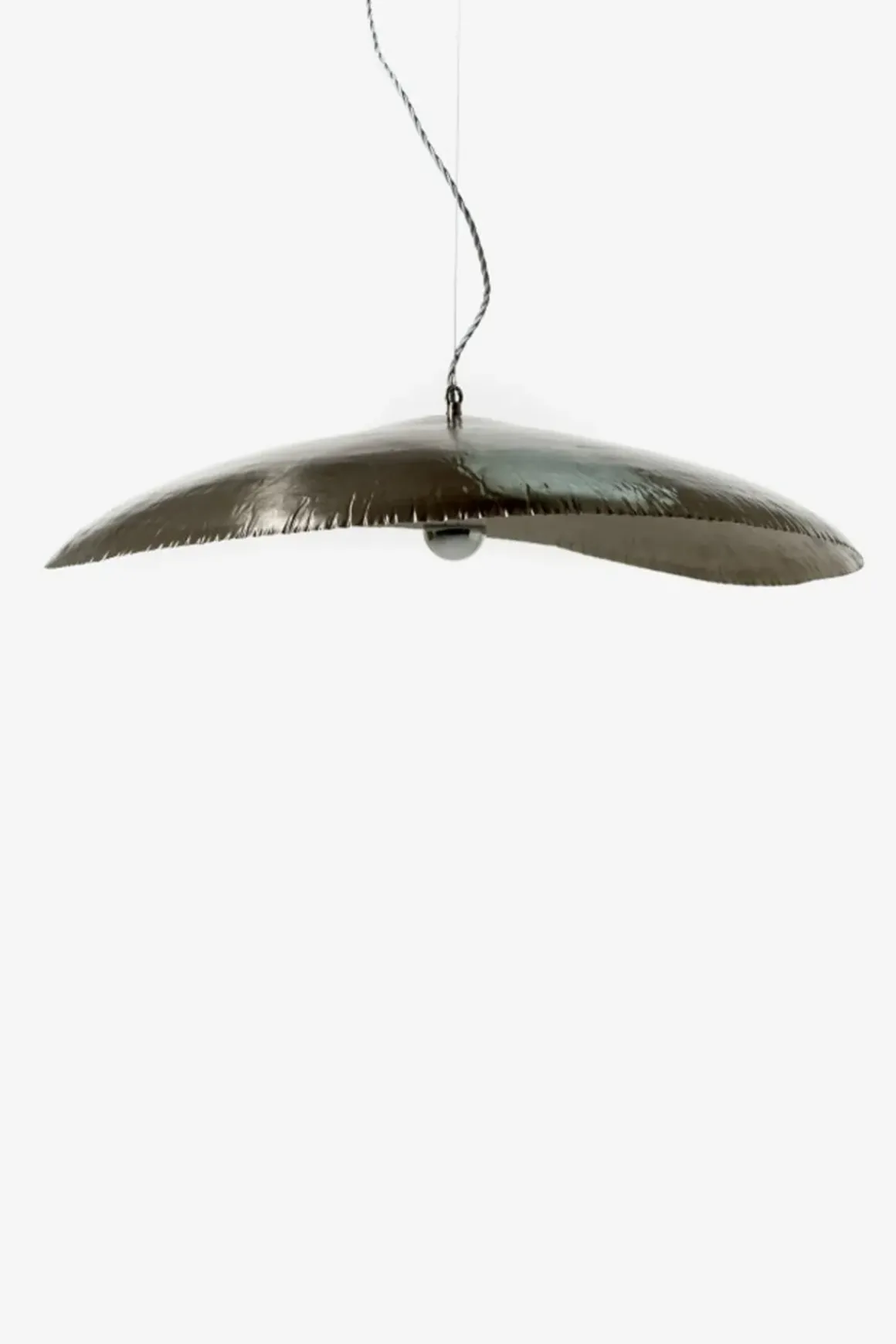 Denne fantastiske lampen designet av Paola Navone for Gervasoni, har en utpreget form laget av hamret, forniklet messing med en matt finish. Et snørehull på toppen gjør lampen lett å henge opp, og det følger med en 3 meter lang ledning. Inspirert av kunsten til en primitiv stamme har resultert i en vakker, iøyenfallende lampe som vil gi særpreg til ethvert hjem. Plasser den gjerne over spisebordet, over kjøkkenøya eller som stemningslys over sofaen. Den vil garantert være et blikkfang. Lyspære kjøpes separat.