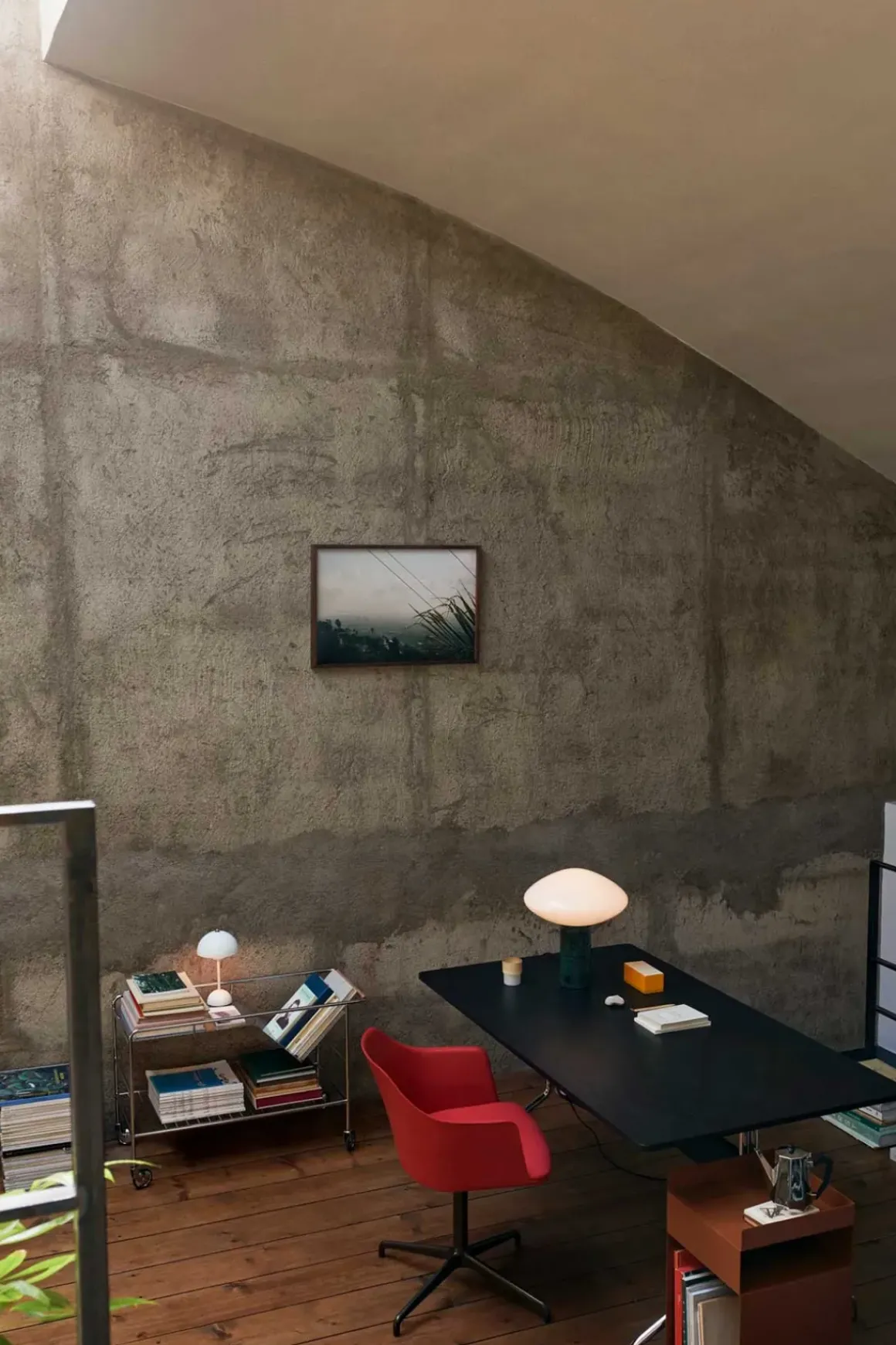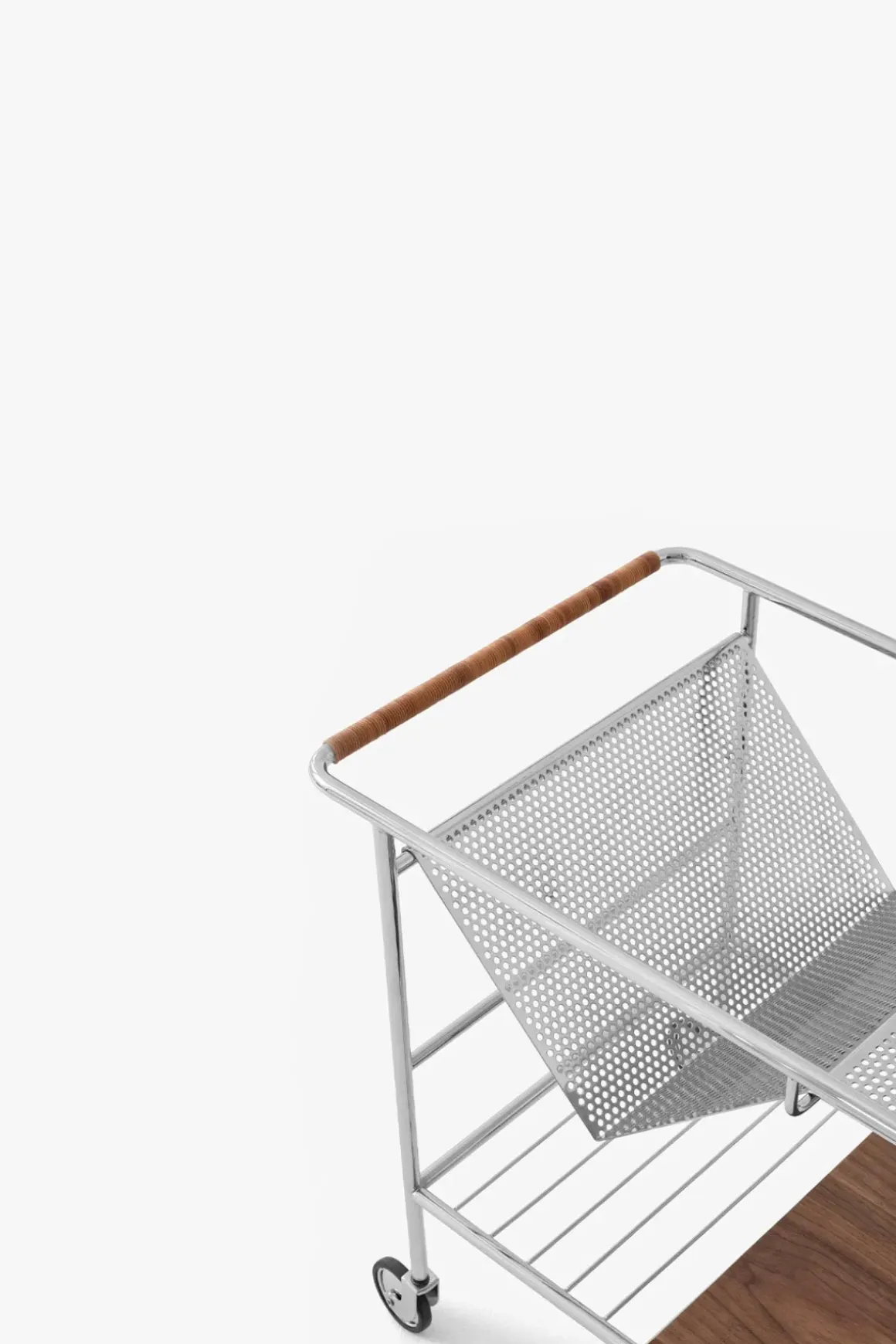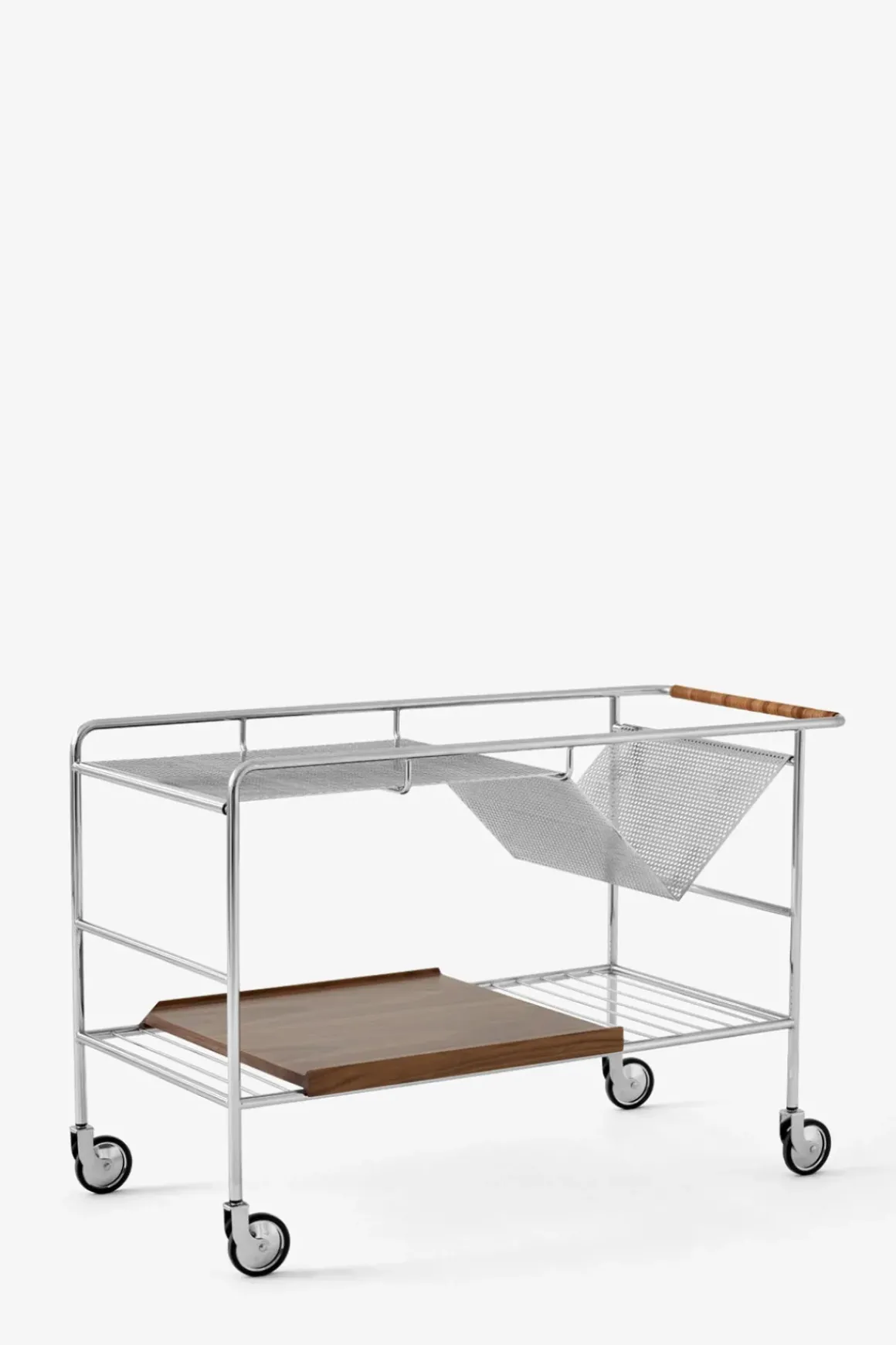 Alima Trolley trillebord i krom og lakkert valnøtt, designet av Note Design Studio for danske u0026amp;Tradition. Alima er inspirert av det «kreative kaoset» ved å jobbe hjemmefra, og resultatet ble et