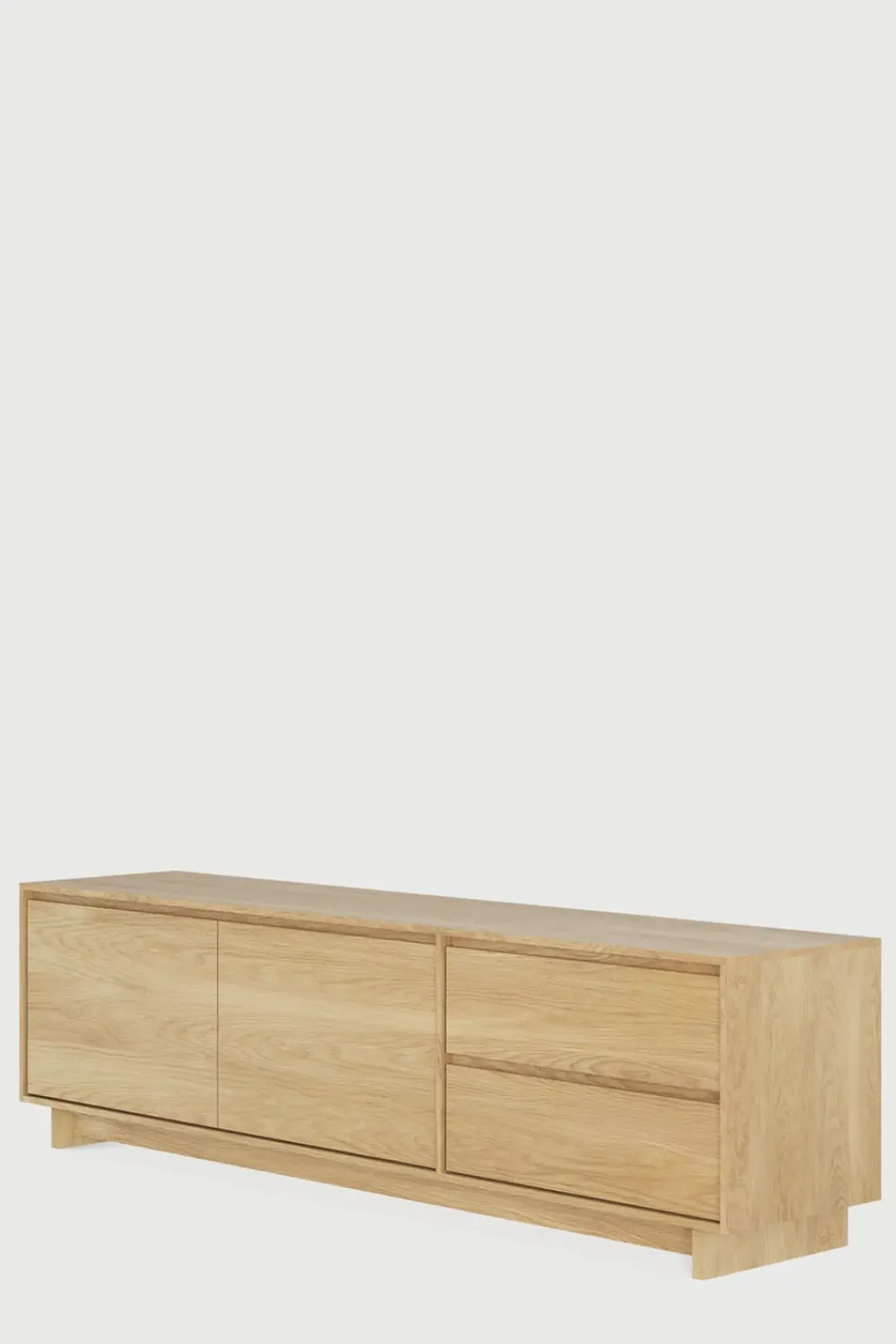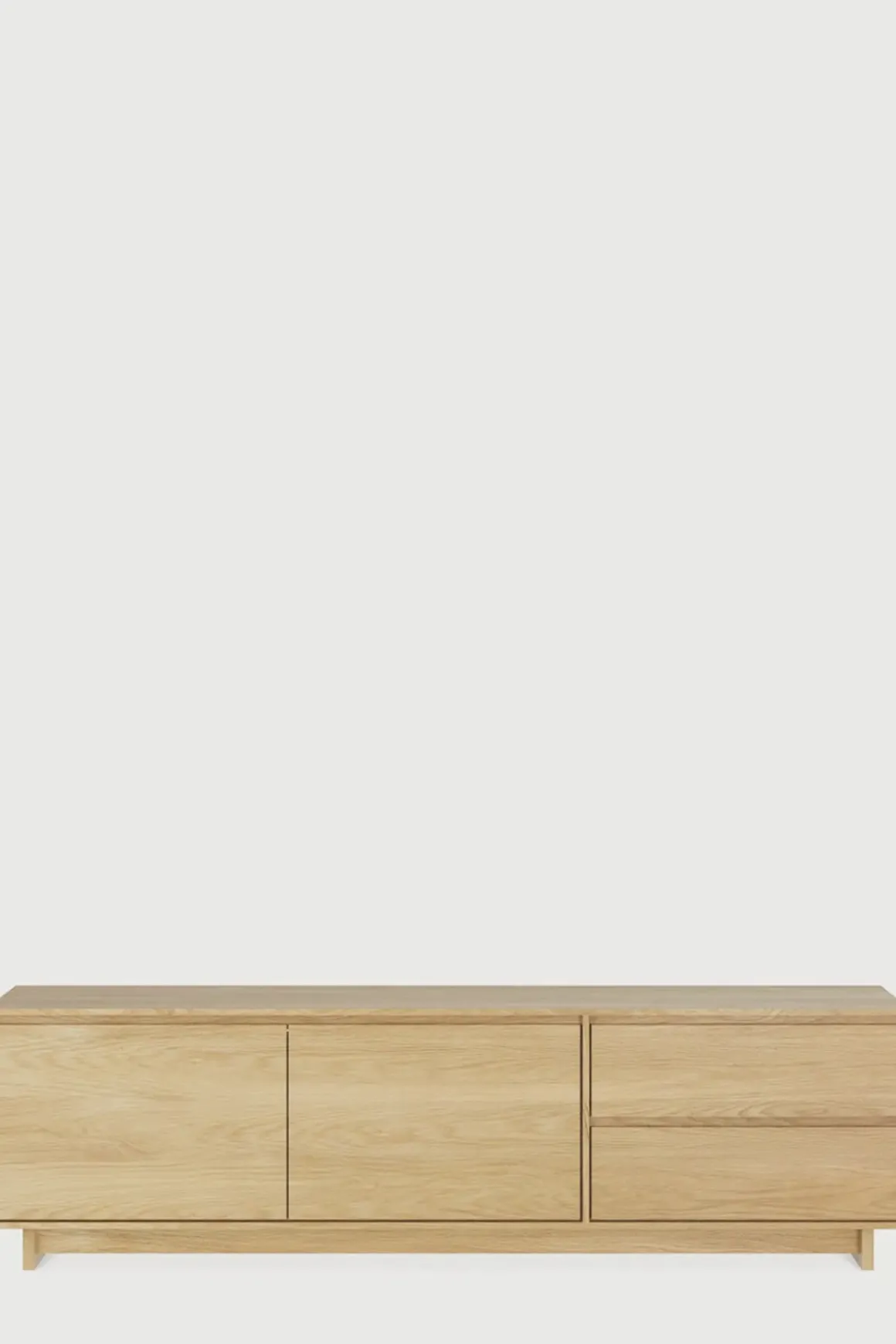 Wave TV-benk i oljet eik fra Ethnicraft. De subtile konturene til dørene og den utpregede formen på føttene er det som gjør Wave-kolleksjonen så spesiell. TV-benken har 2 dører, 1 flipp-skapdør og 1 romslig skuff. Dørene og skuffene er uten håndtak, laget av solid eik, og har en myk lukkemekanisme som framhever det solide og eksklusive håndverket. Et solid og romslig møbel som gjemmer unna tilbehør til TV og andre småting som kanskje ikke egner seg så godt på display.