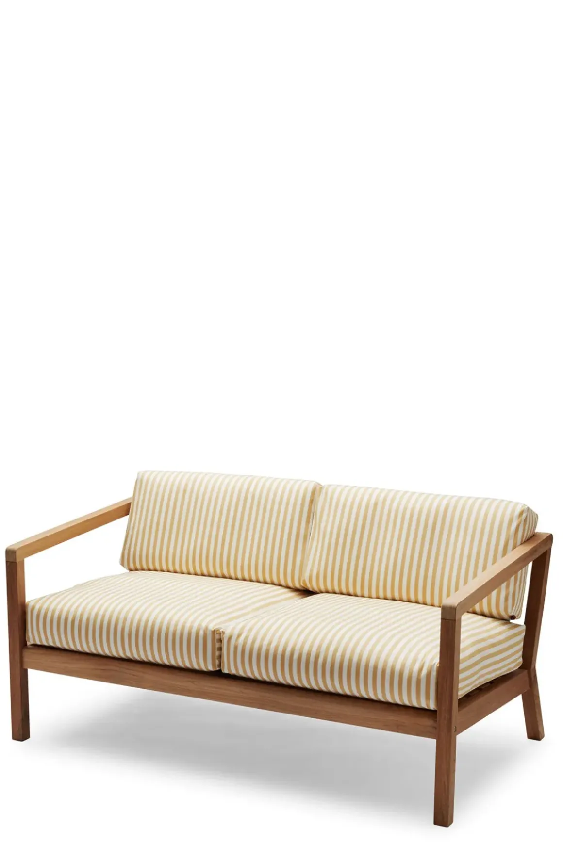 2-seter utesofa i teak fra serien Virkelyst, designet av SAYS WHO for Skagerak. Serien er perfekt for avslapning med sine tykke og myke puter. Putene tåler vind og vær, og gir ekstra komfort slik at du kan bli sittende å spise, snakke og kose deg i timesvis. Putene er polstret i eksklusivt Agora Panama-stoff som er et øko-tex-sertifisert og farget akrylstoff. Akrylfiberen skaper et syntetisk, men bomullslignende stoff med funksjoner i verdensklasse for utendørs bruk, noe som gjør det både svært farge-og lysfast, vann-og smussavvisende, muggbestandig og er samtidig fri for skadelige stoffer. De gode putene er fylt med det unike materialet fossflakes; hypoallergenisk, lett å vedlikeholde og opprettholder putens volum og form over lang tid. Selve møbelet er laget av solid og vakker teak. Kombiner gjerne med andre møbler fra Virkelyst-serien for en komplett look.