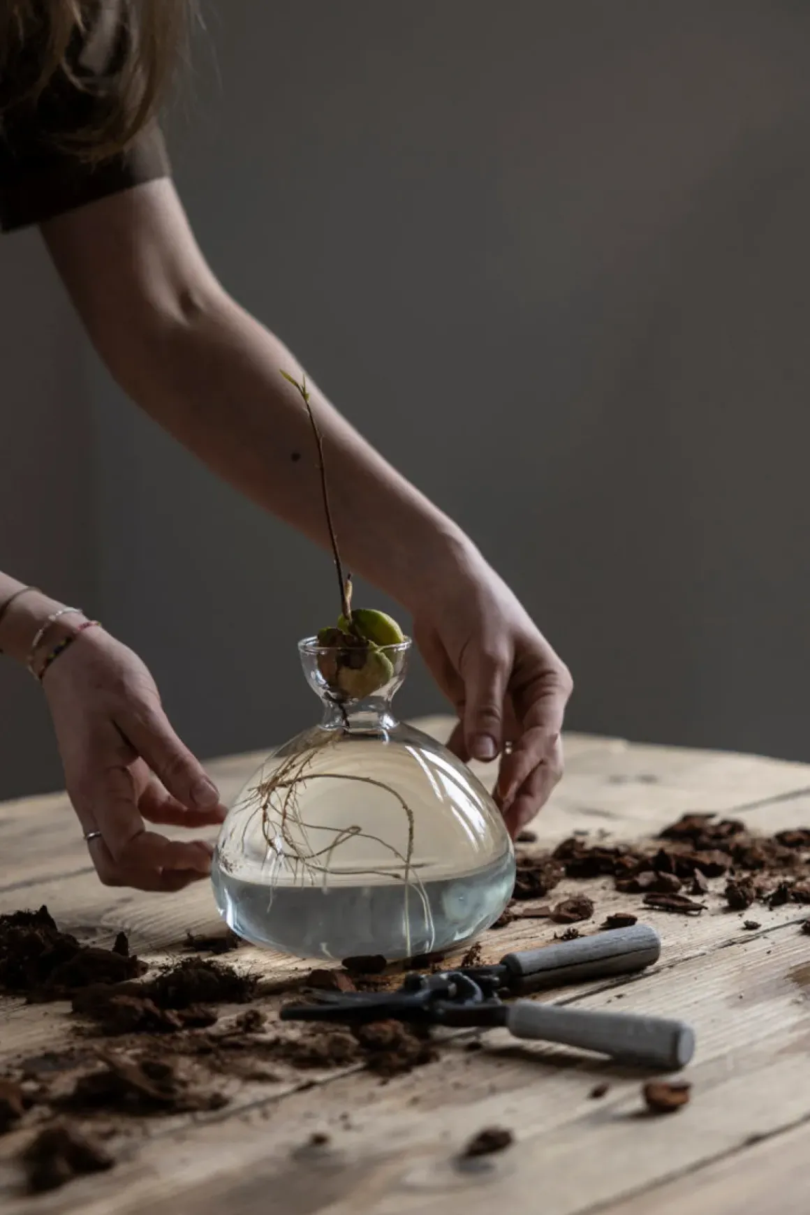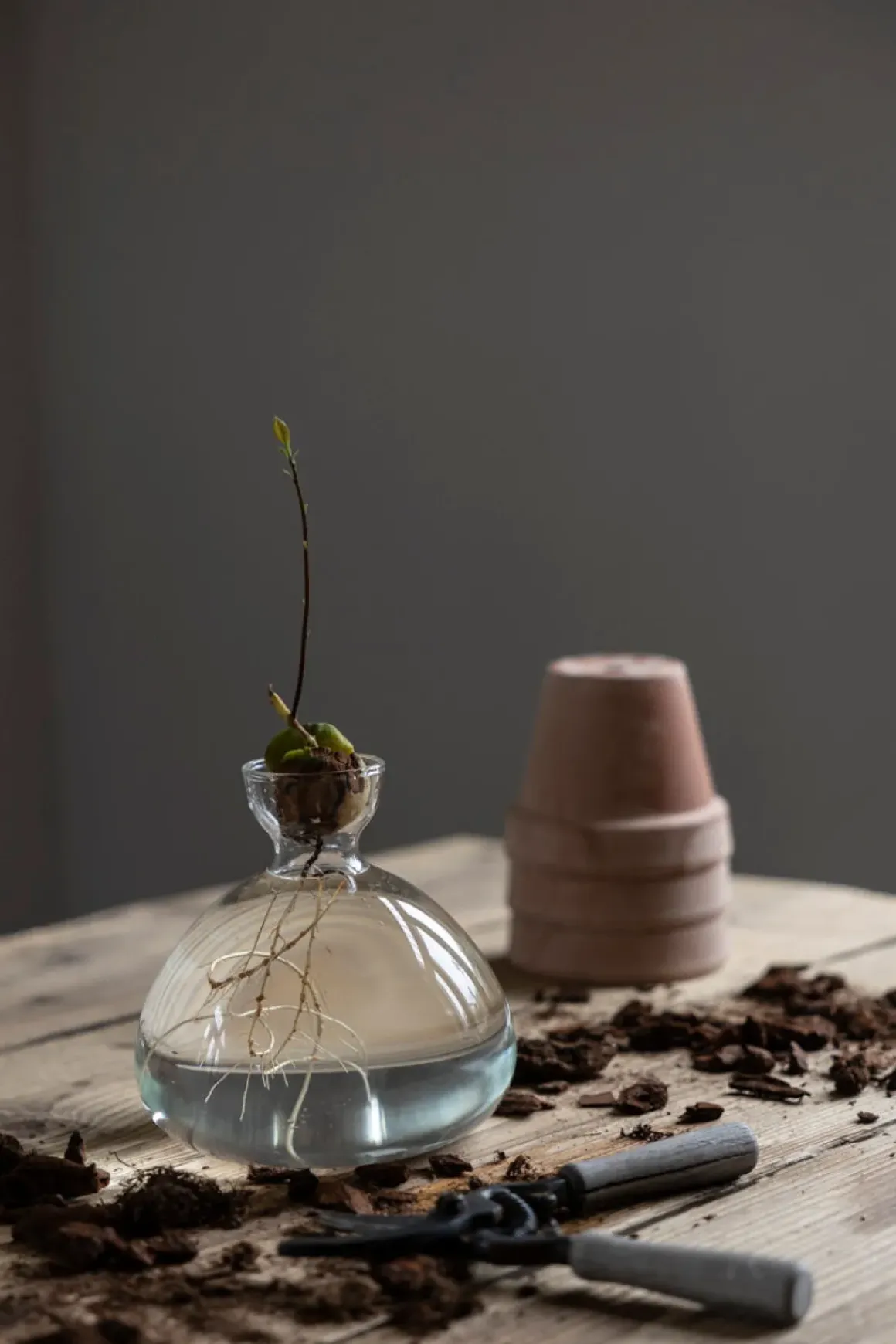 Avokadovasen fra Ilex Studio lar deg enkelt dyrke din egen avokadoplante med stil og enkelhet. Med sitt minimalistiske og tidløse design lar vasen deg observere avokadofrøet mens det spirer og utvikler seg, uten behov for tannpirker. Den bølgeformede vasen forsterker røttene og skaper et vakkert fokuspunkt i hjemmet ditt. Inkluderer en 36-siders håndbok med detaljerte instruksjoner og nyttige tips. Laget av borosilikatglass og pakket i resirkulert kartong. Perfekt for alle plantefrelste og designentusiaster.