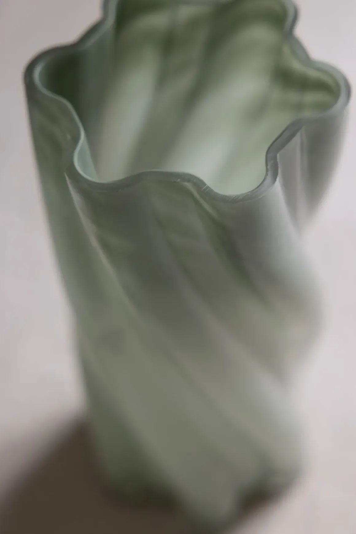 Vasen i grønt glass. Vasen har en slående vridd form som gir den en følelse av bevegelse og flyt. Den dype grønnfargen sammen med den vridde overflaten skaper et spennende og unikt uttrykk. Vasen er perfekt for større blomsteroppsatser eller som et dekorativt element som står alene, og fargen tilfører en naturlig og avslappet stemning til rommet.