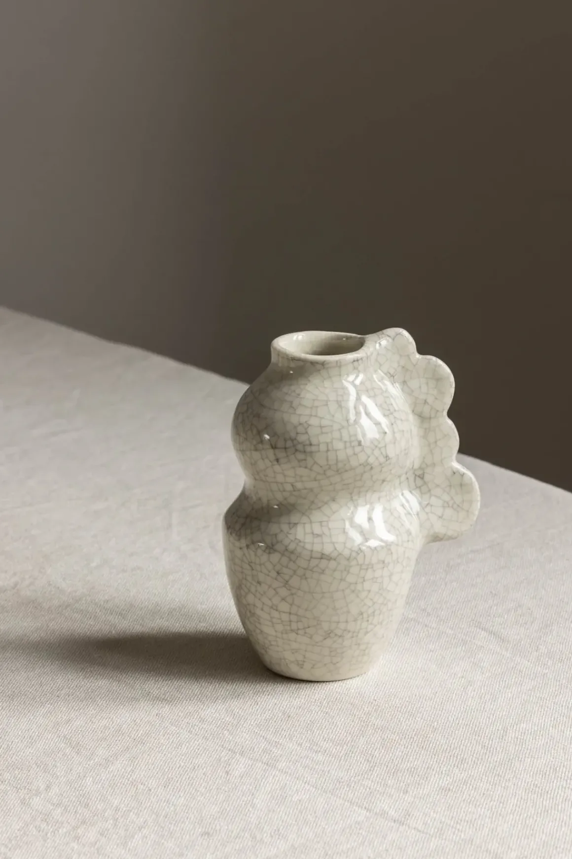 Liten, skulpturell vase fra Jars Céramistes som er skapt for å fange magien i hverdagslige øyeblikk. Perfekt for små buketter av markblomster eller strå, tilfører den et kunstnerisk og personlig preg til ethvert rom. Den unike formen og den vakre kvarts-craquelé-glassuren skaper en iøynefallende kontrast, med fine, sprekkdannede detaljer som gjør vasen til et lite kunstverk. Hver Médée-vase er håndlaget i Drôme-regionen i Sør-Frankrike, der Jars Céramistes har dype røtter i håndverkstradisjonen. Vasen er dekorativ i seg selv, men kan også kombineres med andre vaser i forskjellige former og teksturer for å skape grafiske komposisjoner. Glasuren er påført for hånd, lag for lag, noe som gir den et unikt, levende uttrykk. Médée er en nydelig liten keramikkvase som tilfører sjarm og karakter til hjemmet, samtidig som den hedrer enkelheten i naturens små gleder.