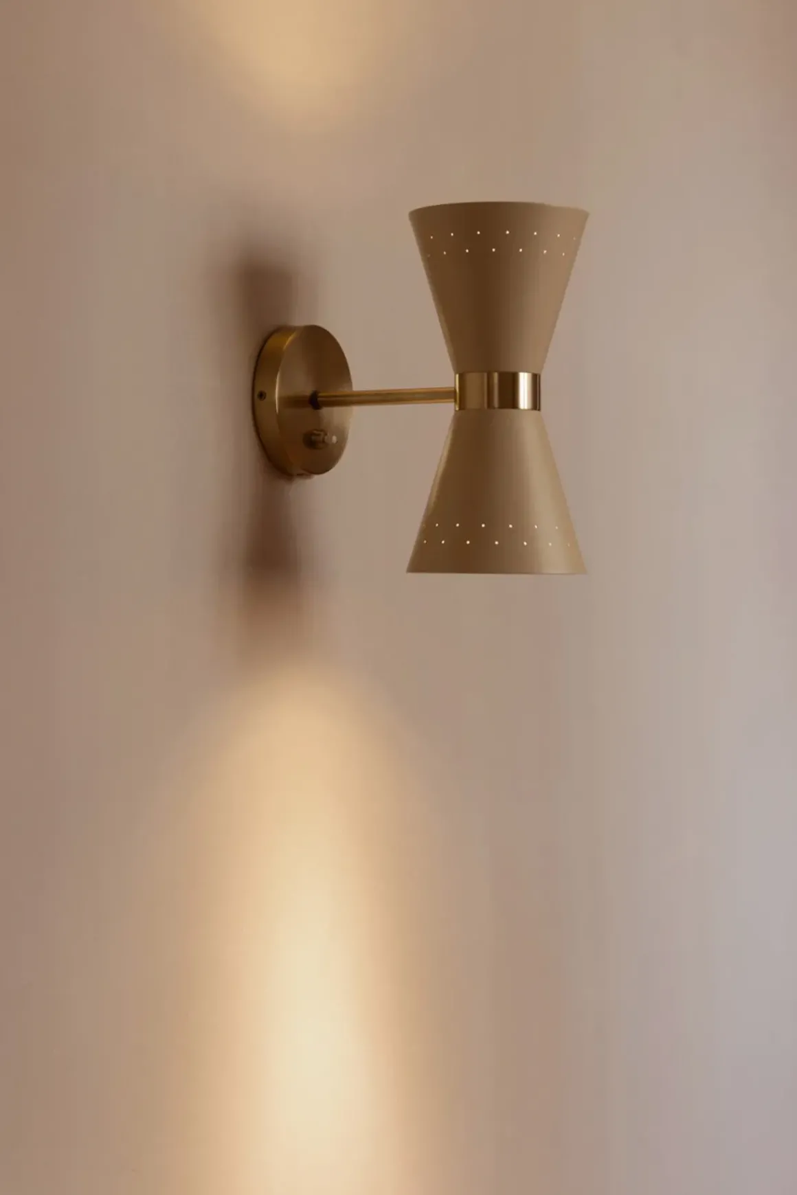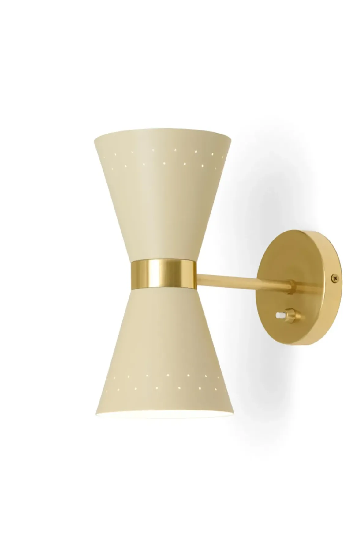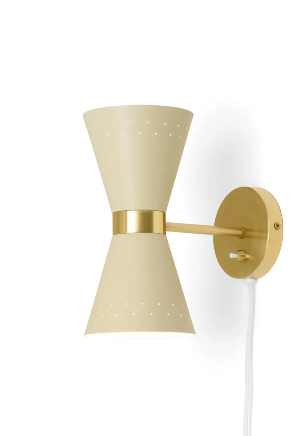 Collector vegglampe designet av Alf Svensson på 1950-tallet. Den veggmonterte lampen er ett av tre design i serien, definert av det solide messingbåndet som holder en konisk, kremfarget metallskjerm som projiserer lyset i to retninger. Små perforeringer i skjermen lar lyset skinne igjennom og tilfører en lunhet til belysningen. En designklassiker som gir et sofistikert preg på interiøret og kan fint kombineres med taklamper fra samme serie eller brukes alene. Perfekt som soveromsbelysning, i gangen, på kjøkkenet eller i stua.