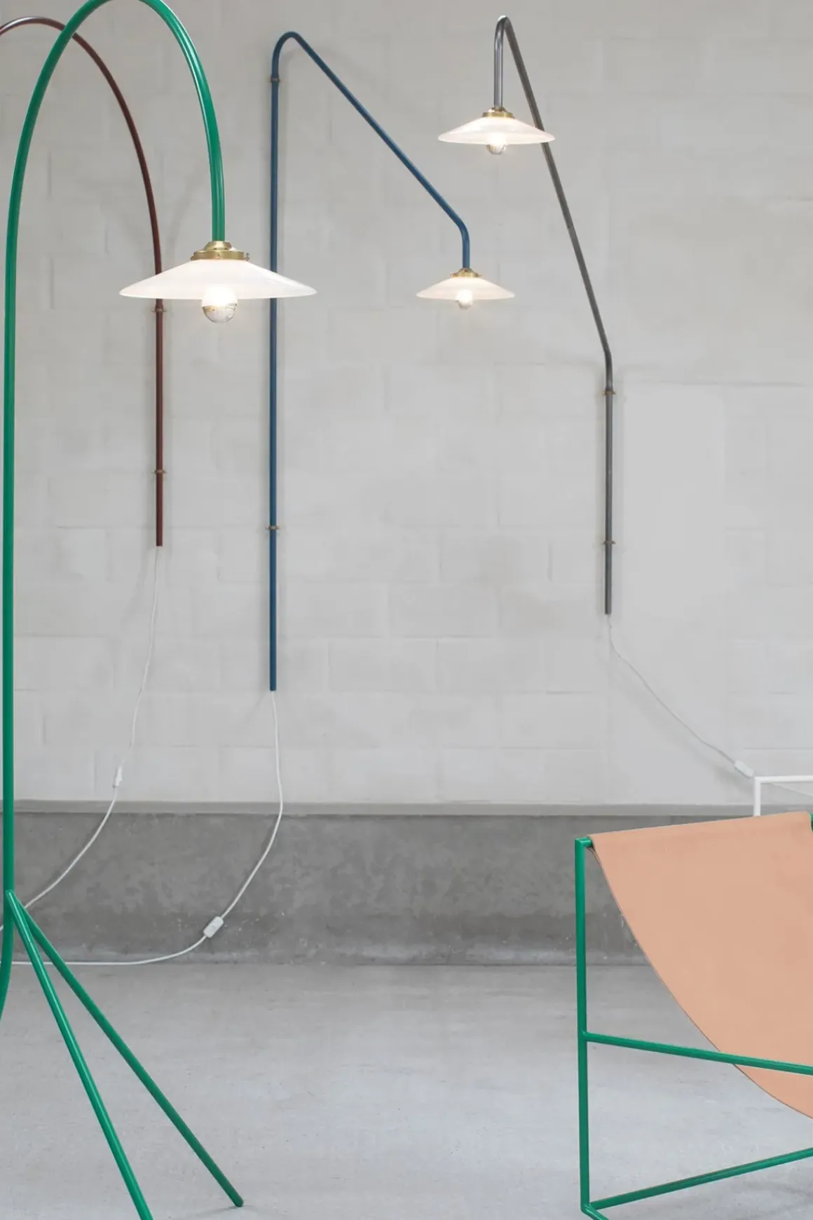 Hanging Lamp vegglampe N°4, designet av Muller Van Severen for Valerie Objects. Hanging Lamp-serien har et naivt og lekent formspråk i sterke farger og er laget av pulverlakkert stål eller messing med en enkel lampeskjerm i hvitt glass. Lampene er sofistikerte med en industriell look og et ukomplisert og ærlig design. La den henge over spisebordet, sofaen, sengen eller i gangen, og la fargene tilføre liv og lekenhet til innredningen. Siden Hanging Lamp kommer i flere ulike varianter og størrelser, kan du finne den perfekte match til ditt hjem.