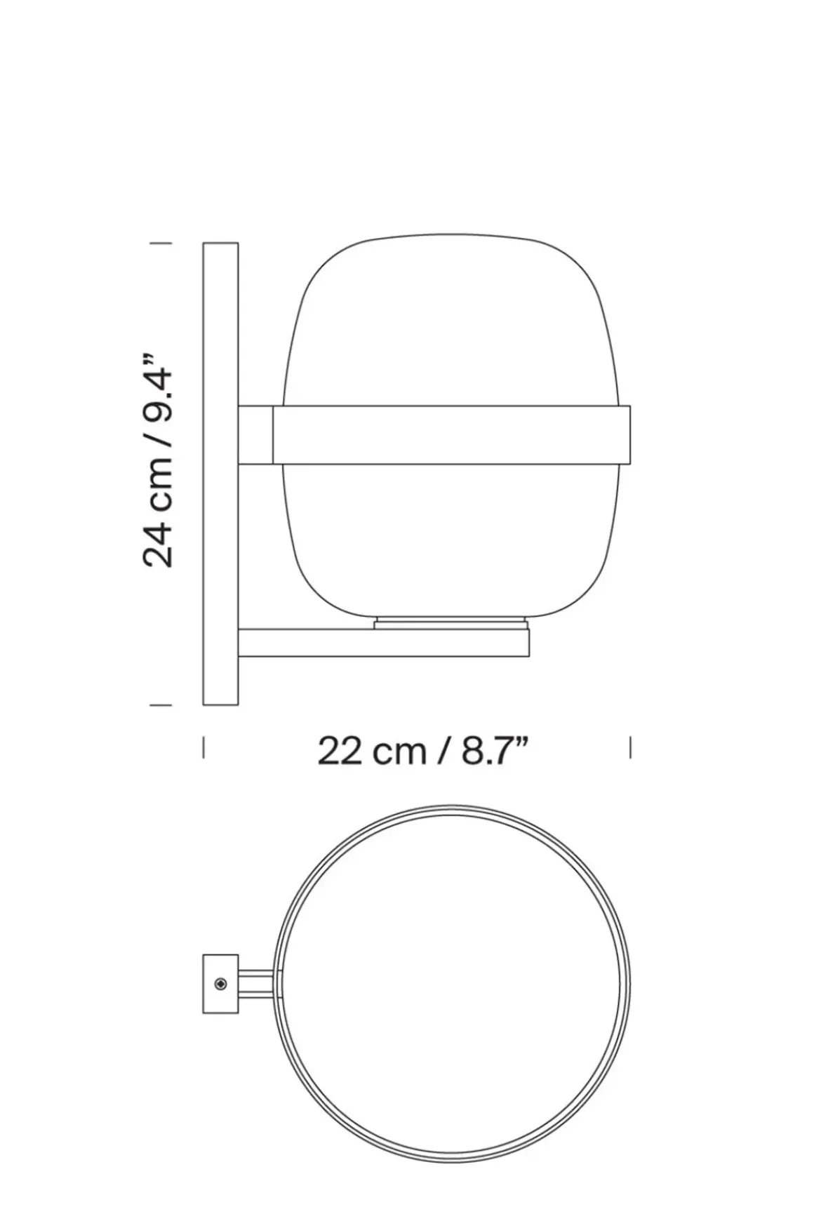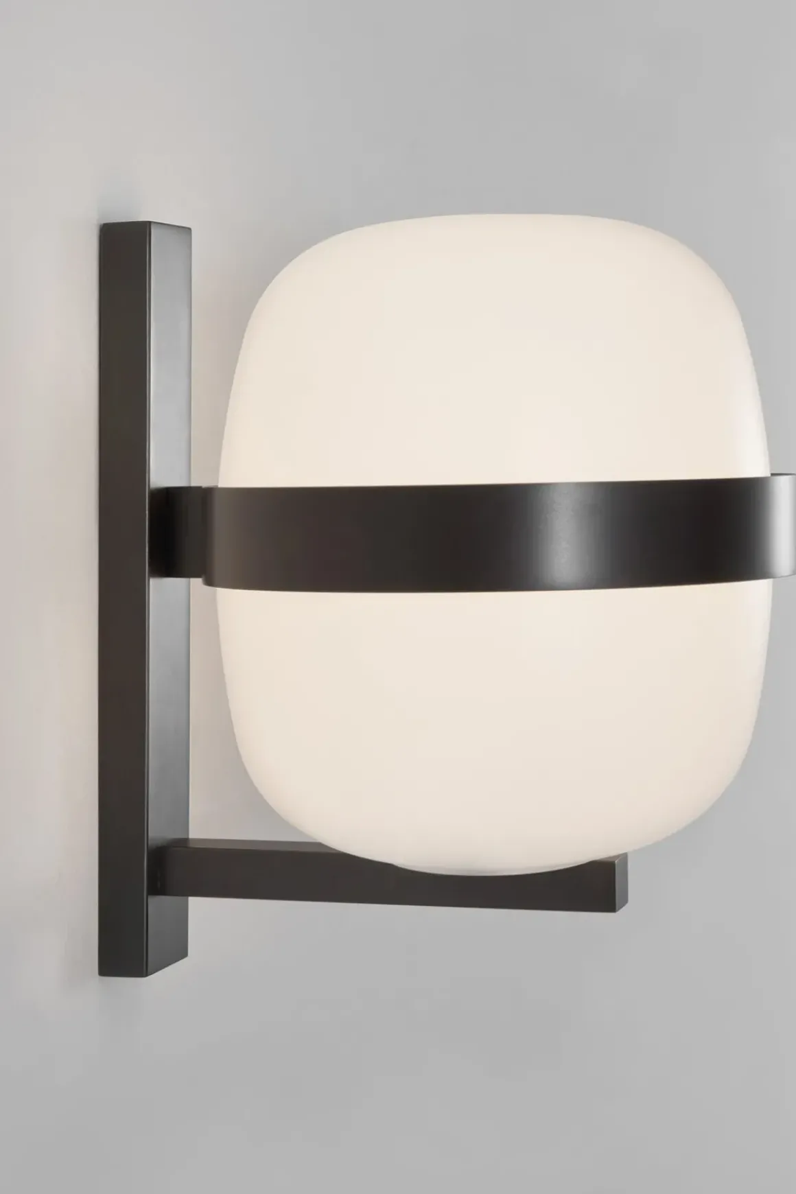 Wally vegglampe fra Santa u0026amp; Cole designet av Miguel Milá. Wally er en ikonisk vegglampe, designet samme år som de kjente Cesta-lampene til Milá. Lampen er basert på samme design med struktur av sort bronse, som vikler seg rundt en oval kuppel av opalglass. Festes til veggen med metallramme. Lampen gir et diffust og behagelig lys, som er like fint inne som ute. Bruk i gangen, ved siden av sengen, i stuen eller på terrassen.