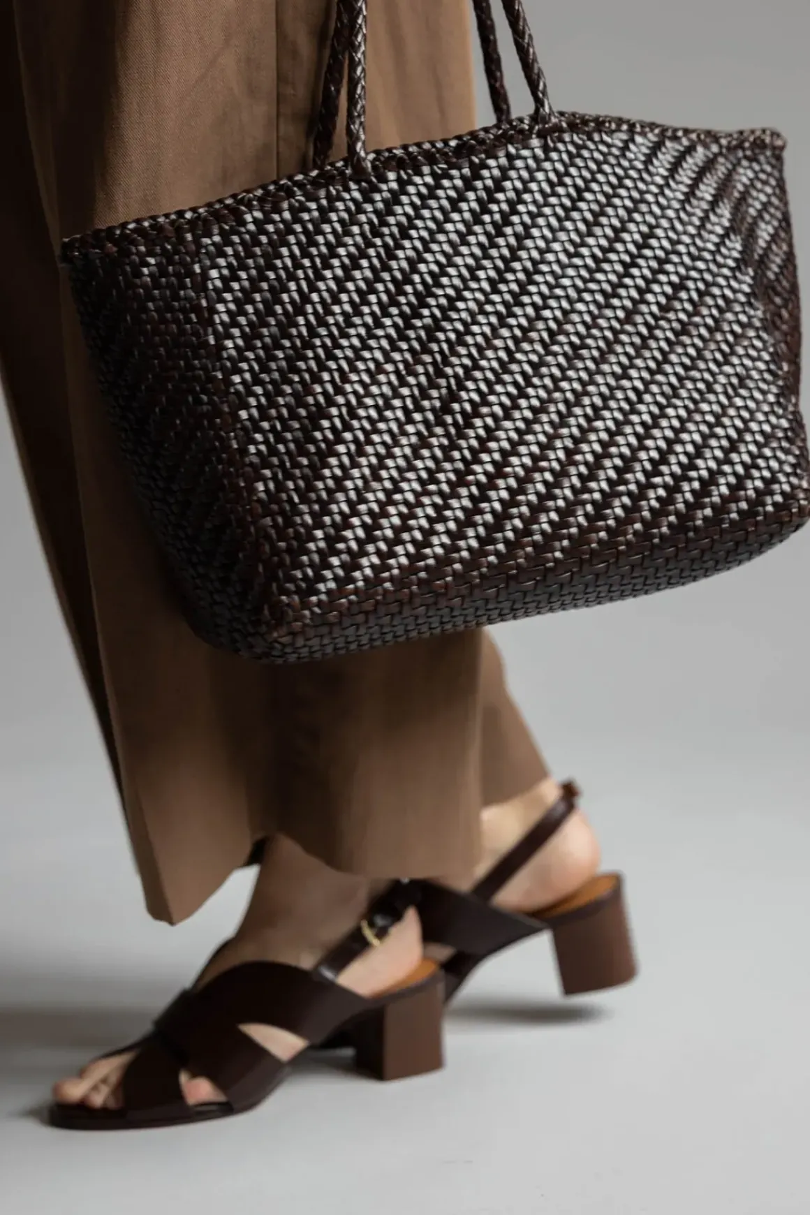 Basket Big Dark Brown-vesken er laget av uregelmessige vevestropper i skinn som vider seg ut mot kanten, og skaper en praktisk fasong som er ideell når du er på farten. Basket Big Dark Brown holder fast ved tradisjonelle veveteknikker, og er uforet med en åpen topp for et enkelt uttrykk.