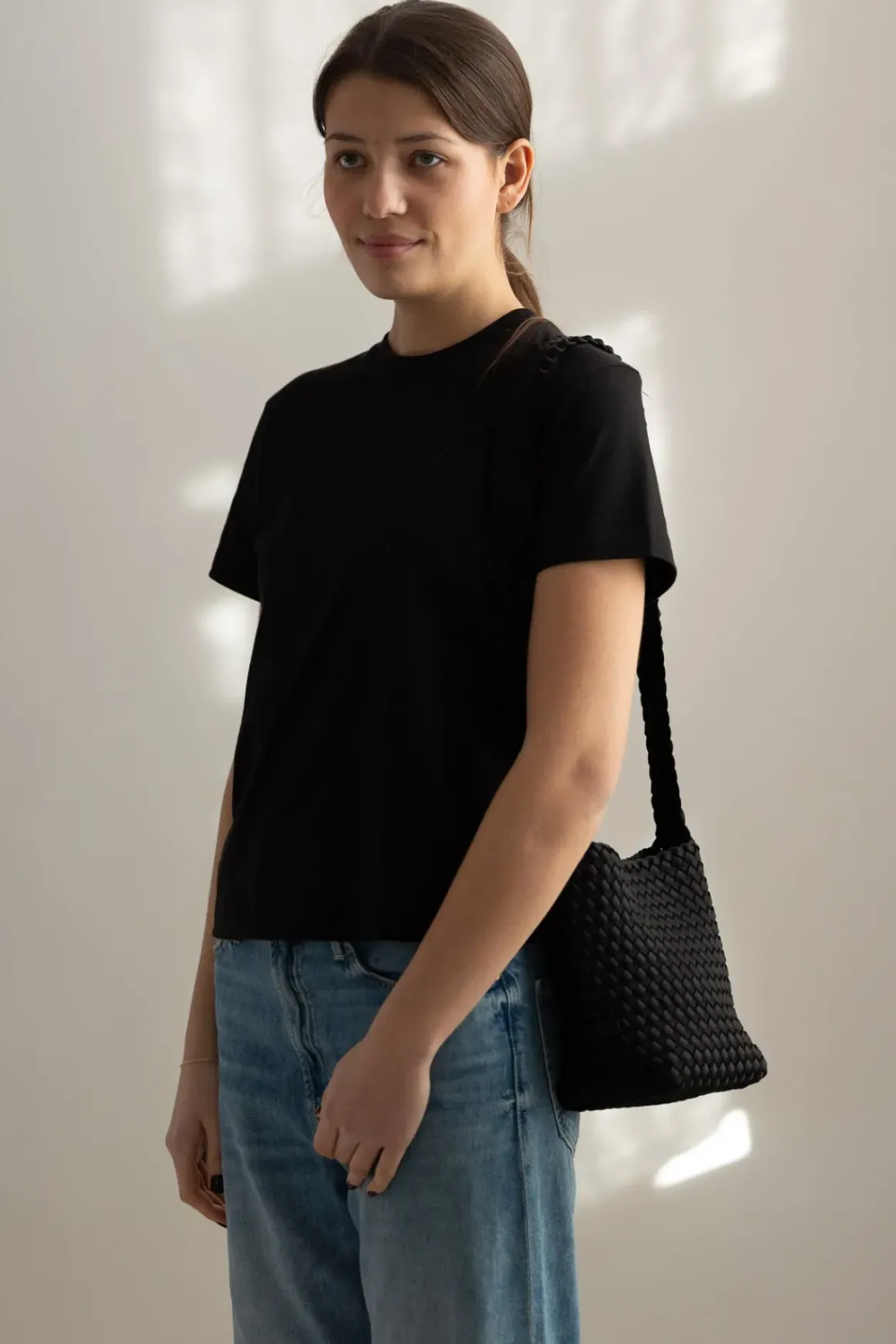 Stilren og praktisk crossbody-veske i mykt håndvevd neopren. Laguna har en skulderrem som er designet litt kortere; da den vil gradvis strekke seg til perfekt lengde ved bruk. Magnetlukking og et romslig hovedrom med innerlomme – perfekt for hverdagsbruk.
