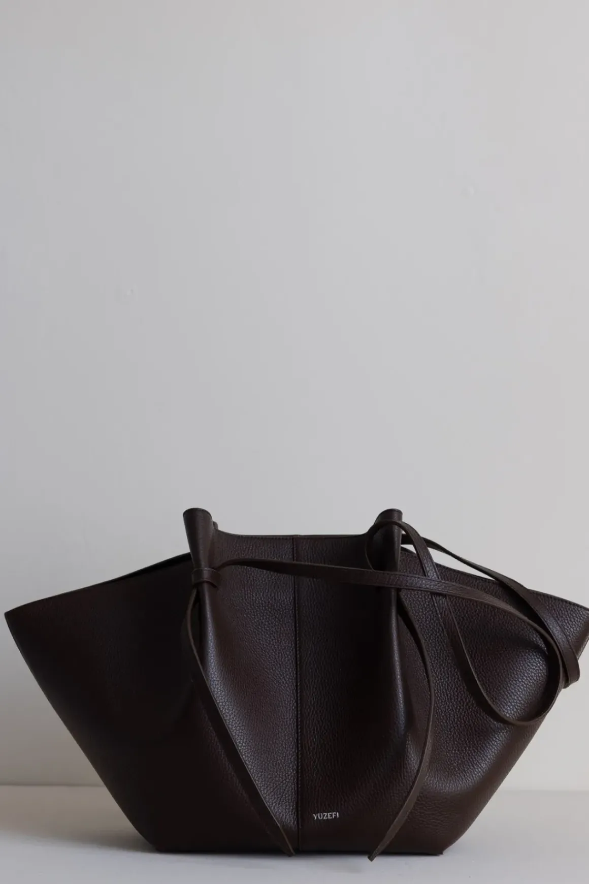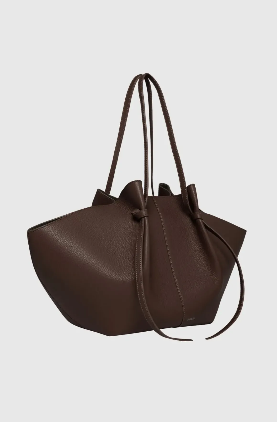Mochi skulderveske i den største modellen i en nydelig Espresso farge. Den har de karakteristiske organiske formene, myke folder og knutedetaljer. Vesken er laget av eksklusiv italiensk skinn, og har justerbare stropper som lar deg bære den i hånden eller over skulderen. Den lukkes enkelt med en magnet og har plass til alt du trenger i hverdagen.