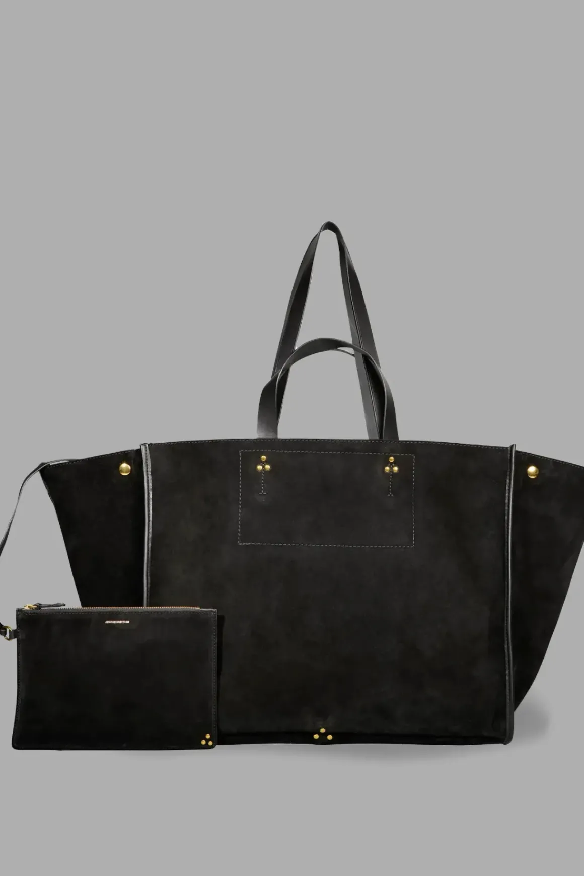 Leon L Noir Split Suede er en stor veske fra Jerome Dreyfuss i svart splittet semsket skinn. Vesken har fire håndtak i to lengder i skinn på toppen av vesken og kan brukes både som håndveske og skulderveske. Vesken lukkes med skinnklaffer med trykknapper. Organisert veske med et stort rom og en skinnpung hengende på en lenke inni. Denne vesken er perfekt å bruke til og fra jobb/skole, på reise og andre anledninger du trenger å ha med deg litt stæsj.