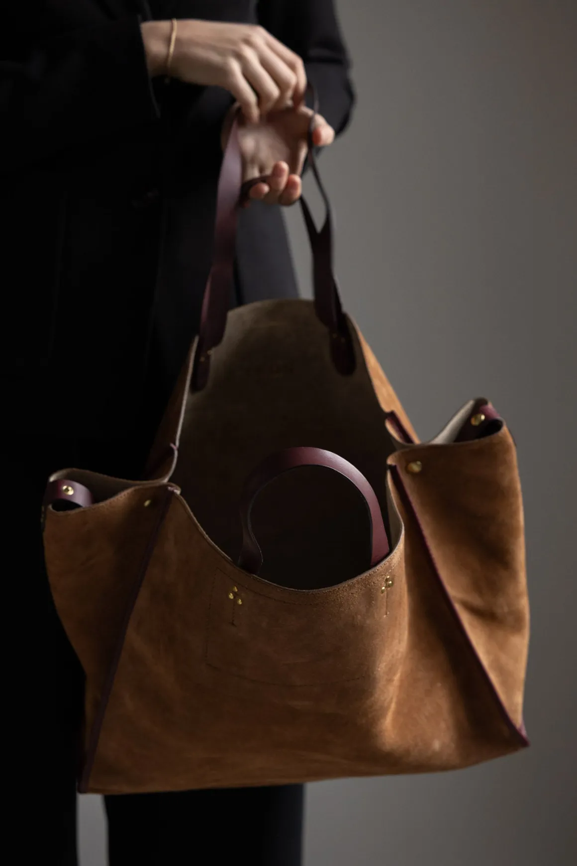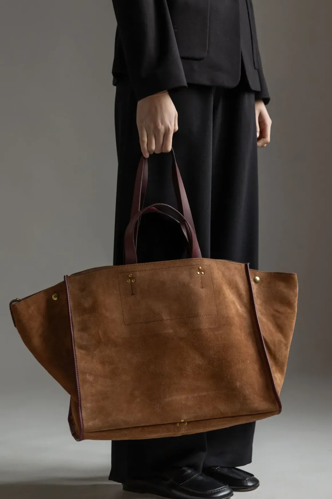Leon L Noir Split Suede er en romslig veske fra Jerome Dreyfuss i brunt splittet semsket skinn. Vesken har fire håndtak i to lengder i skinn på toppen av vesken og kan brukes både som håndveske og skulderveske. Vesken lukkes med skinnklaffer med trykknapper. Leon-vesken er perfekt å bruke til og fra jobb/skole, på reise og andre anledninger når du trenger å ha med deg litt stæsj. Skinn får en naturlig patina over tid, som bare vil gjøre vesken finere – og vi håper du kommer til å elske din Leon i veldig mange år.