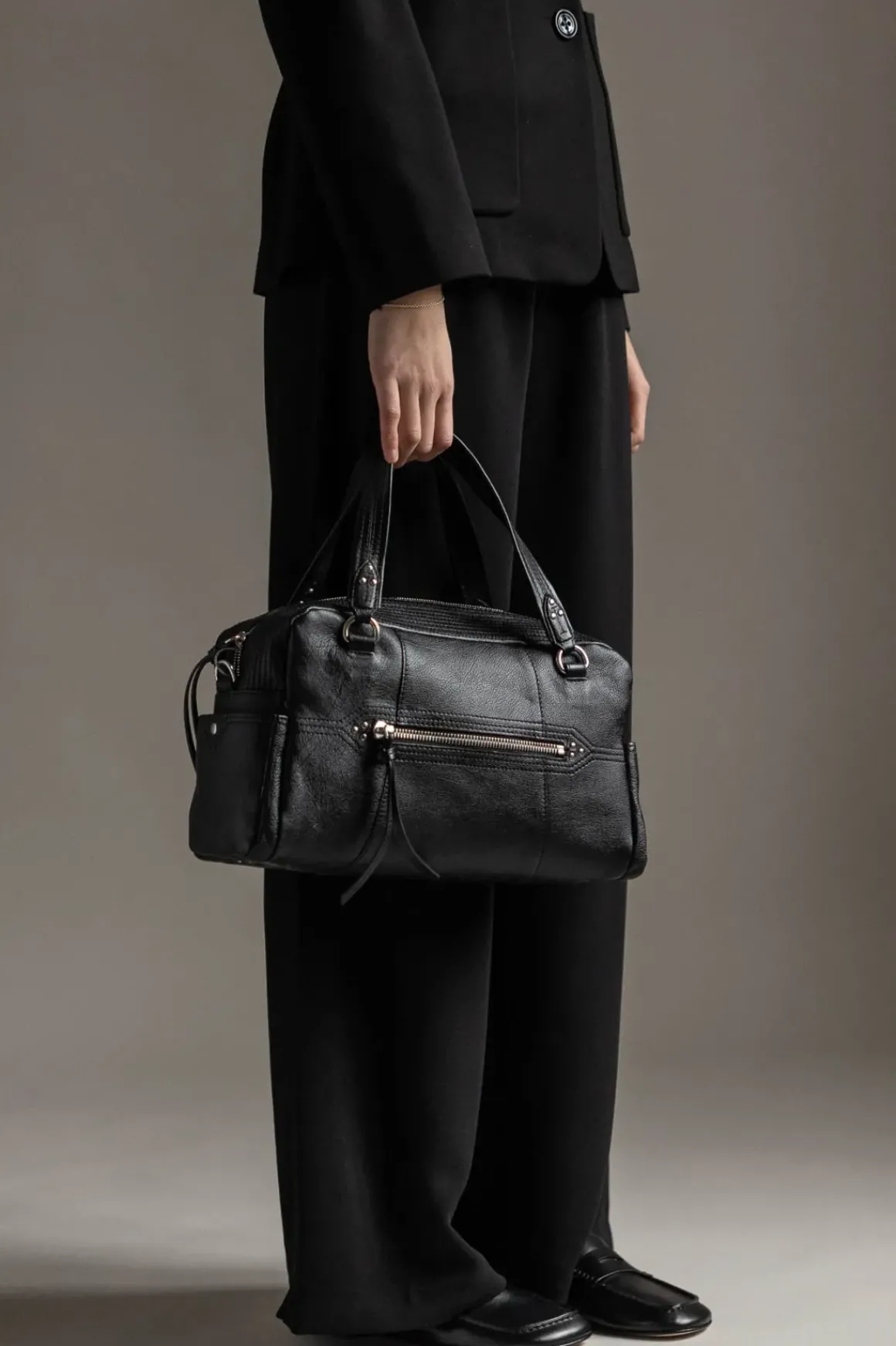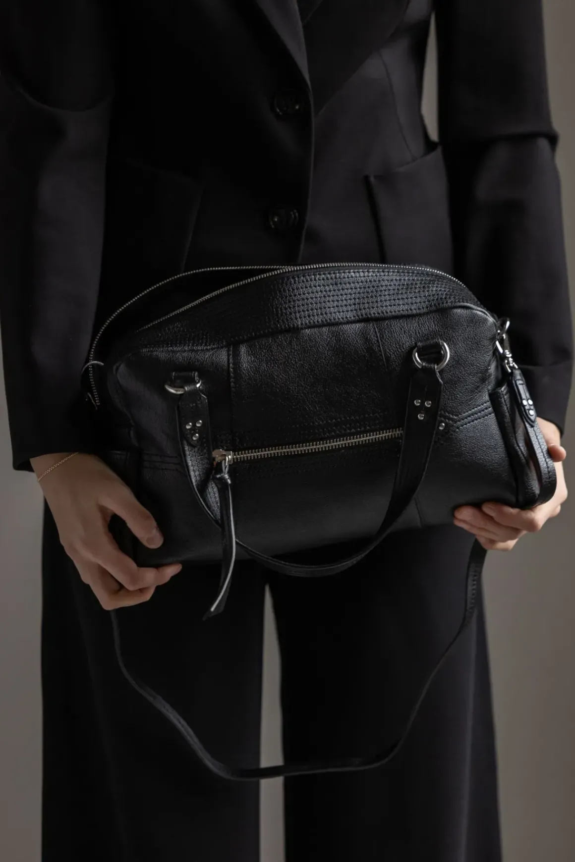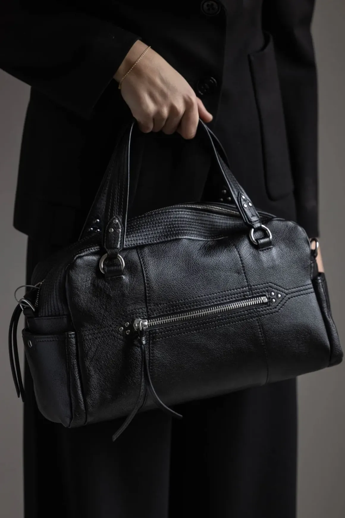 Bowlinginspirert veske fra Jerome Dreyfuss som både er allsidig og praktisk. Den kan bæres over skulderen, crossbody eller for hånd, med en avtakbar skulderstropp og solide håndtak som gir fleksibilitet i bruk. Glidelåslukkingen med skinnsnorer og de gjennomtenkte lommene, både innvendig og utvendig, gjør det enkelt å holde orden.