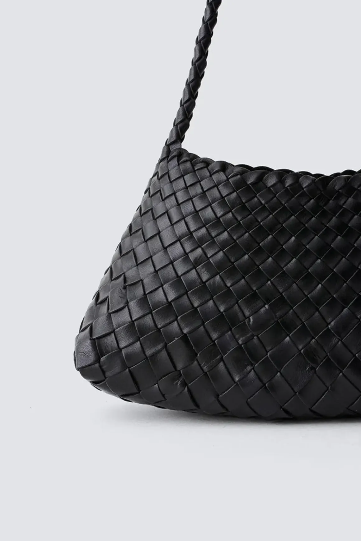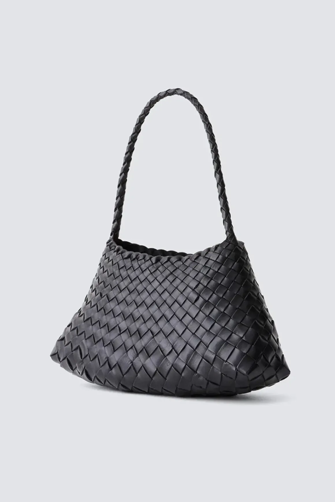 Vesken Rosanna fra Dragon Diffusion. Rosanna er en vevd skinnveske hvor det unike mønsteret av skinnremmer skaper en vakker, teksturert look som minner om den elskede Santa Croce-vesken fra samme merke. Vesken har en lett avsmalende silhuett og er en perfekt følgesvenn for både hverdagen og spesielle anledninger. Rosanna er en tidløs investering du kommer til å elske år etter år!