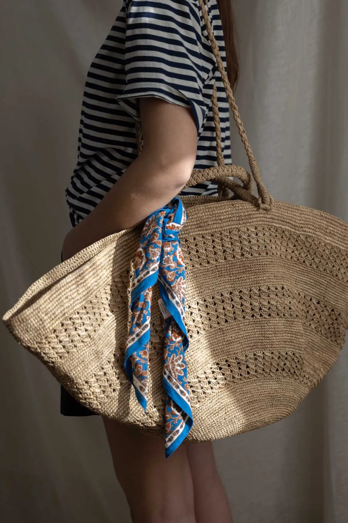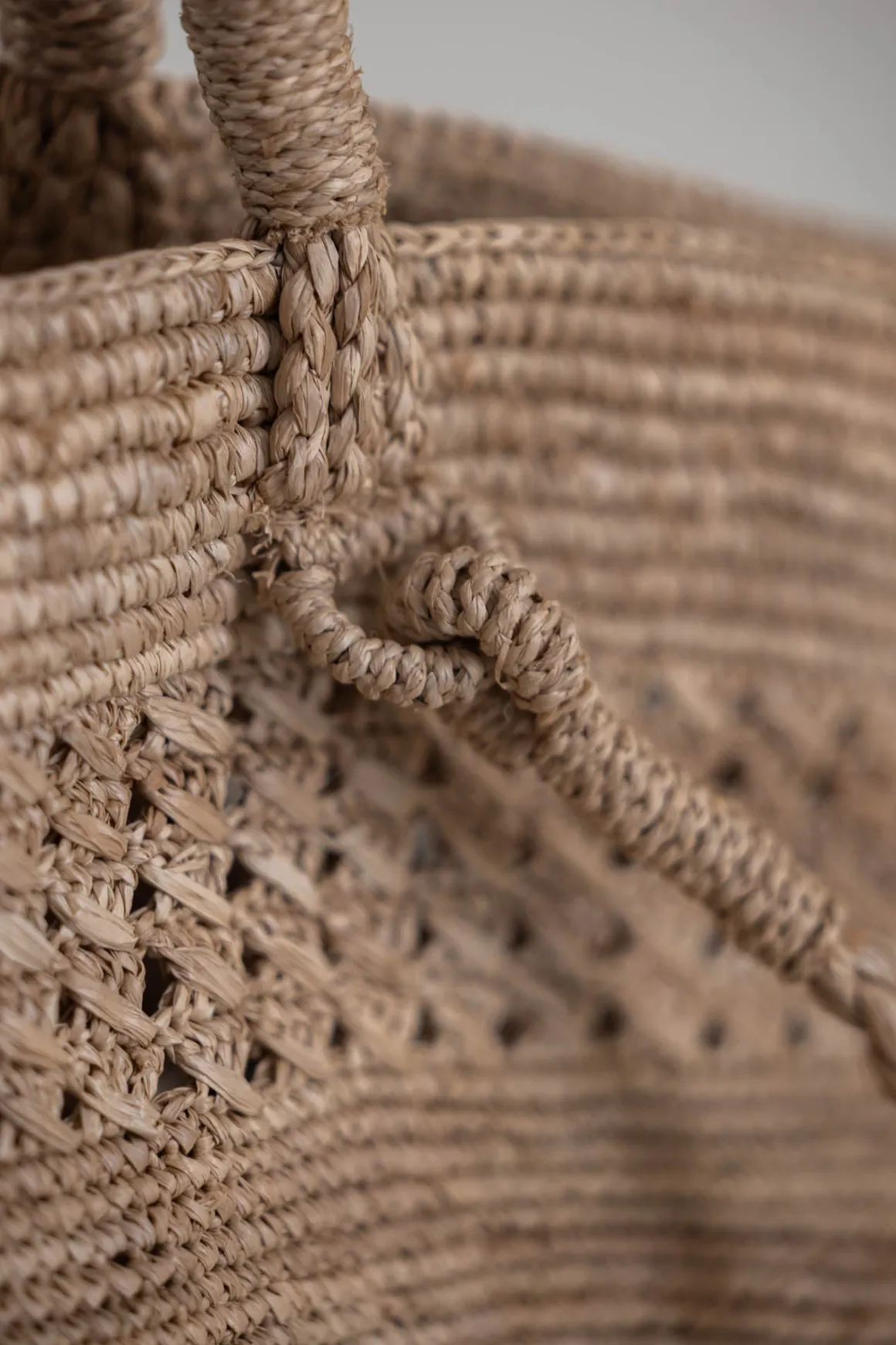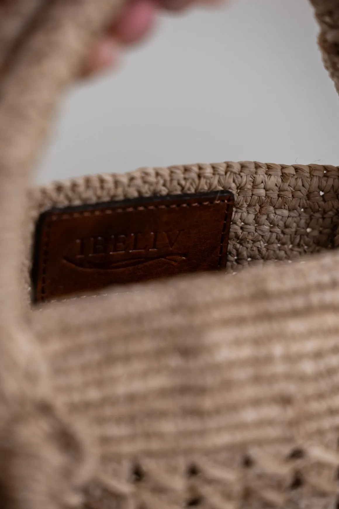 Sol-vesken fra Ibeliv er en håndlaget og romslig strandveske i naturraffia, inspirert av bohemsk stil og følelsen av frihet under åpen himmel. Den er heklet for hånd på Madagaskar og har en luftig konstruksjon med veksling mellom tett og åpen hekling som gir både styrke og særpreg. Vesken bæres enten i hånden eller over skulderen med flettede raffiahåndtak som former seg etter kroppen og gjør den behagelig å ha med seg. Den lette og fleksible formen gir god plass til alt du trenger på sommerdager – enten du skal til stranden eller rusle rundt i byen. Hver veske er unik og bærer preg av den som har laget den, og naturmaterialene gjør at den bare blir finere med tiden. Sol er en hyllest til lyse dager og det enkle, og er laget for å følge deg i hverdagen.