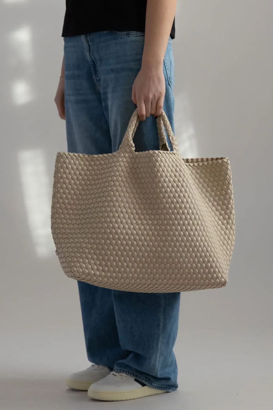 Lett og romslig; St. Barths Large Tote er laget av håndvevd neopren. Naghedi som merkevare drives av etisk og bærekraftig praksis. Merket bruker toppmoderne stoffer i produksjonen av veskene sine. Stoffene er holdbare og lette å vedlikeholde. Veskene er individuelt håndhevd av dyktige vevere. Vesken rommer det du måtte trenge av nødvendigheter. Det medfølger en pung for oppbevaring av mindre gjenstander. Dette er en allsidig veske som kan bæres gjennom alle sesongene.