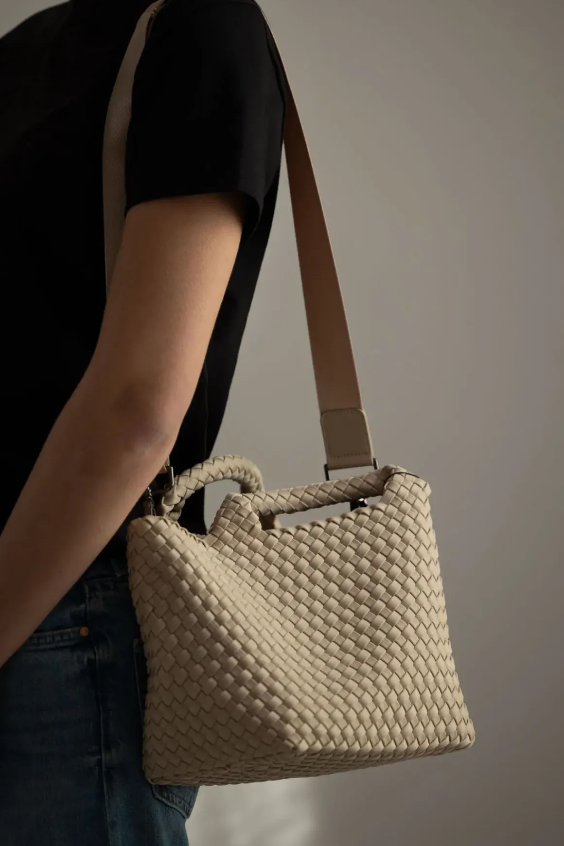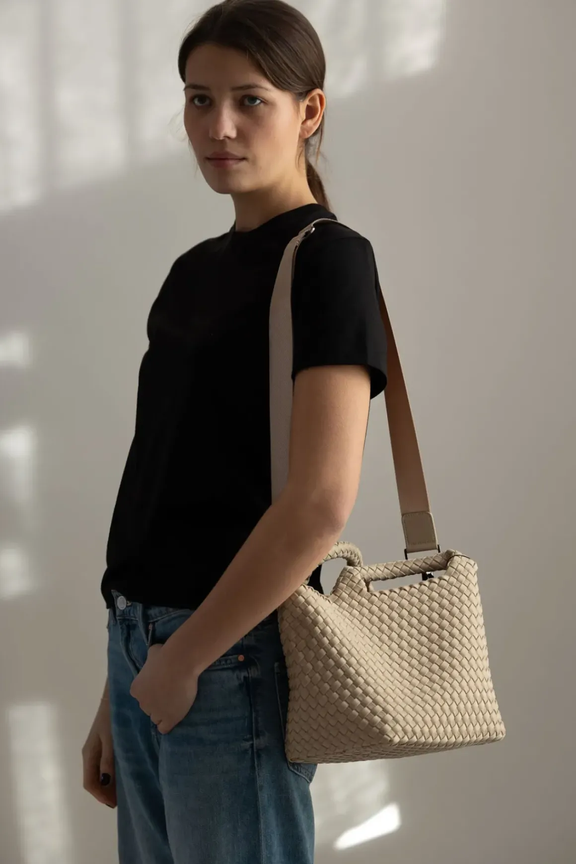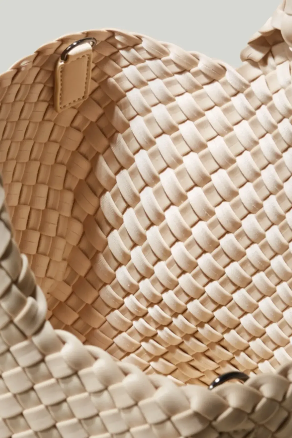 Lett og romslig; St. Barths Small Tote er laget av håndvevd neopren. Naghedi som merkevare drives av etisk og bærekraftig praksis. Merket bruker toppmoderne stoffer i produksjonen av veskene sine. Stoffene er holdbare og lette å vedlikeholde. Veskene er individuelt håndhevd av dyktige vevere. Vesken rommer det du måtte trenge av nødvendigheter. Det medfølger en pung for oppbevaring av mindre gjenstander i tillegg til en justerbar skulderstropp. Dette er en allsidig veske som kan bæres gjennom alle sesongene.
