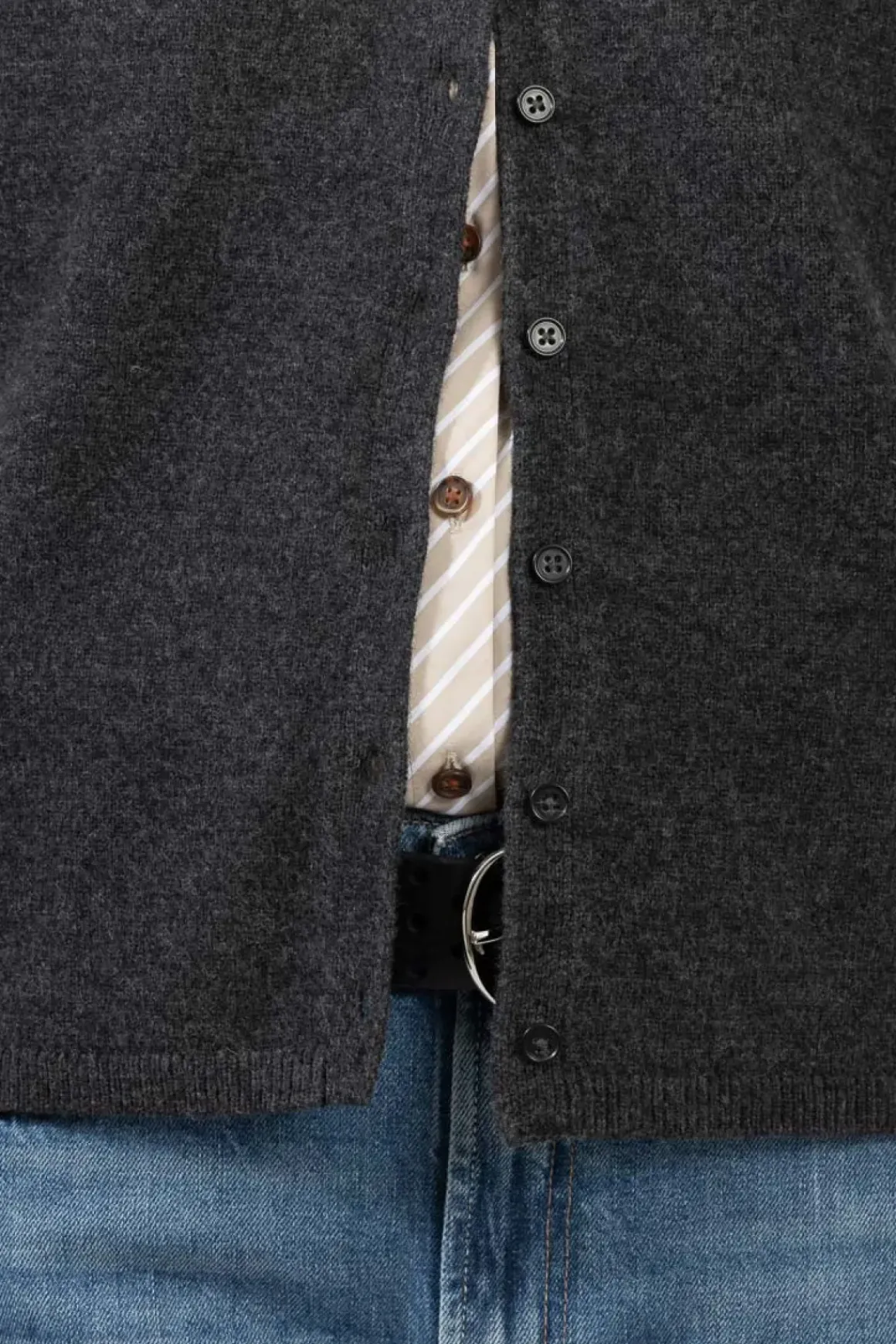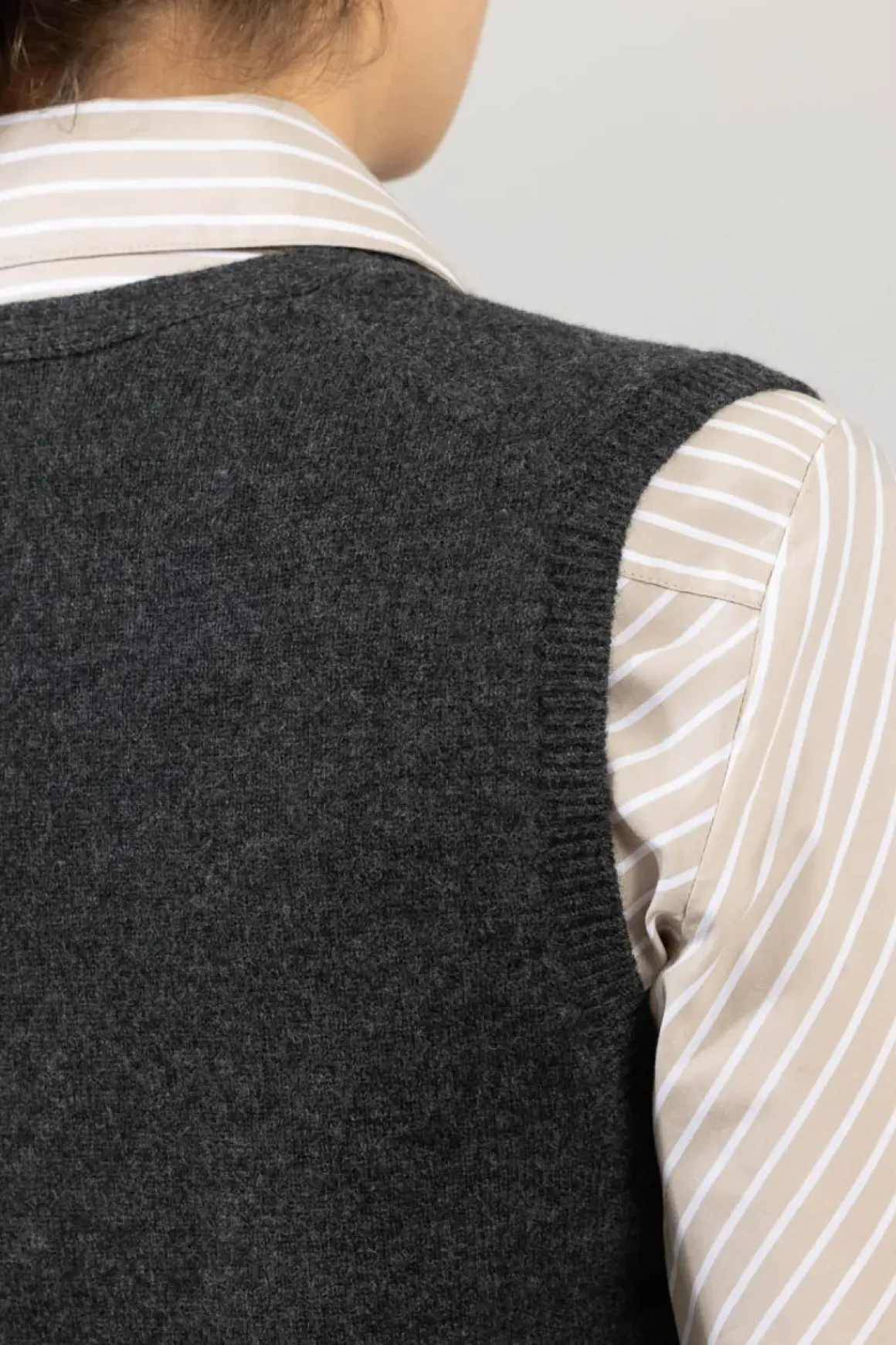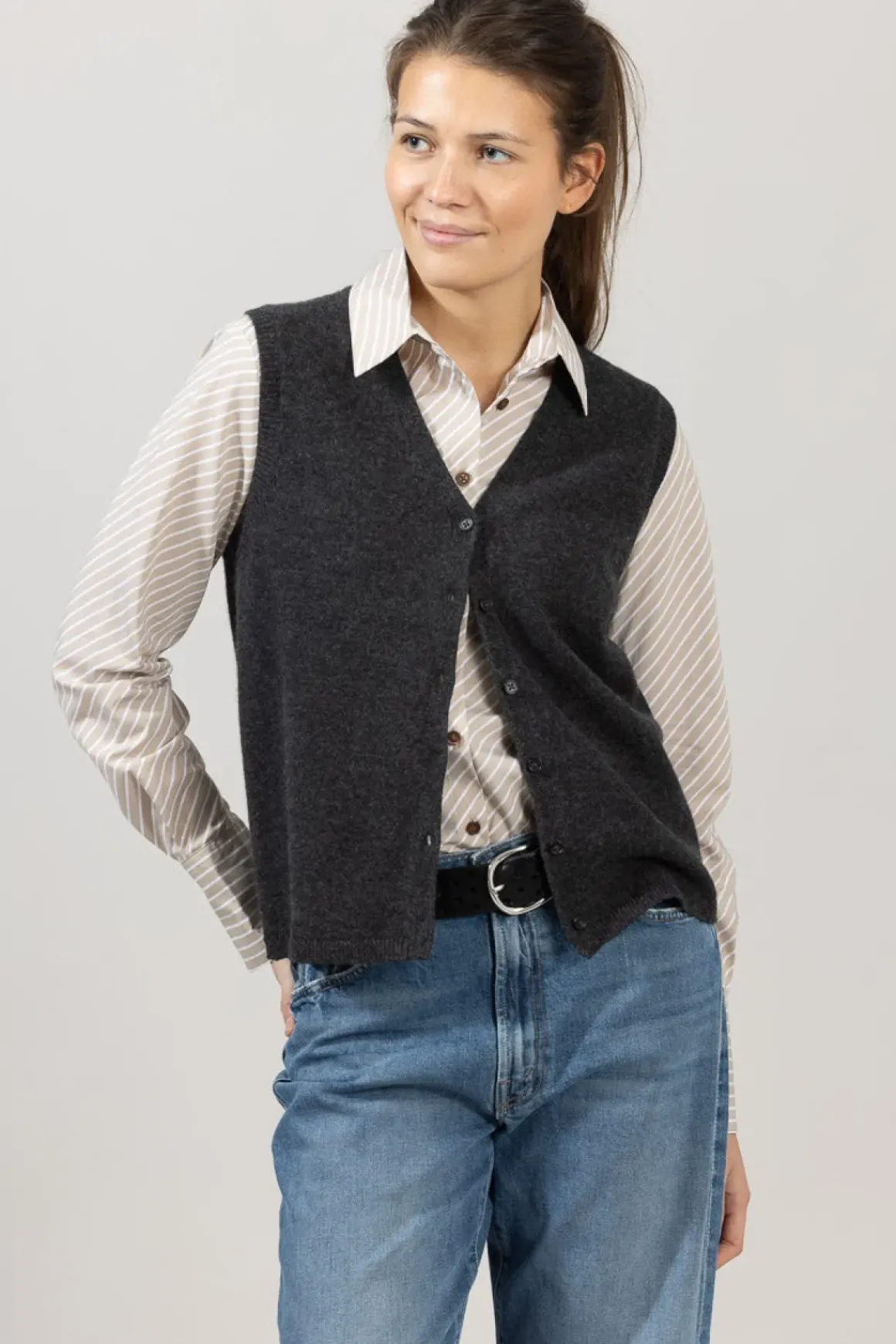 Charles-vesten fra Fall Winter Spring Summer er en tidløs og luksuriøs vest i 100% ekstra fin merinoull som føles behagelig mot huden. Den myke, børstede teksturen gir en diskret dybde, og med sitt minimalistiske design passer den perfekt til både hverdagsbruk og mer formelle anledninger. Vesten har V-hals, tynne ribbekanter og en klassisk knappelukking foran som gir en ren avslutning. Bruk den over en skjorte for en sofistikert lag-på-lag-look, eller kombiner den med en tynn genser på kjølige dager for ekstra varme.