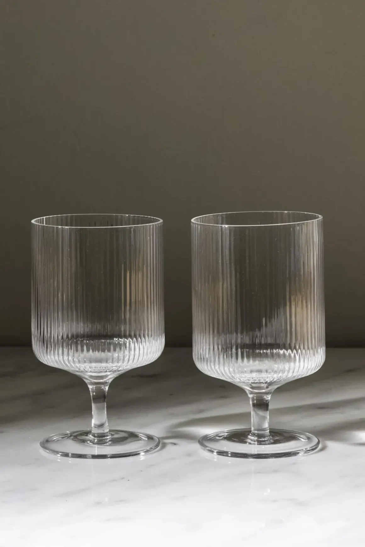 Sett med 2 Ripple Vinglass fra Ferm Living. Vinglassene har et unikt geometrisk uttrykk og er håndblåste. Glassene har en flott siluett og kan stables med hverandre. Perfekte til en uformell drink, middagsfest eller brunch. Bruk sammen med resten av Ripple-serien, og server favorittdrinken din med stil.